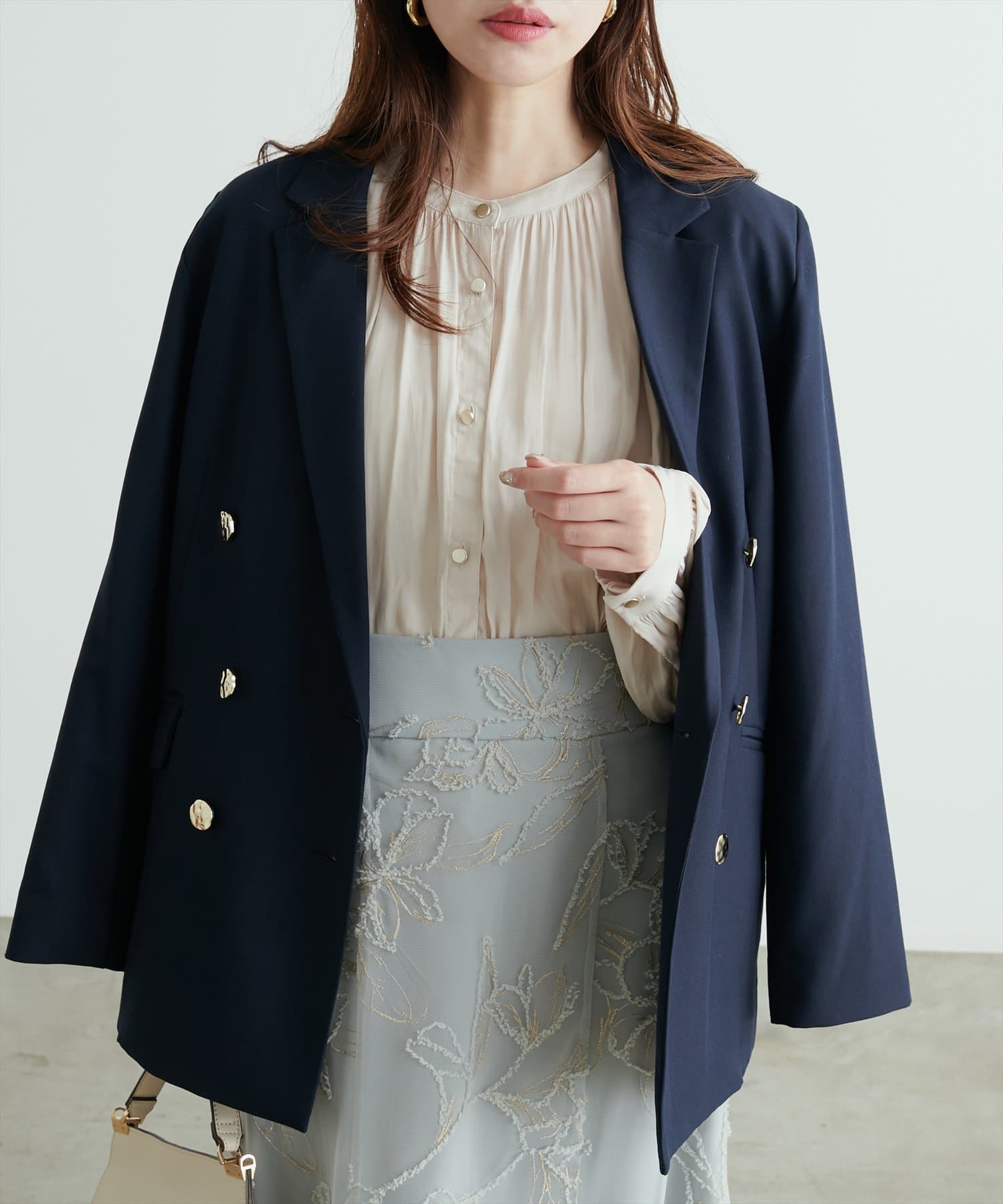 胸元には金ボタンをあしらい高級感あふれる印象に仕上げました。