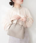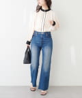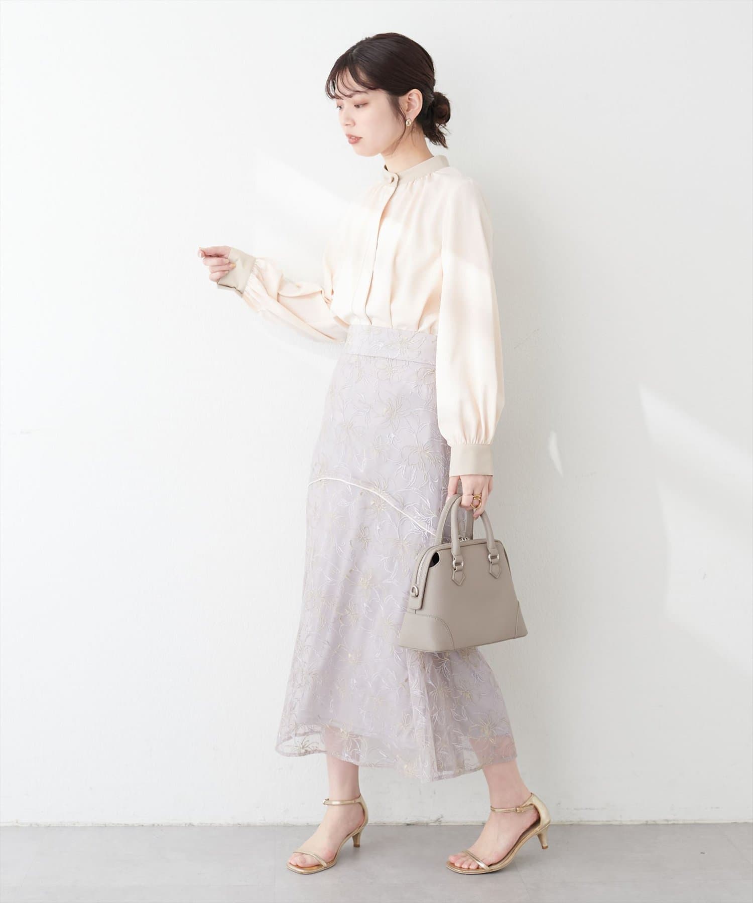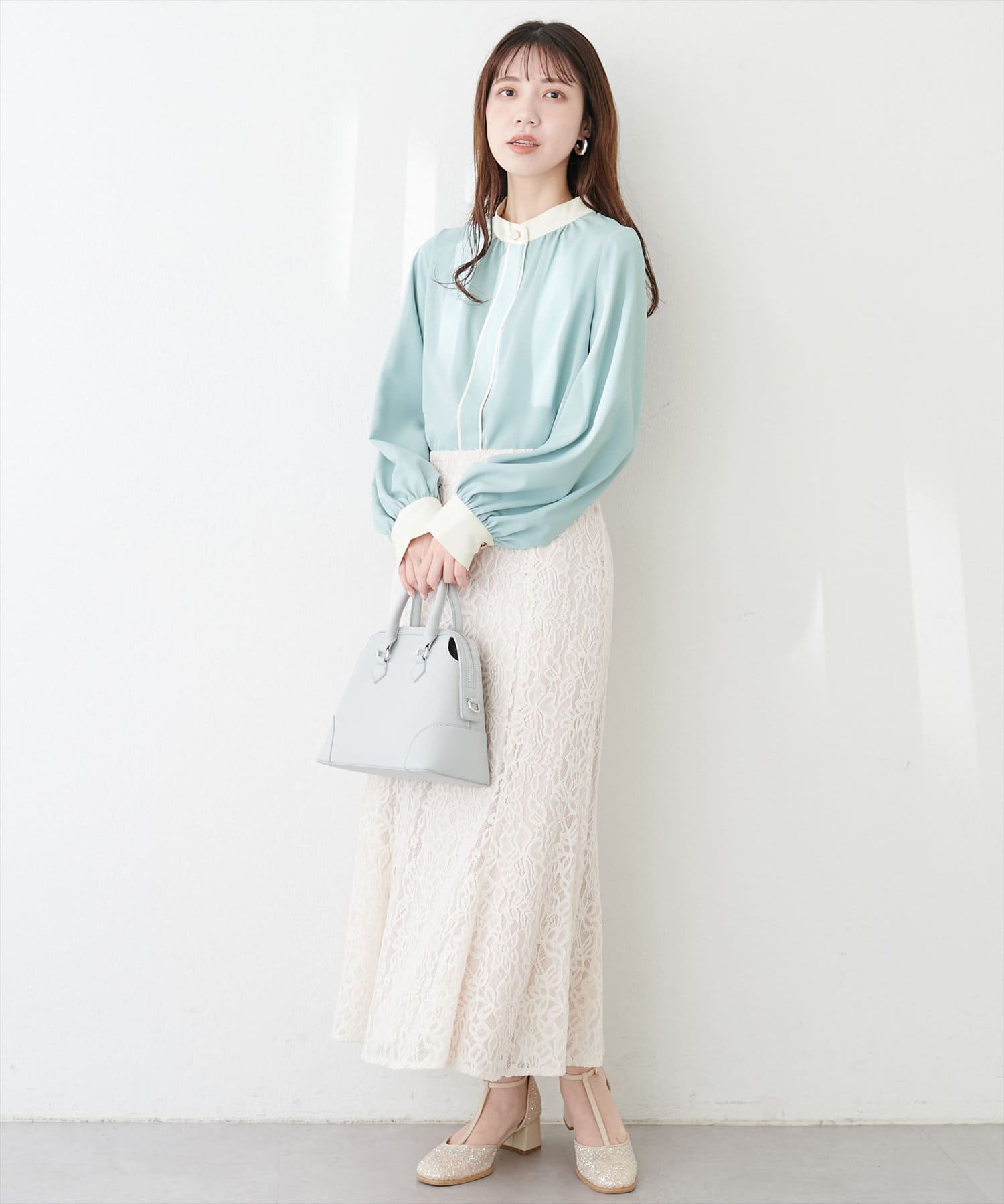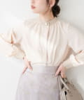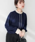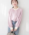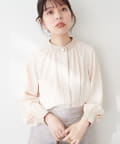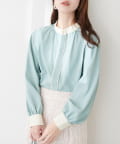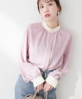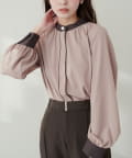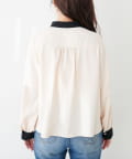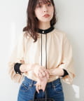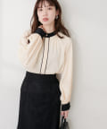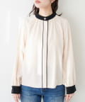 華やかで女性らしい雰囲気と配色のトリミングをアクセントにメリハリをつけたフェミニンブラウス。