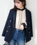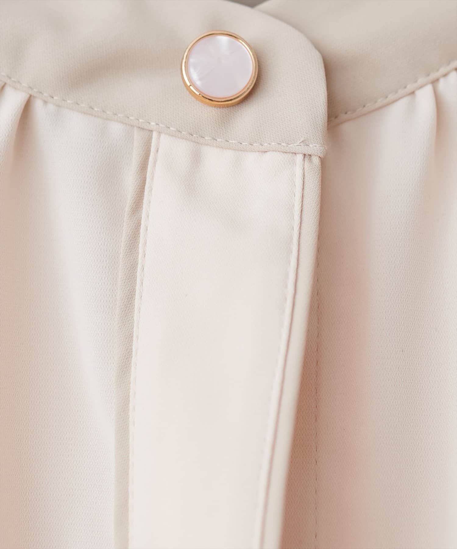 シェル素材とゴールドを組み合わせた上品な印象の釦を襟元と袖口に施し、