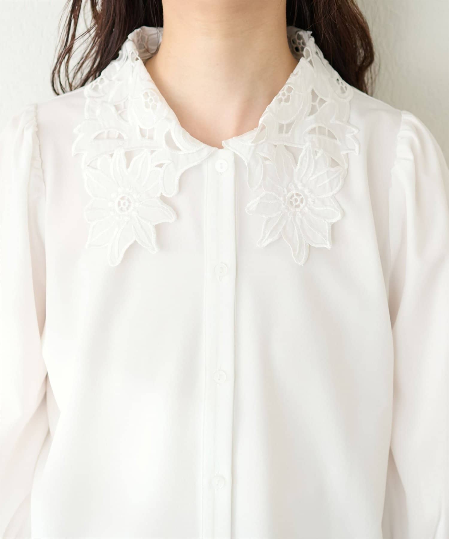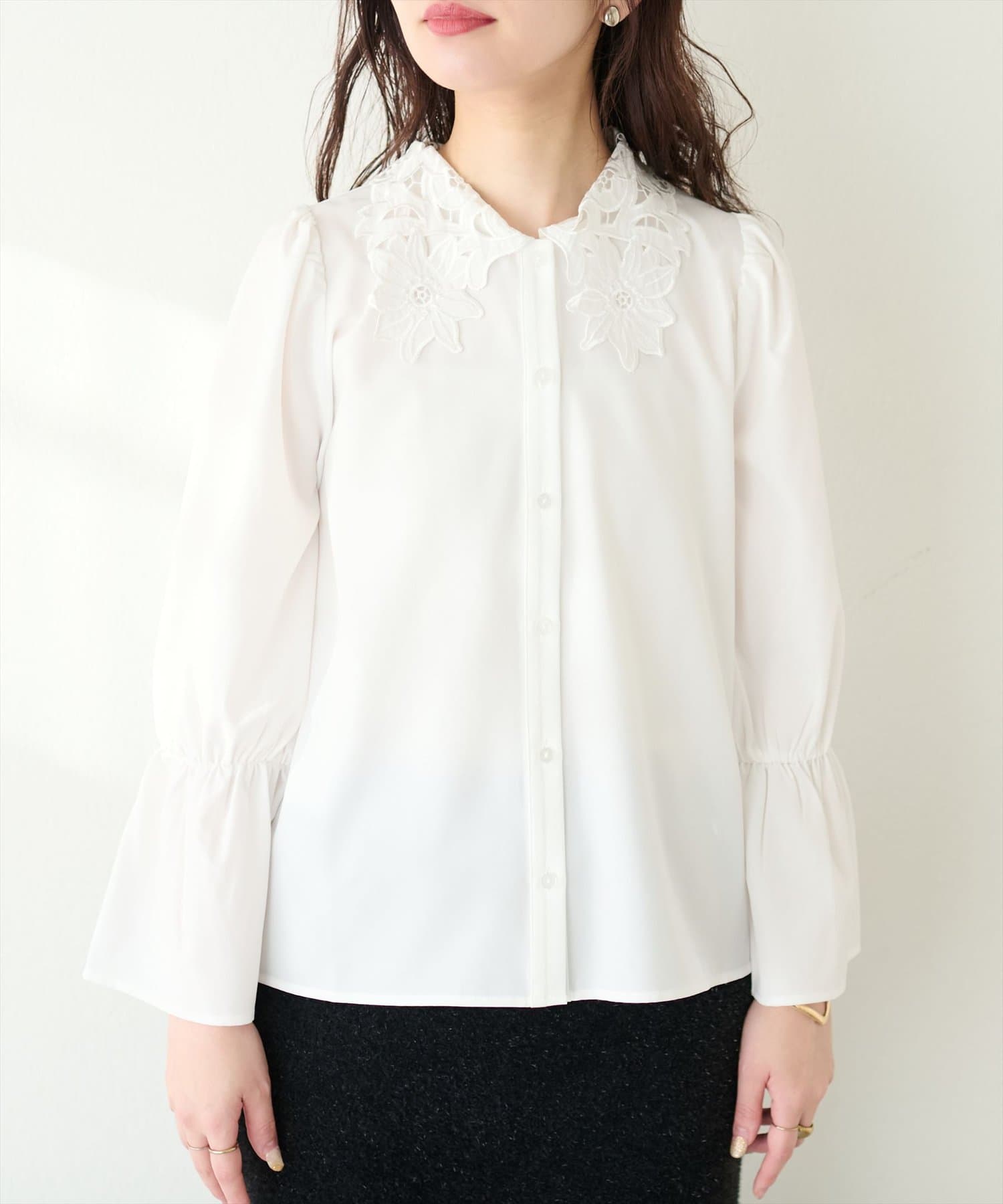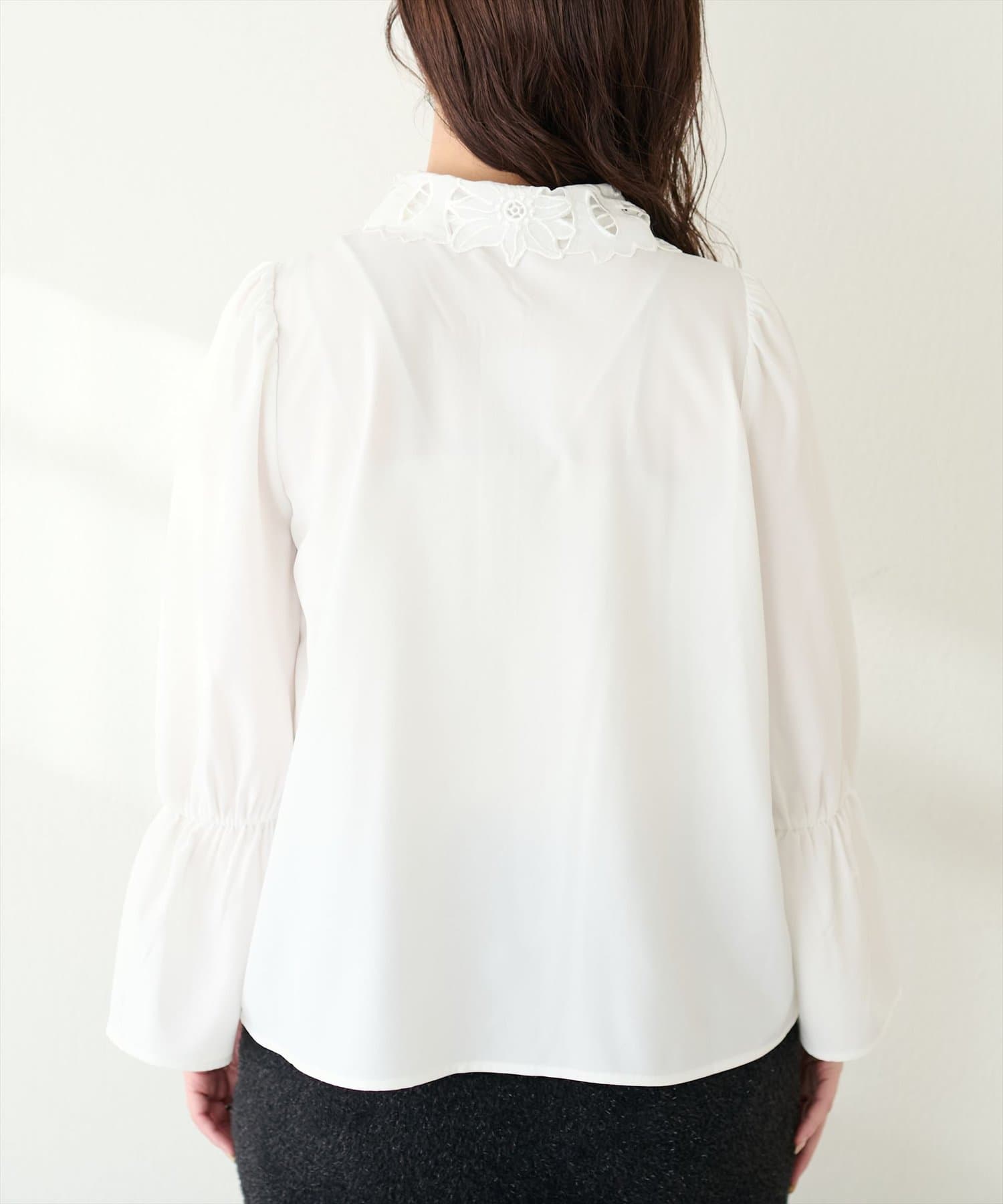 大き目の花柄レース生地の衿が大人上品なブラウス。