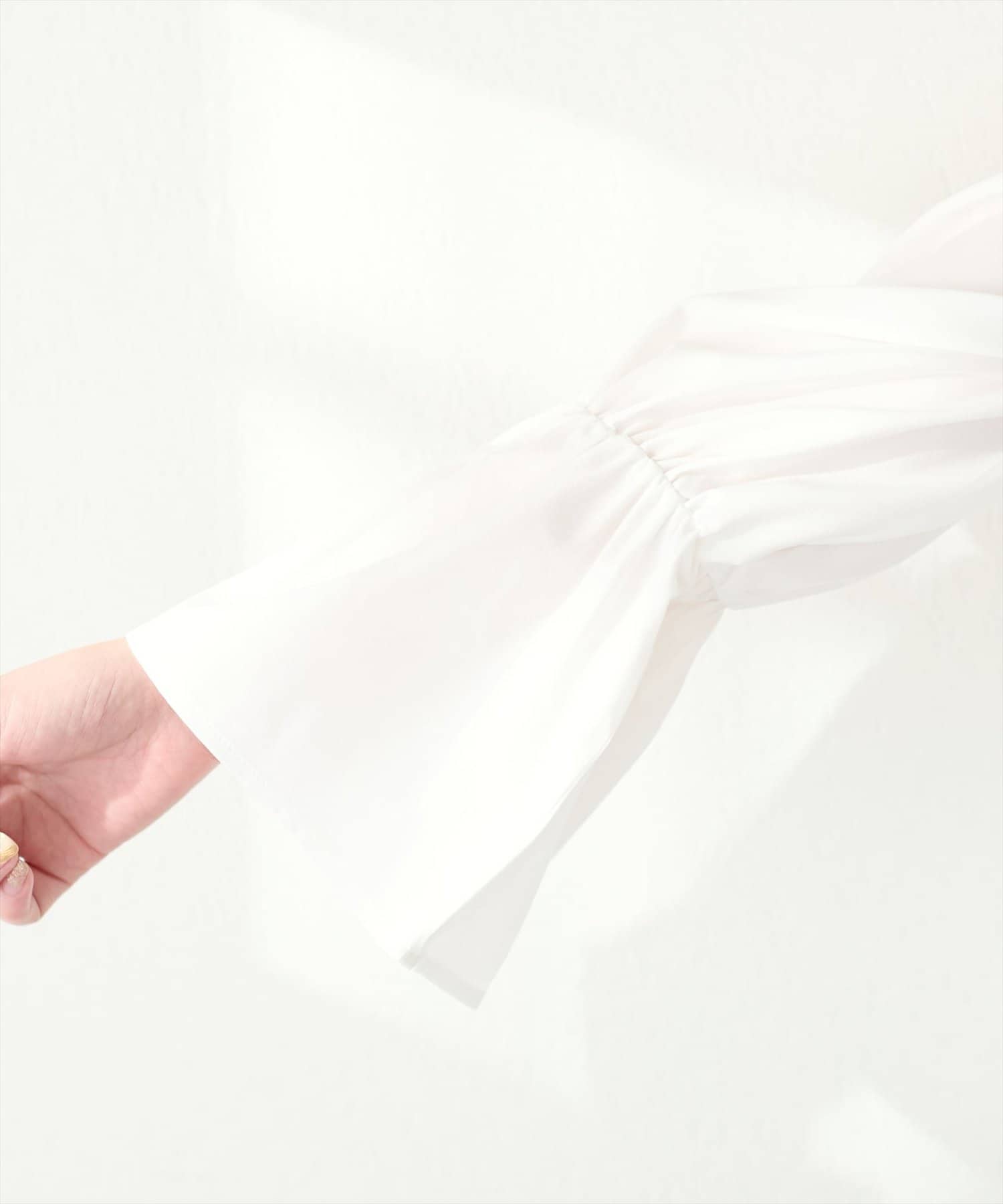 袖はたっぷりとしたキャンディスリーブに、肩にはさり気ないギャザーを施し、細部までこだわった1枚です。
