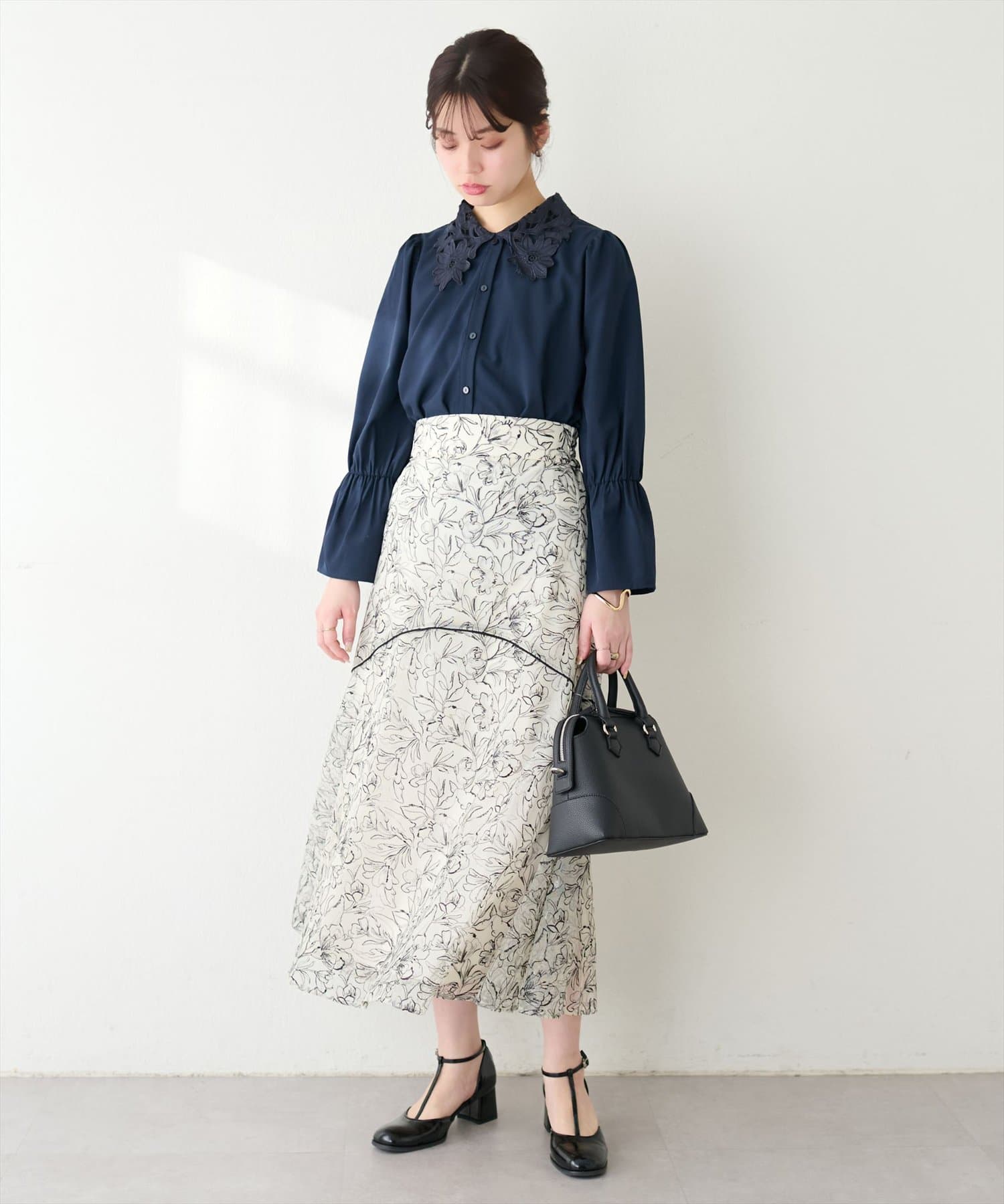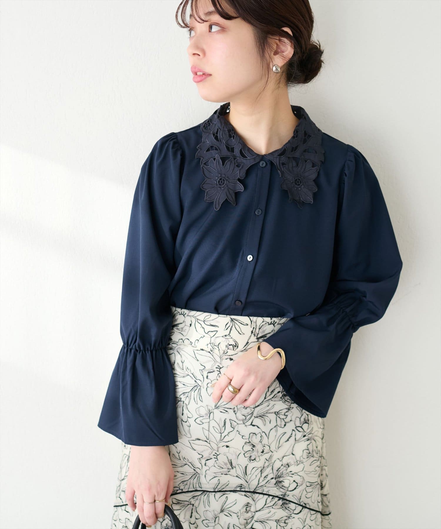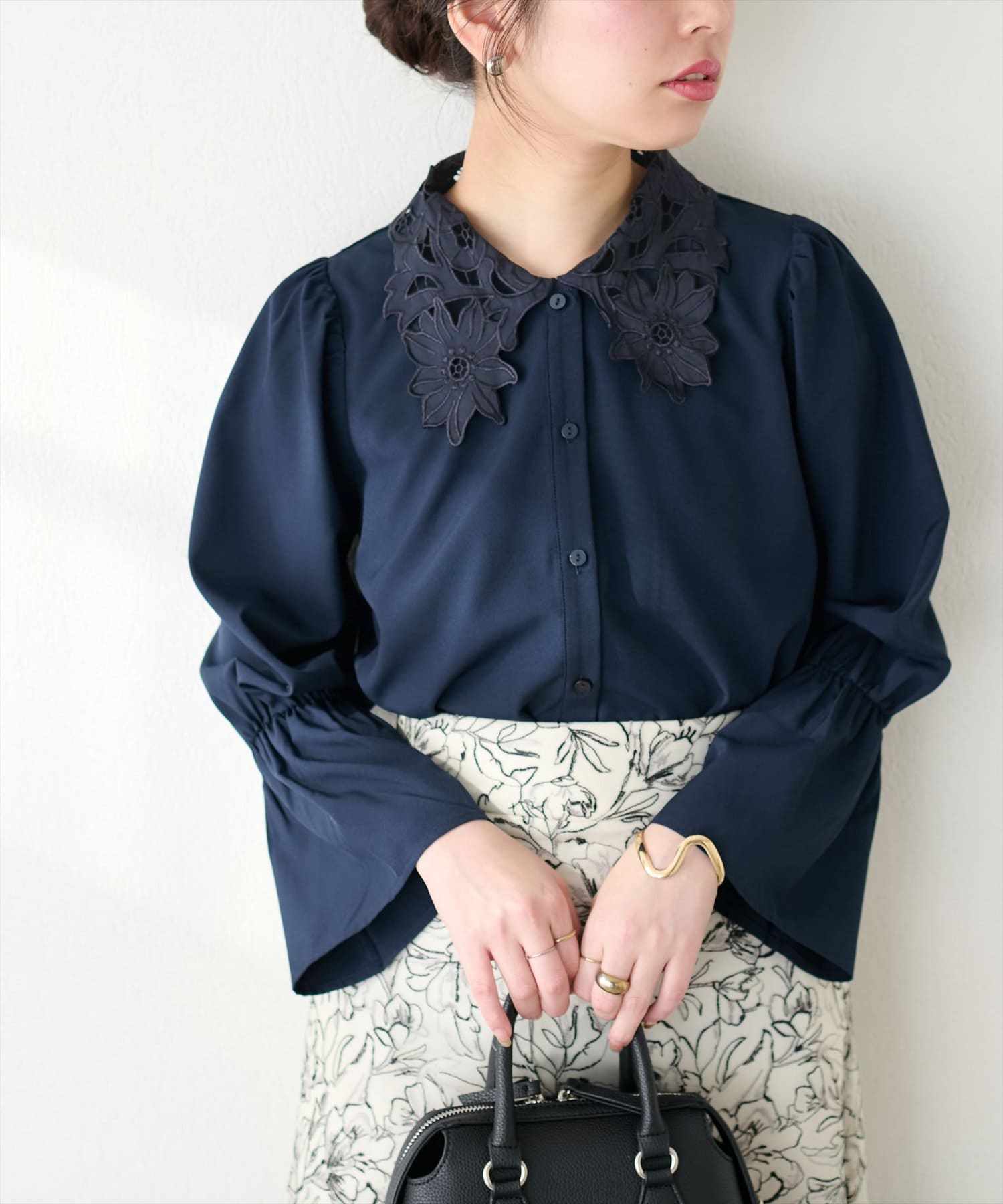 1枚で主役級のブラウスなので、シンプルなボトムスと合わせるだけでコーディネートが完成します。