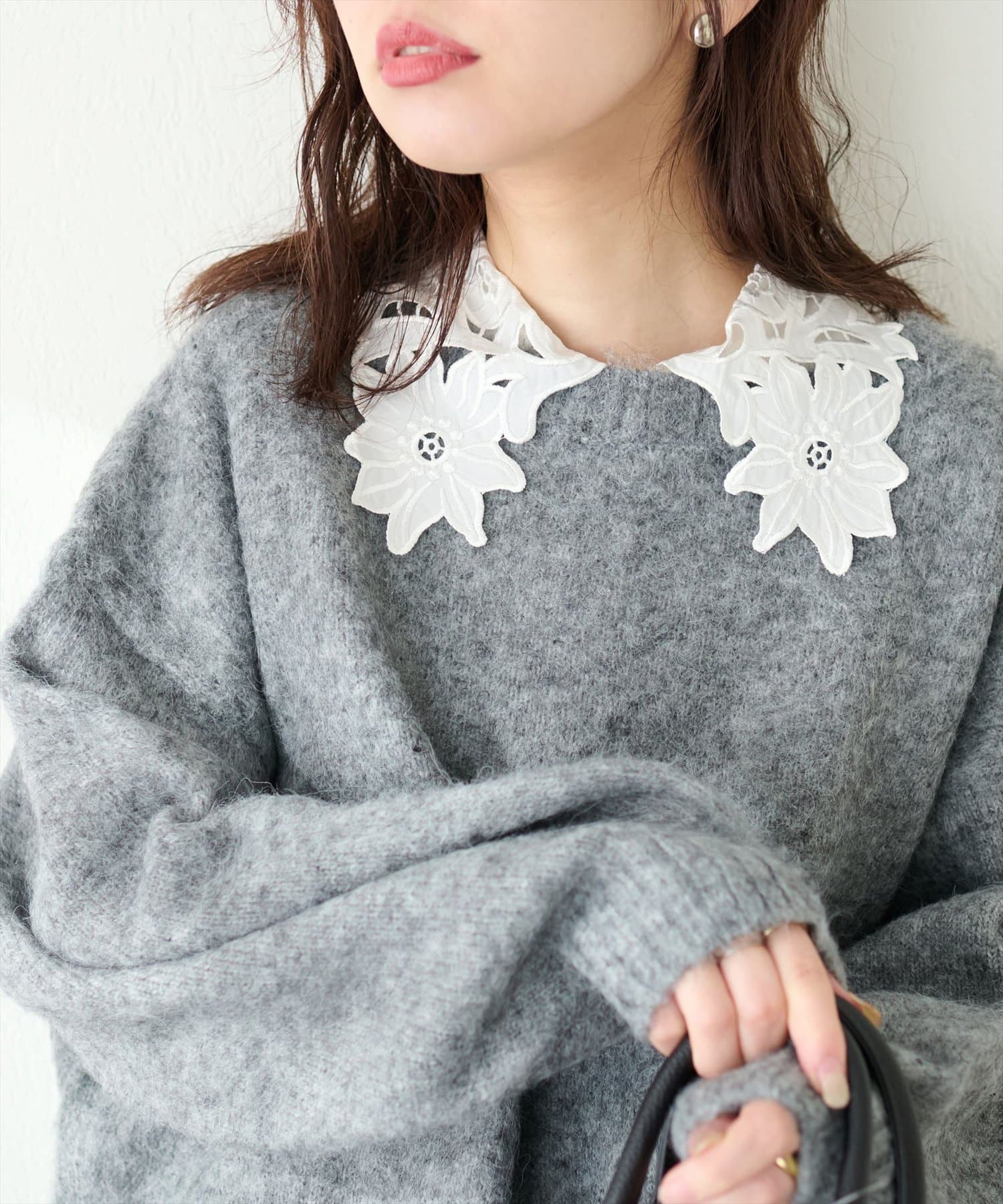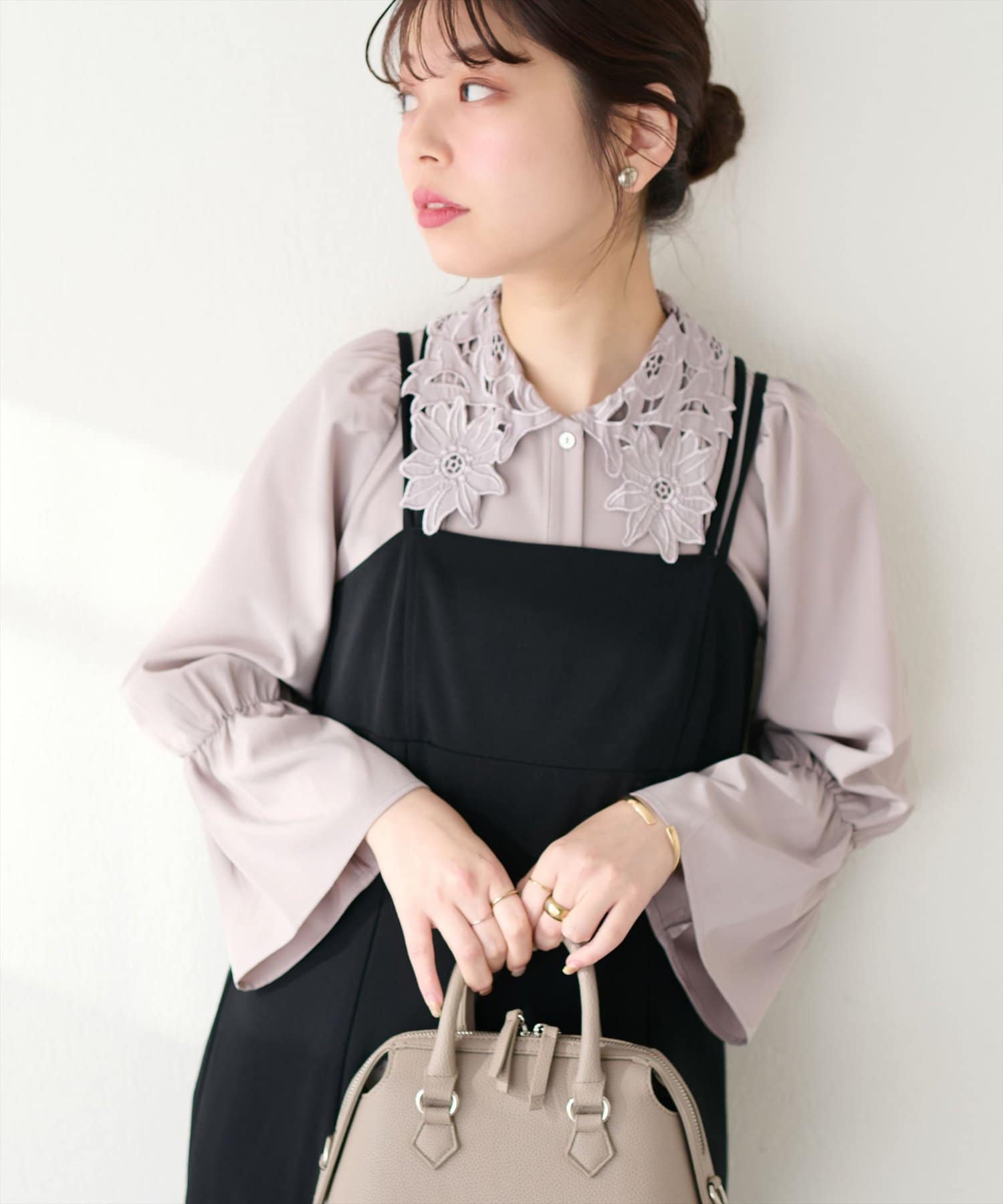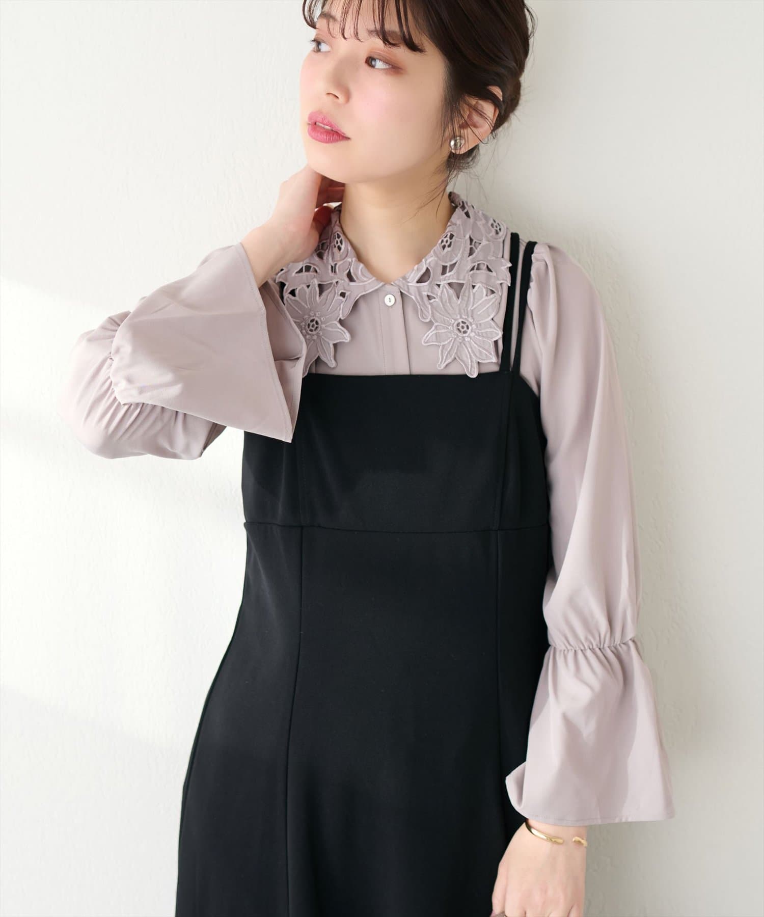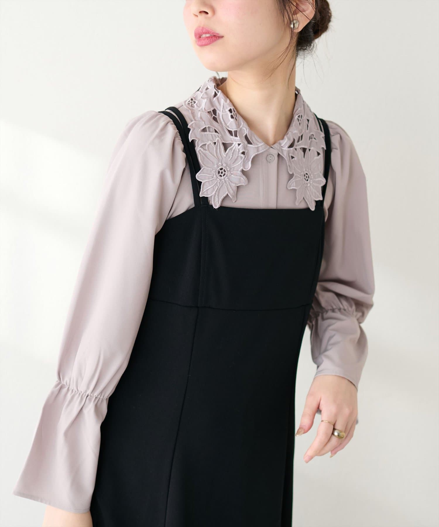 存在感のあるレース衿に合わせて、落ち感のある素材で仕立てて大人の雰囲気を演出しました。