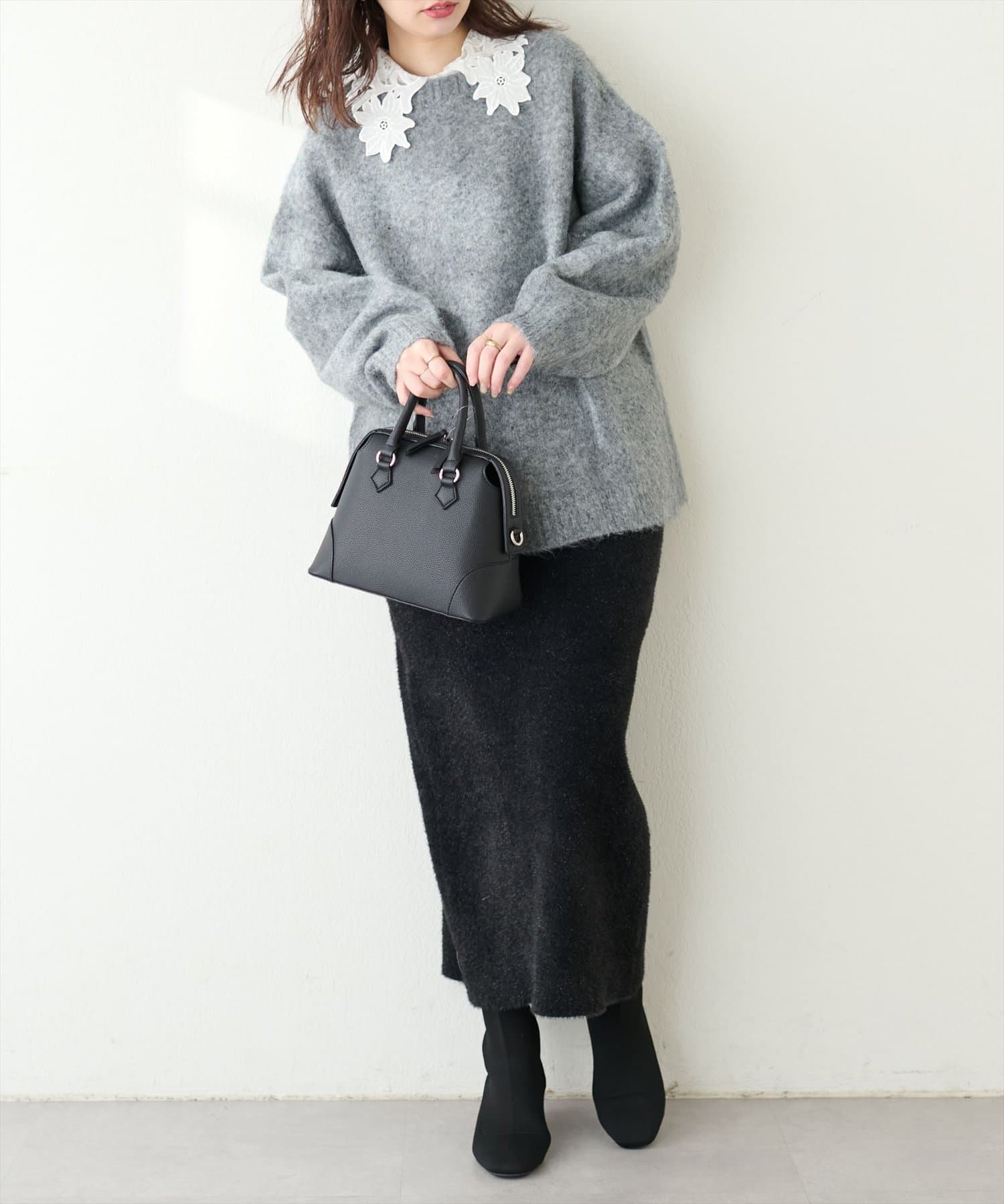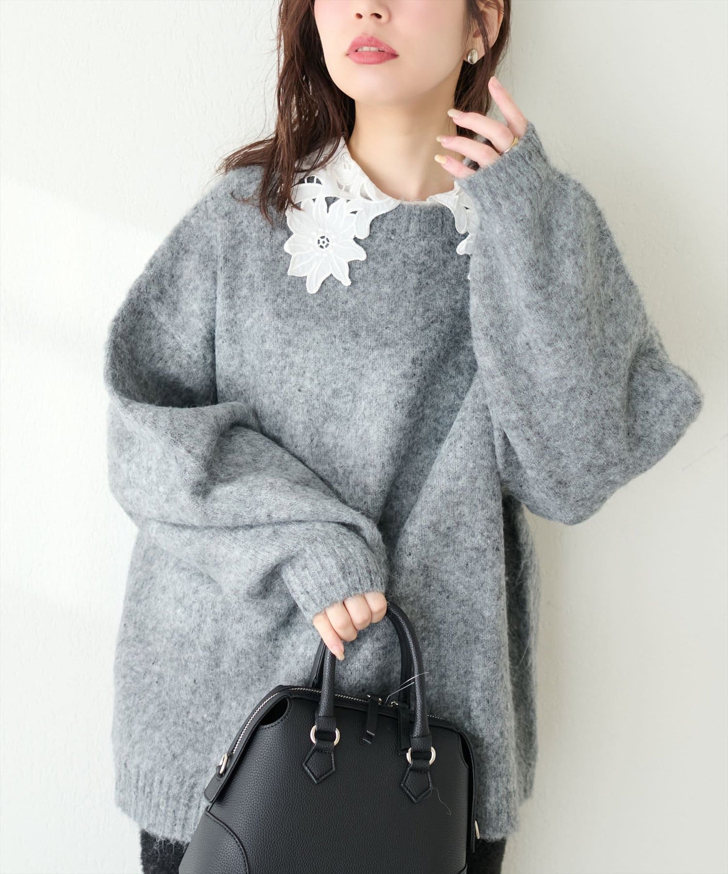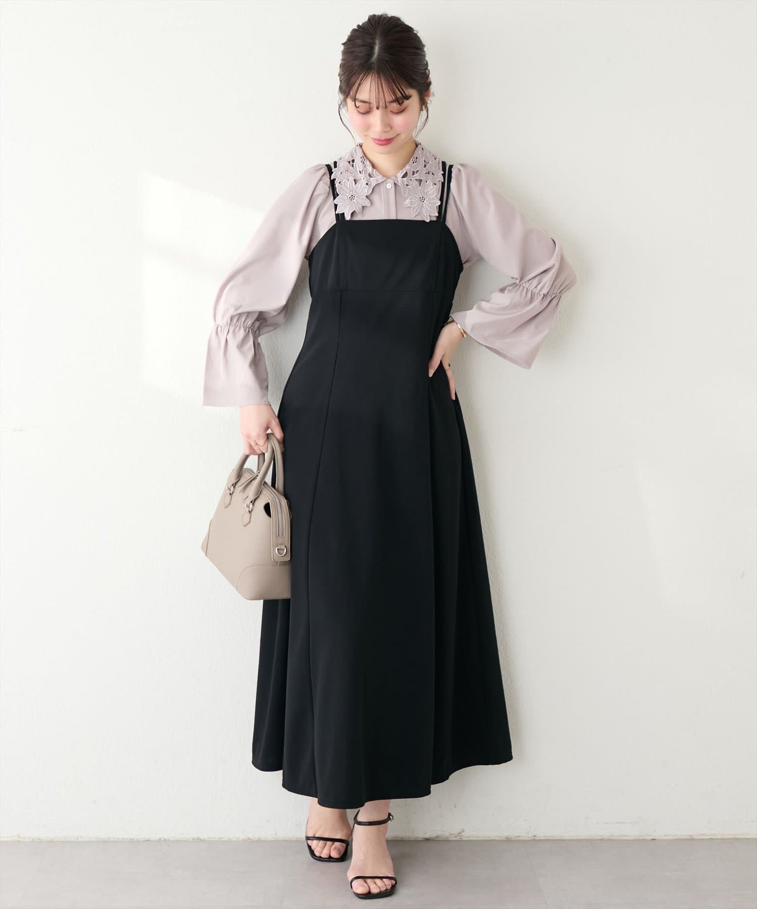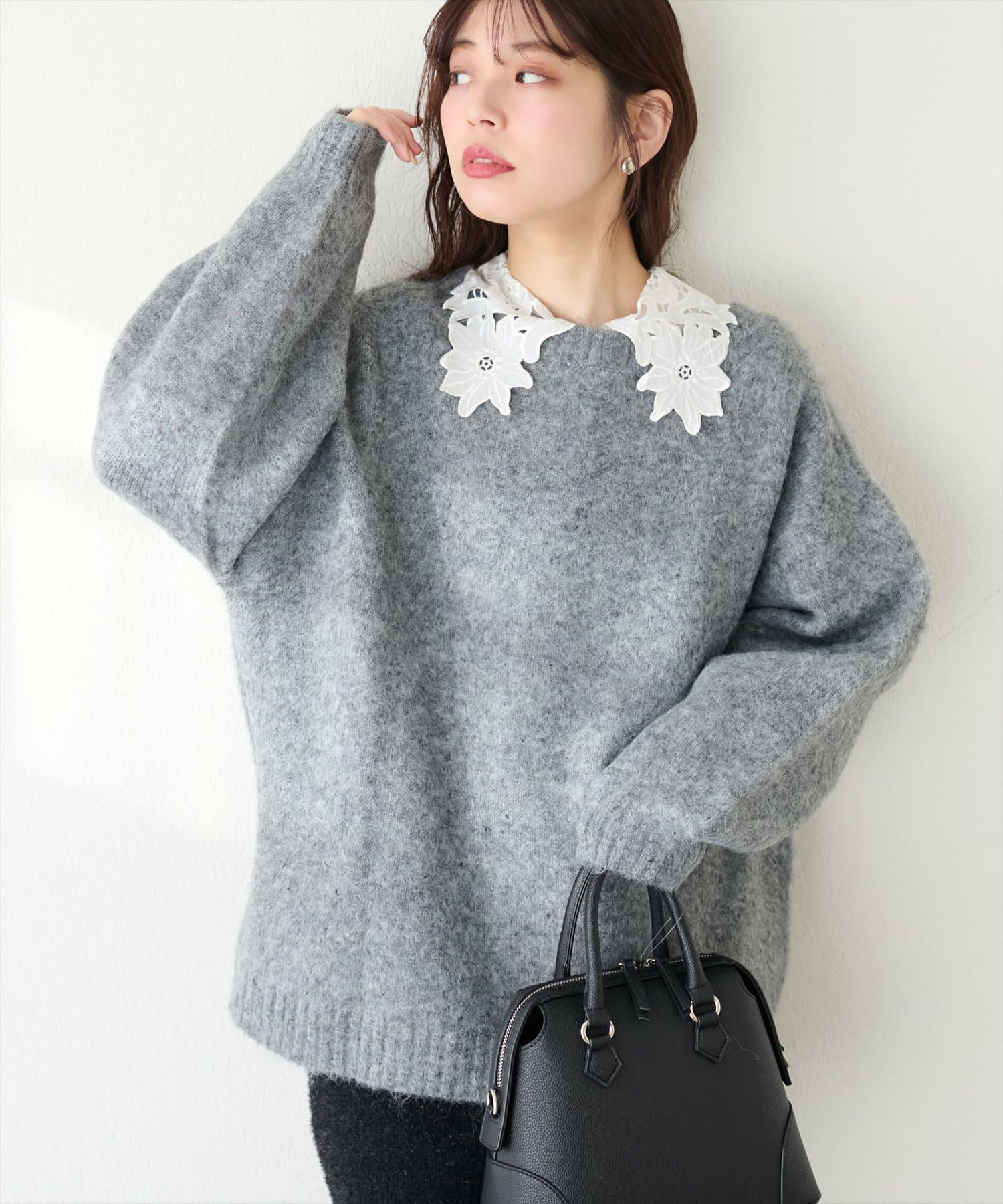 存在感のあるレース衿に合わせて、落ち感のある素材で仕立てて大人の雰囲気を演出しました。