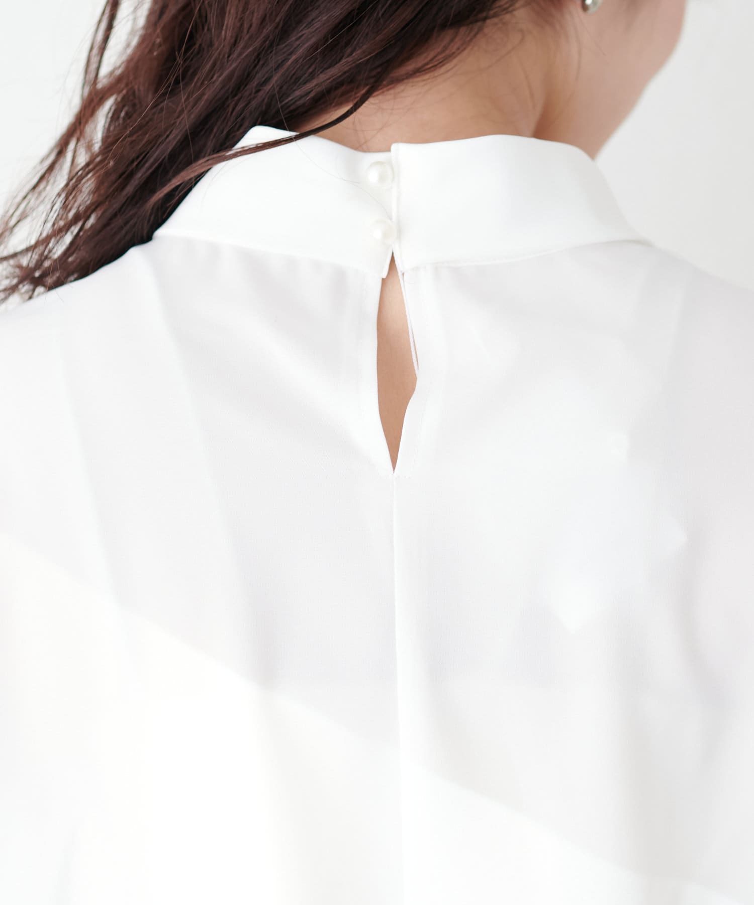 ネック後ろにパールのボタンが2つついており、アップヘアにした時にさりげない華やかを演出します。