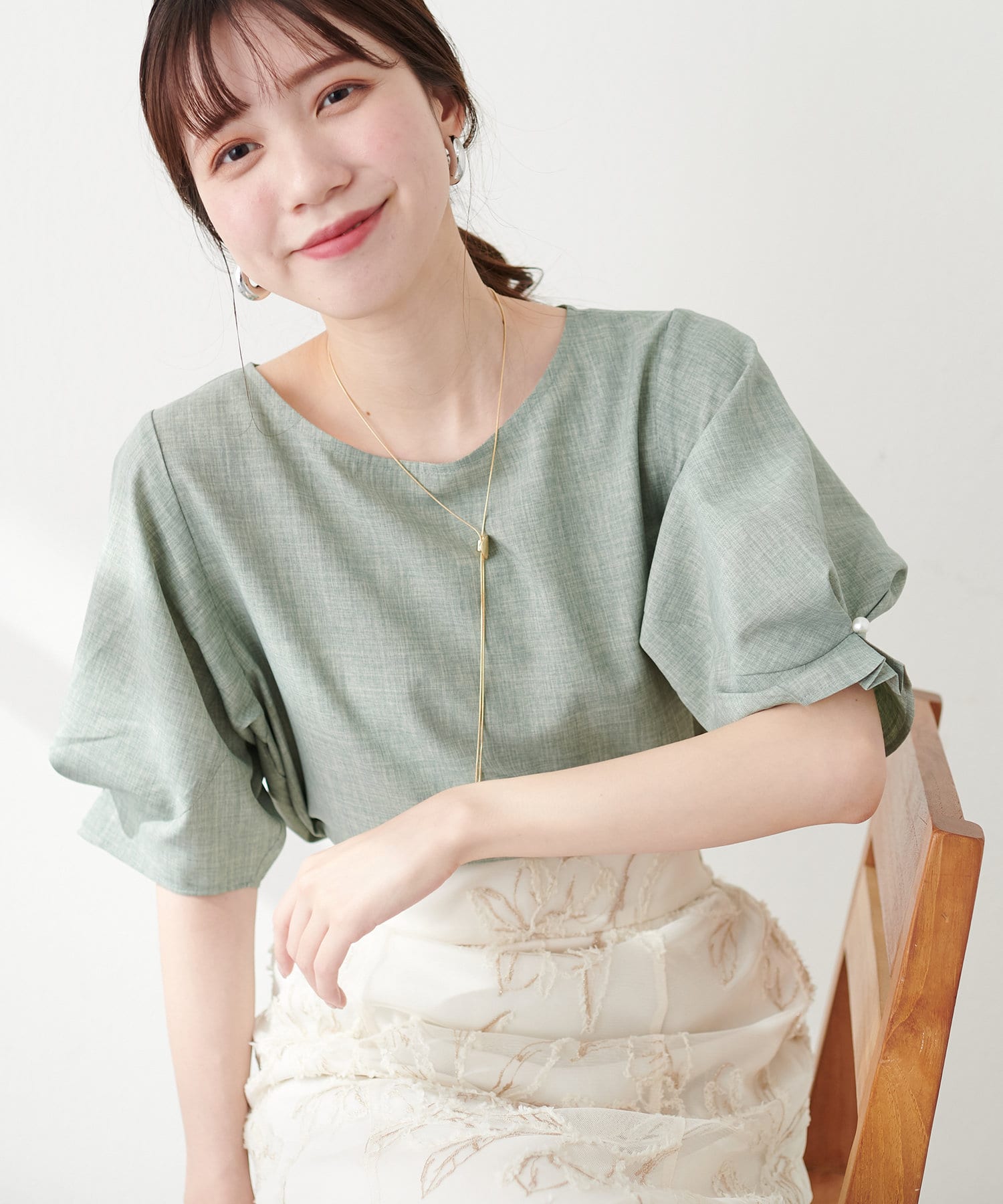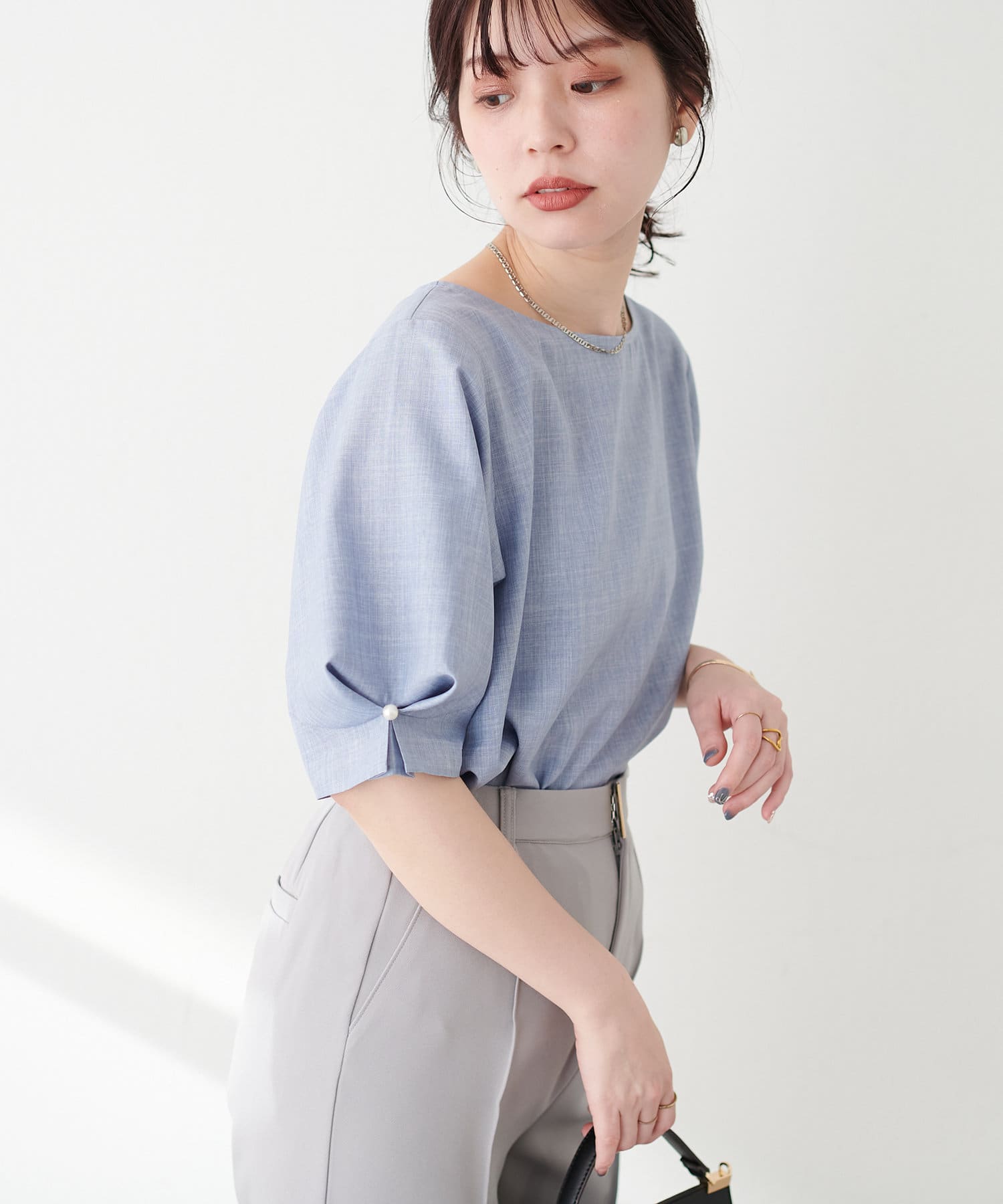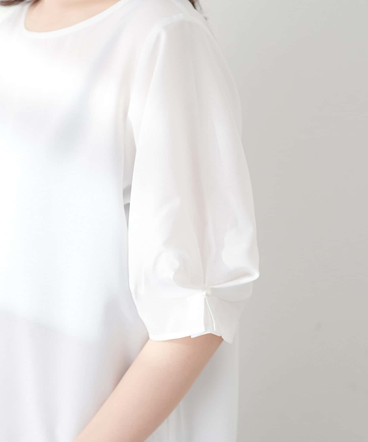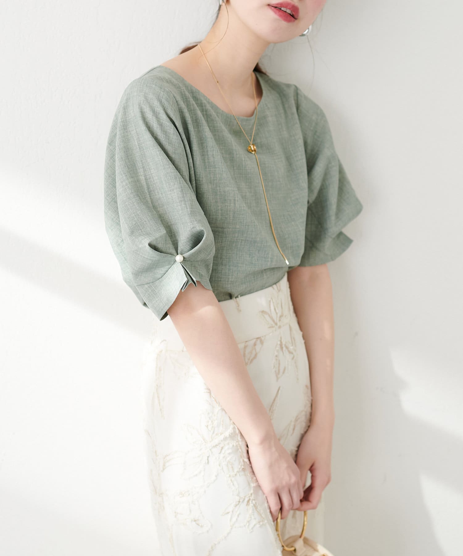 袖のタックとパール使いがフェミニンな1枚