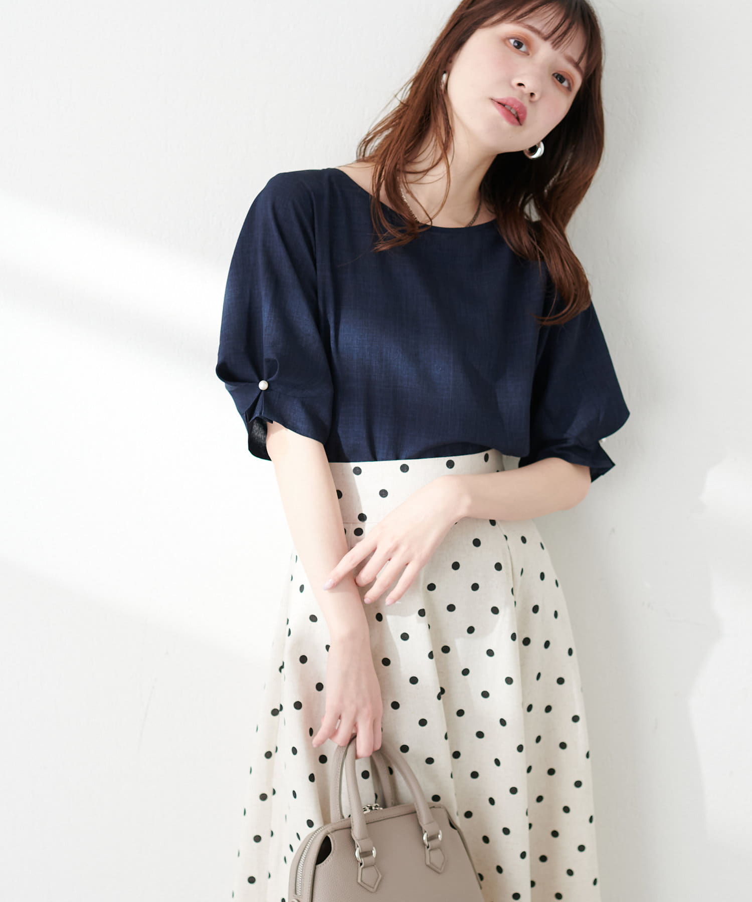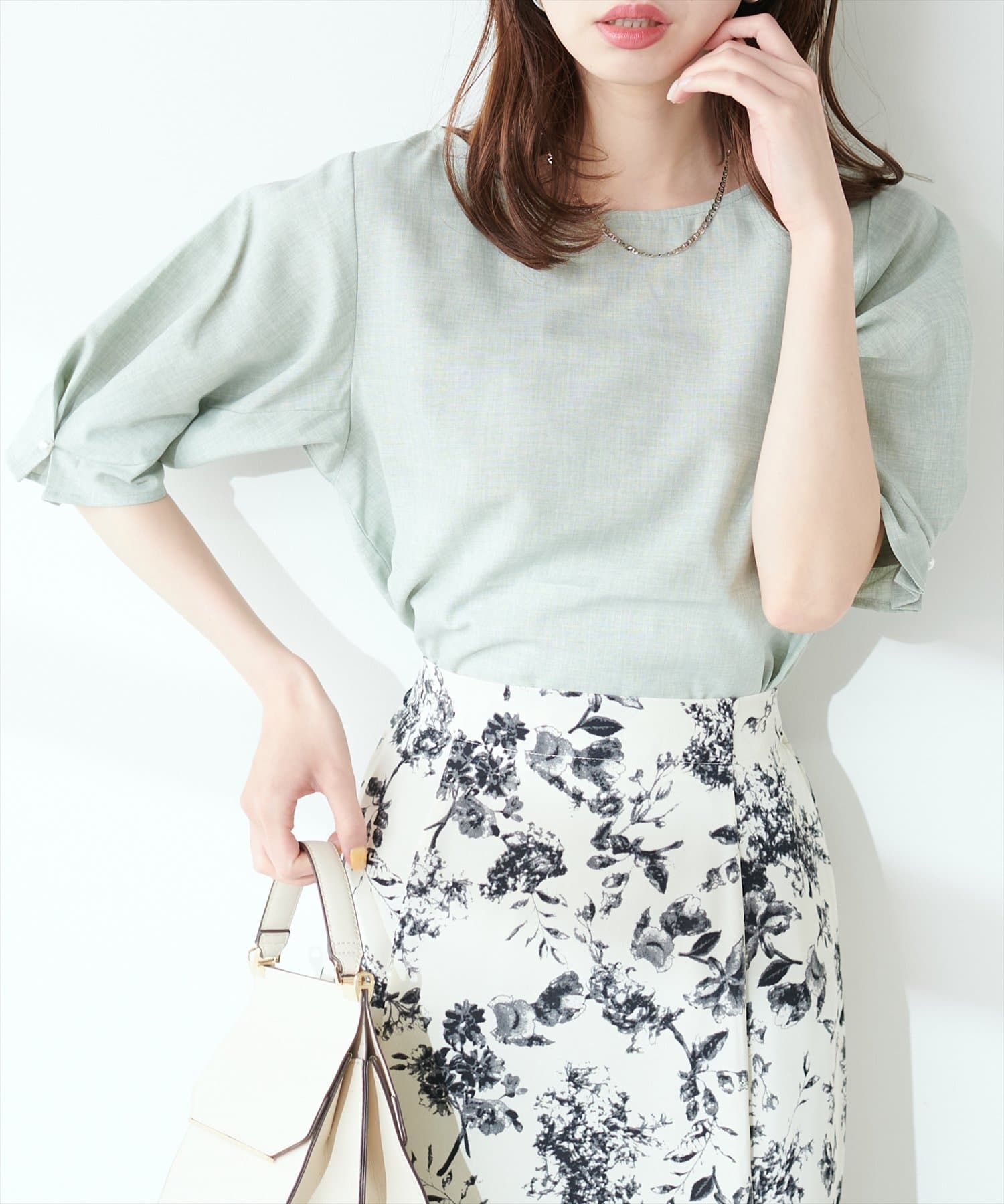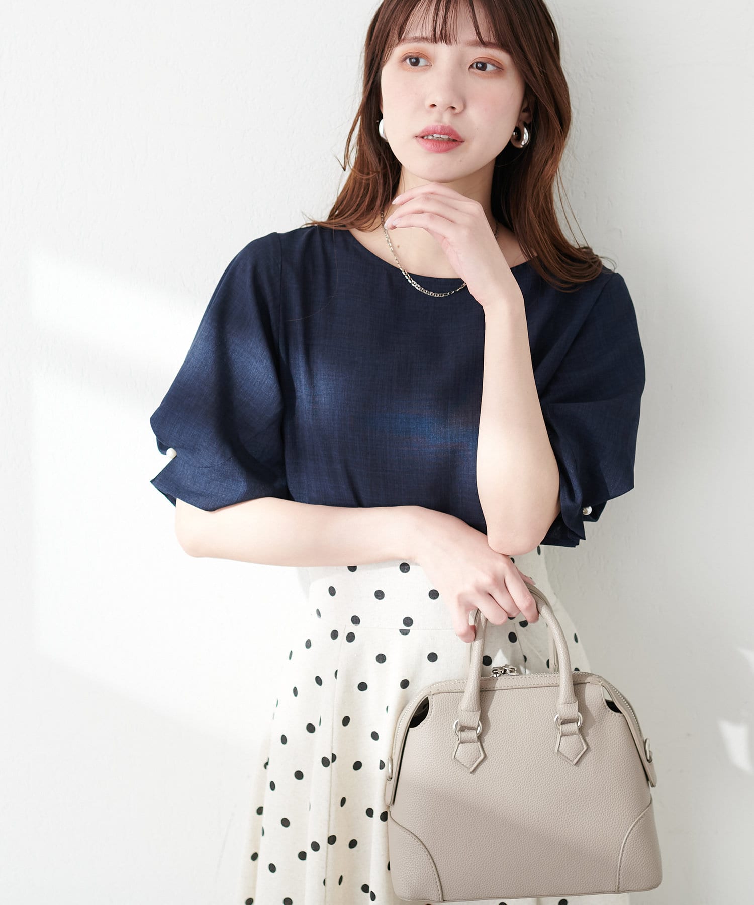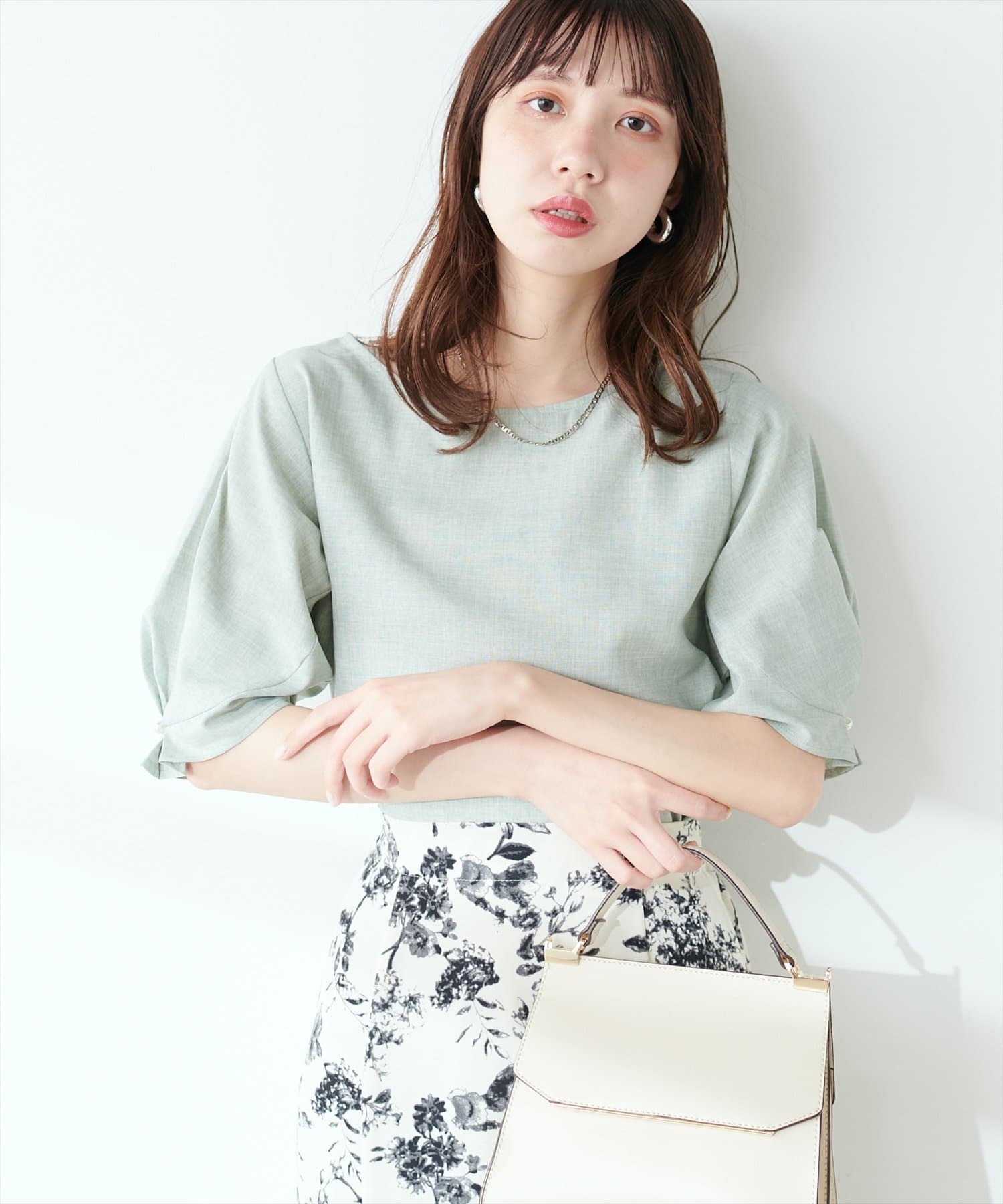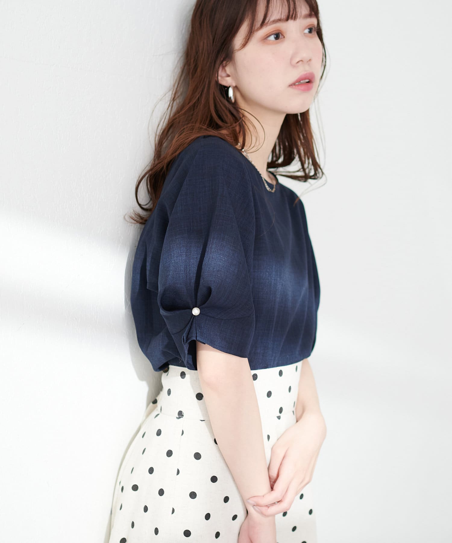 袖のタックとパール使いがフェミニンな1枚