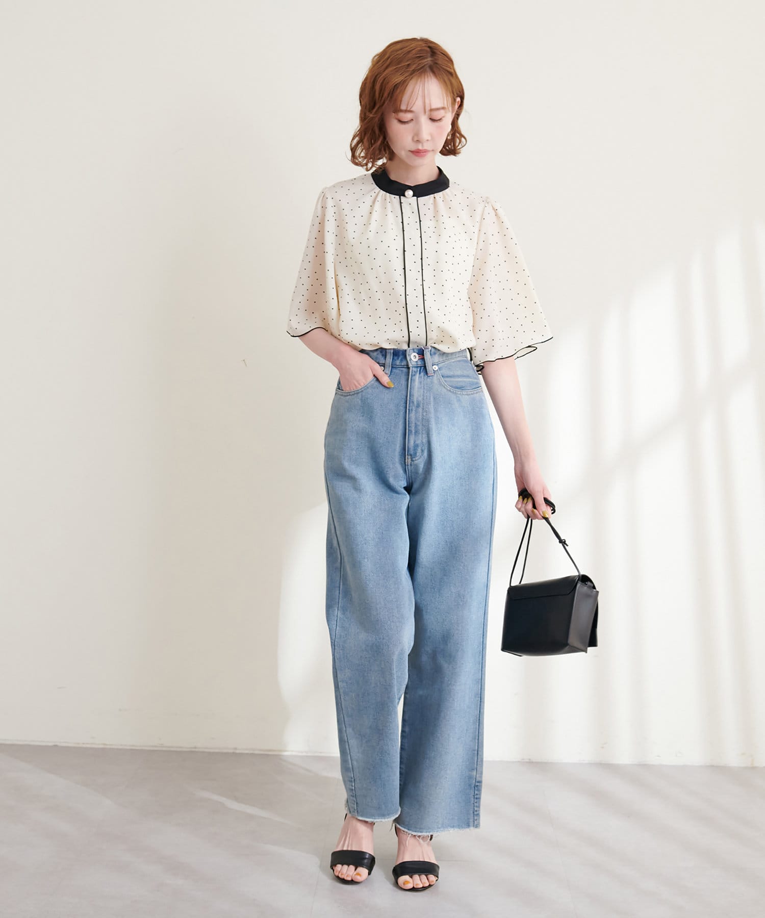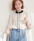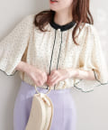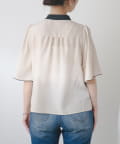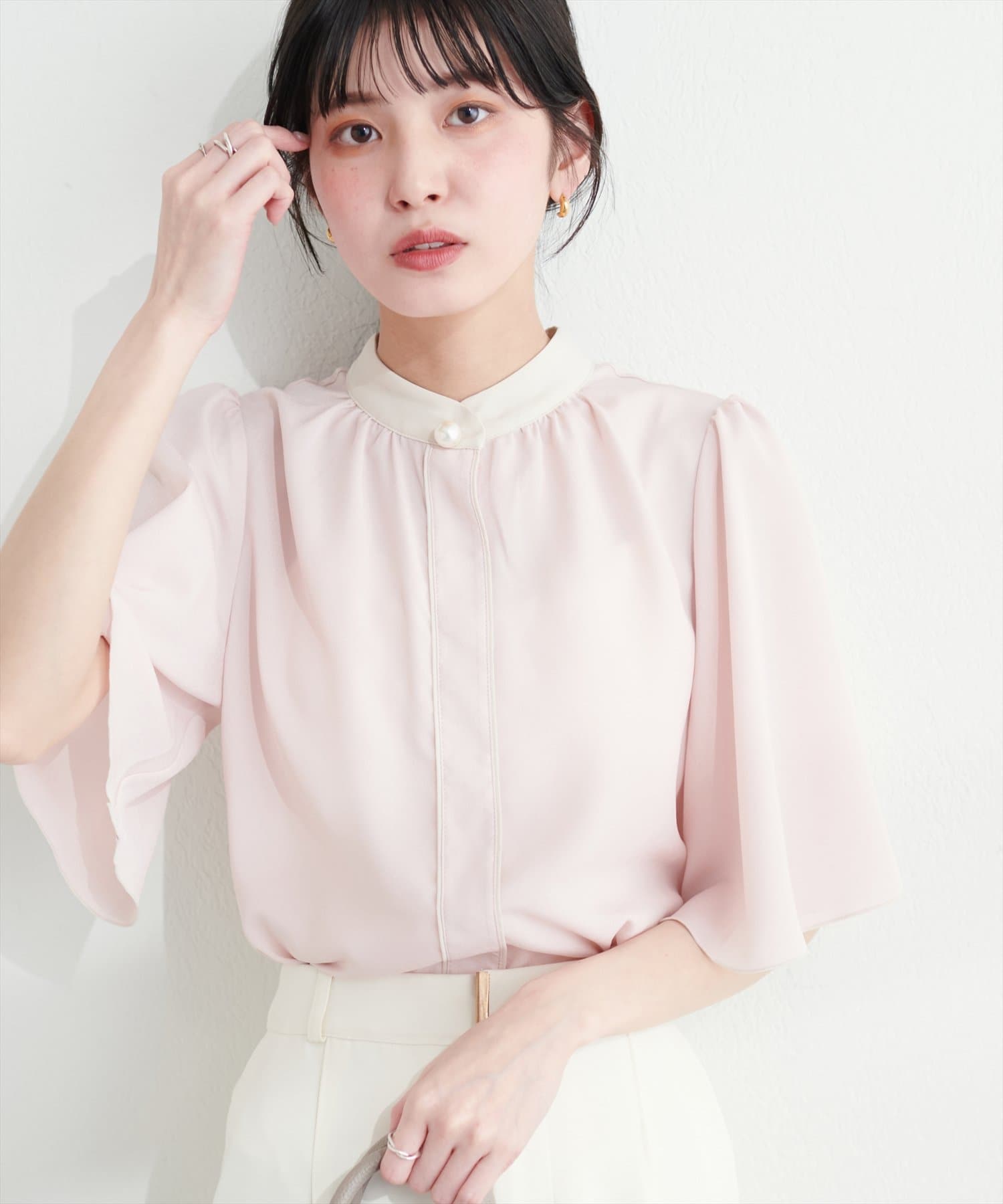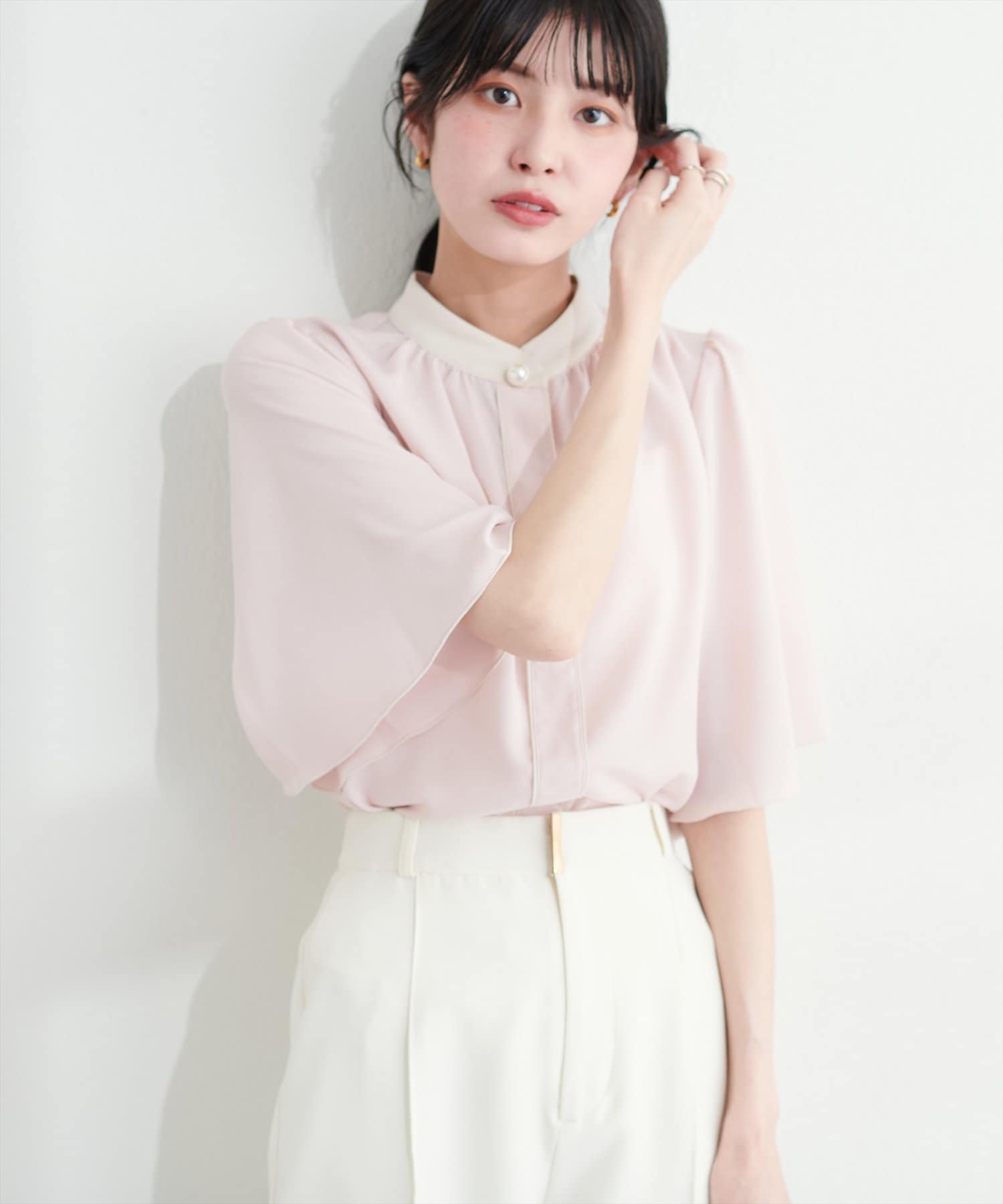0331040150 パール釦ポイントカラーフレア5分袖ブラウス