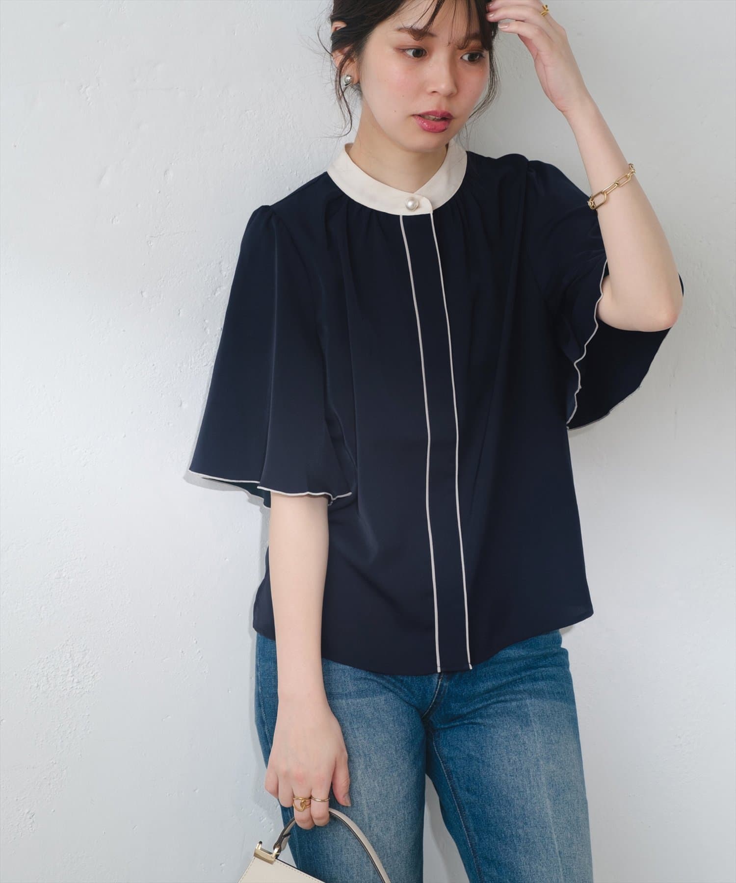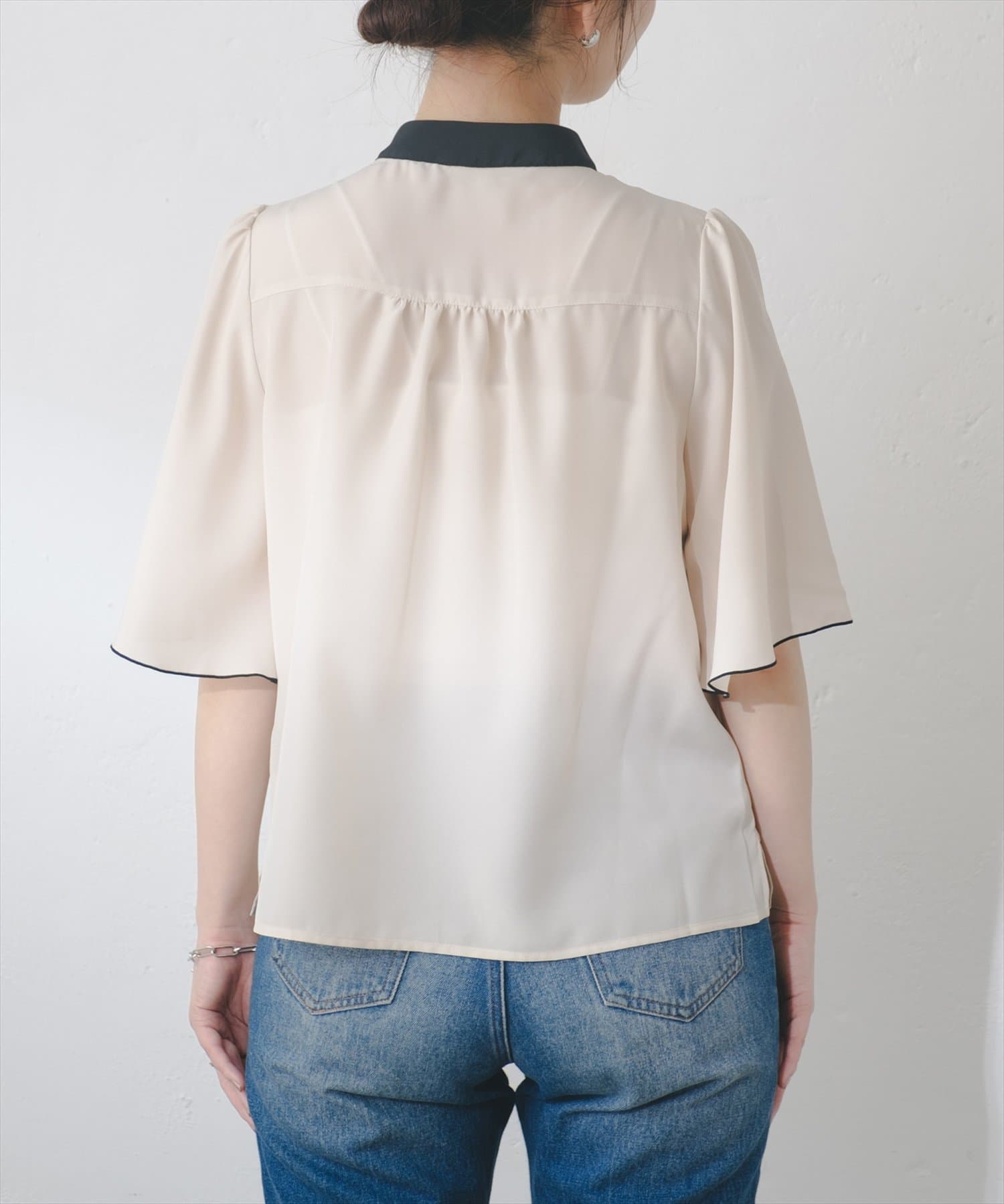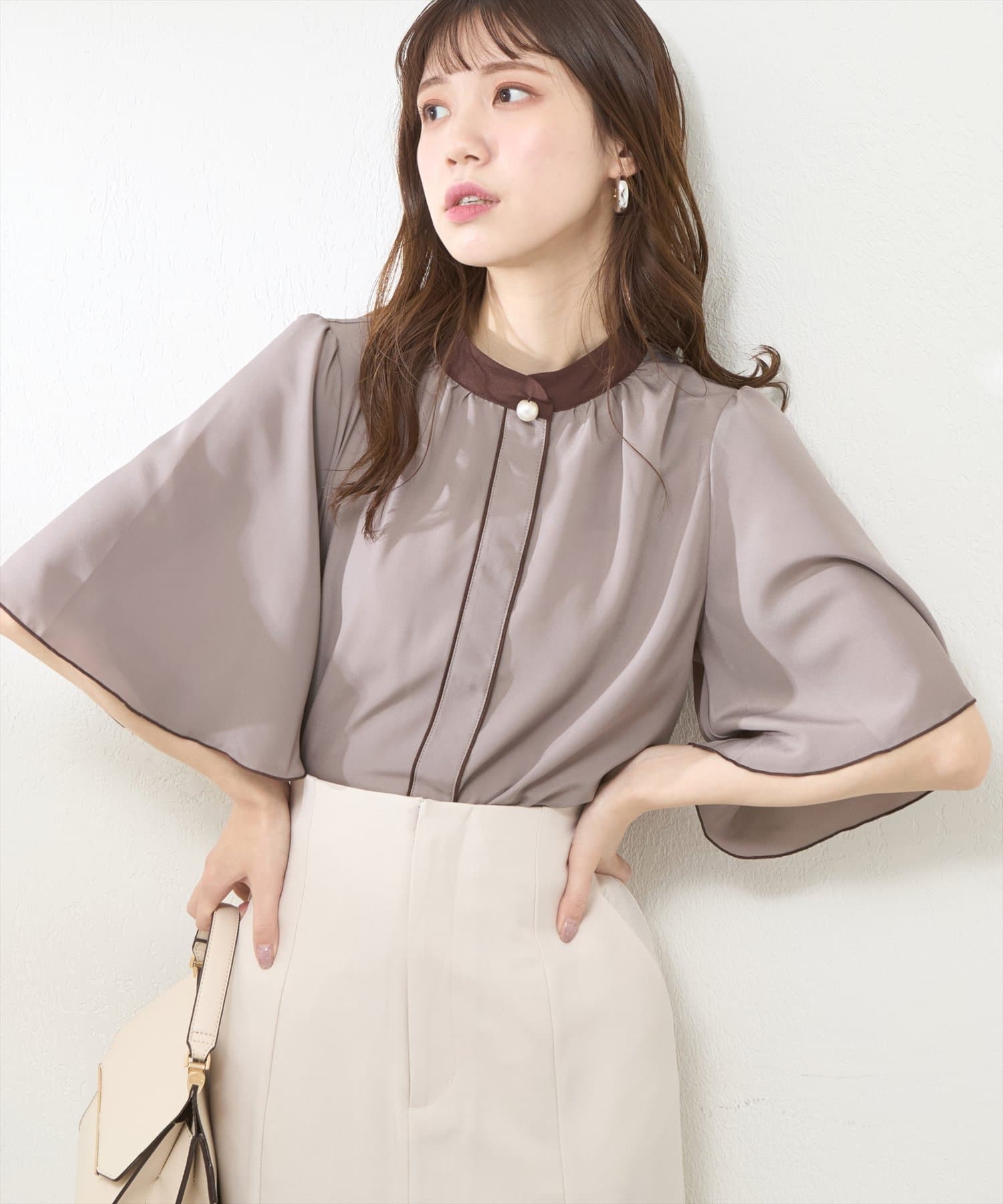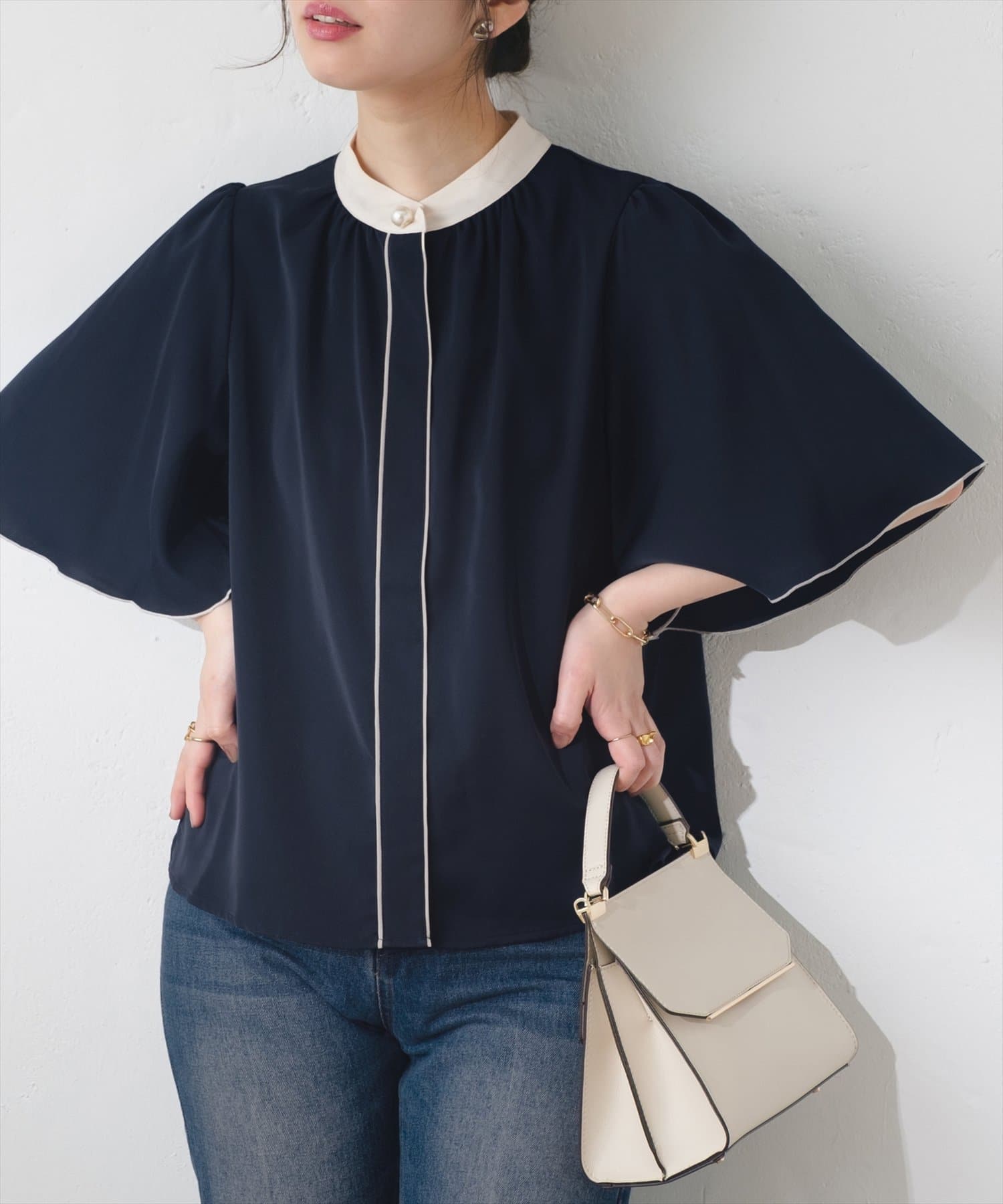 【WEB限定】パール釦ポイントバイカラーフレア5分袖ブラウス
