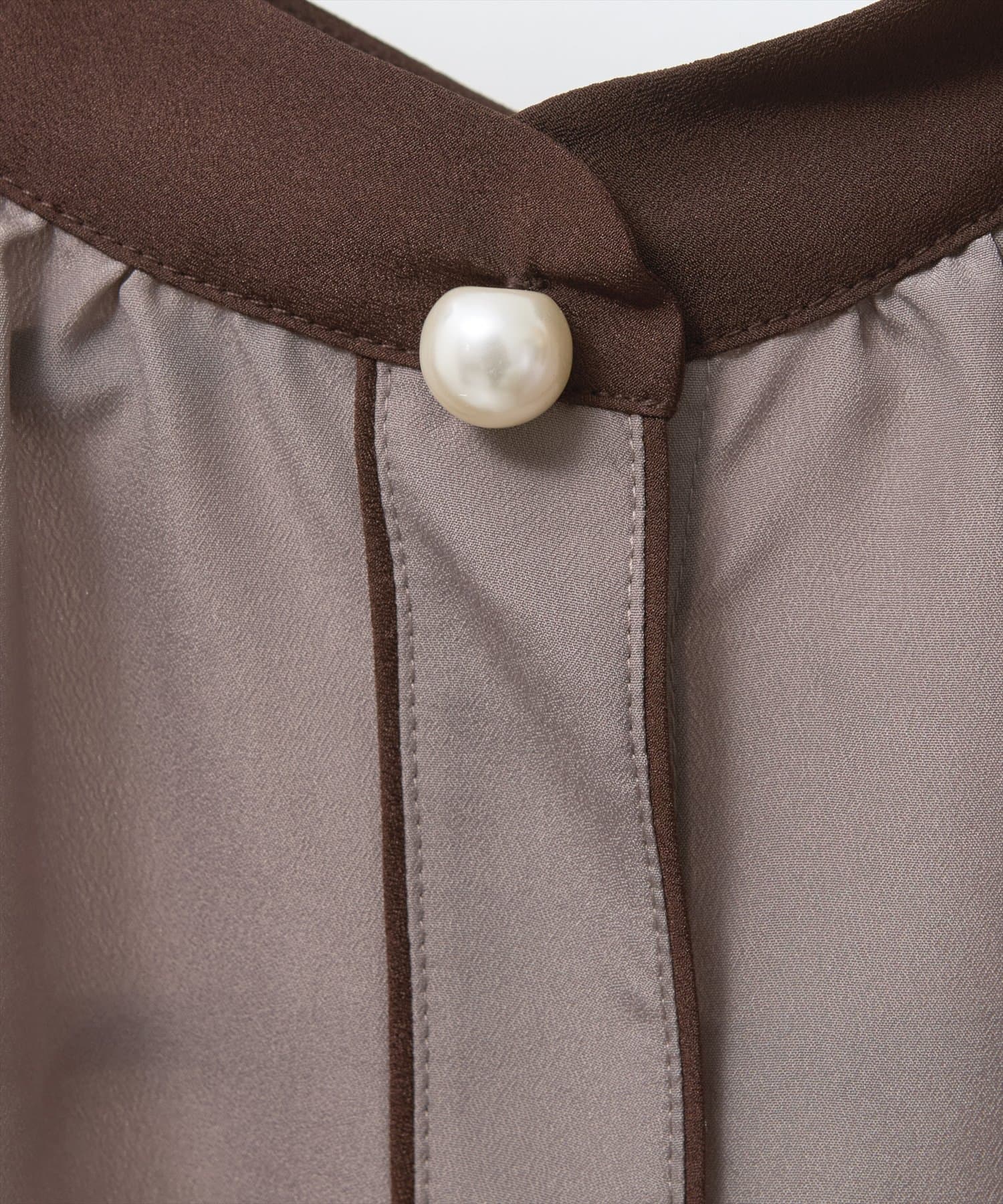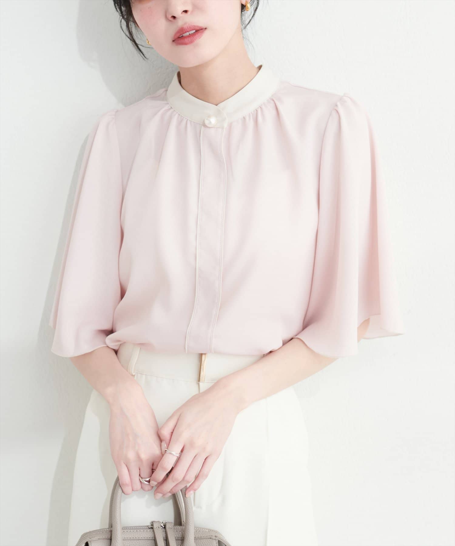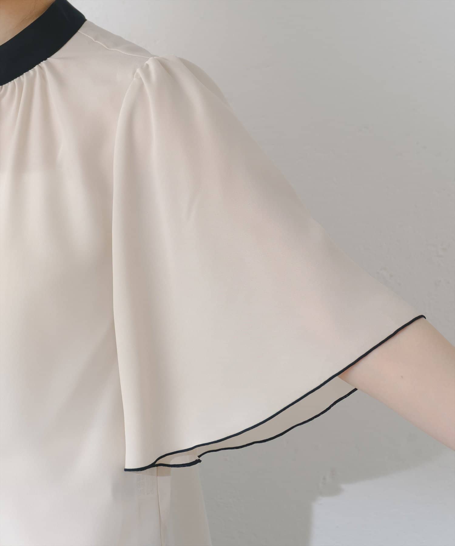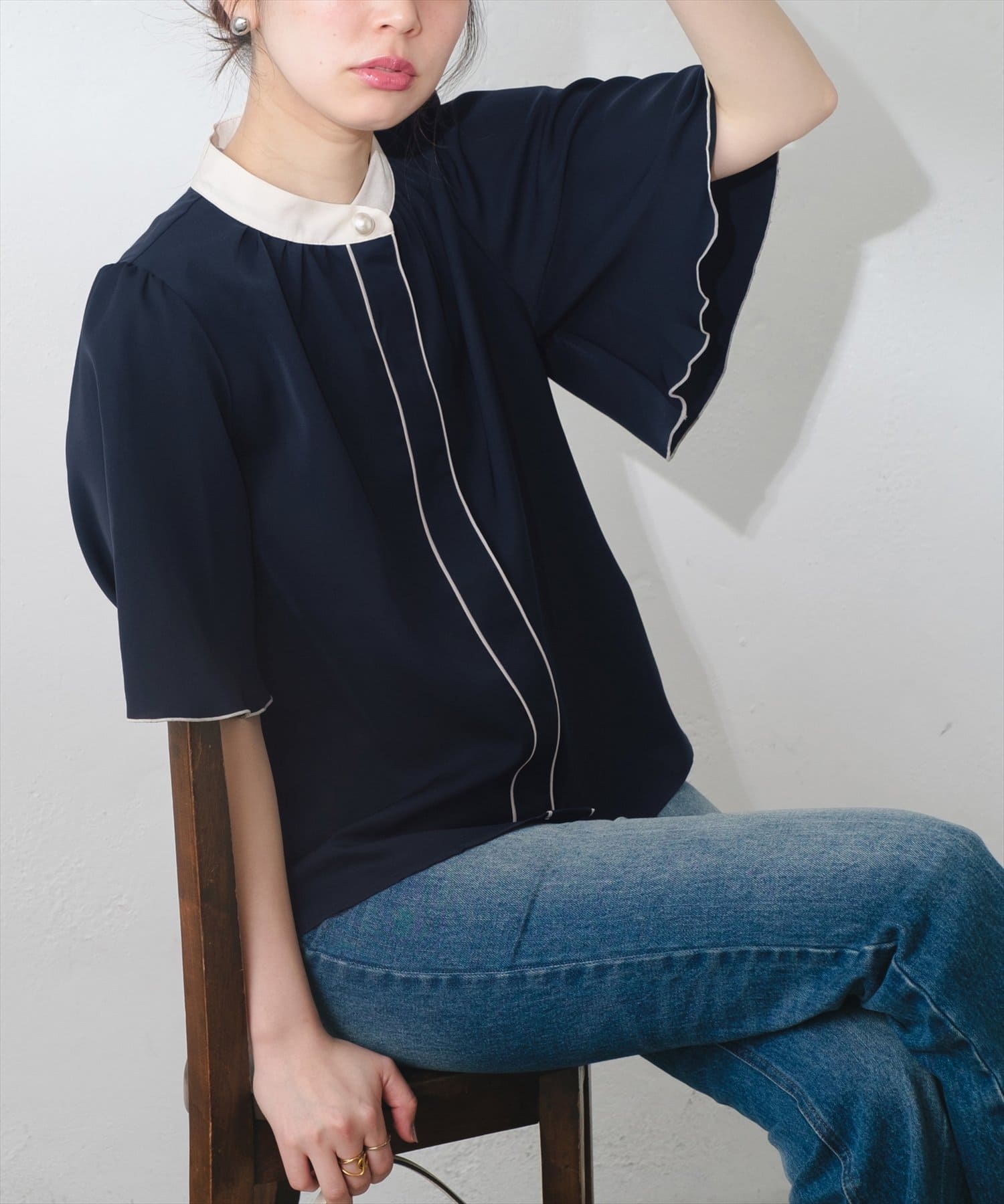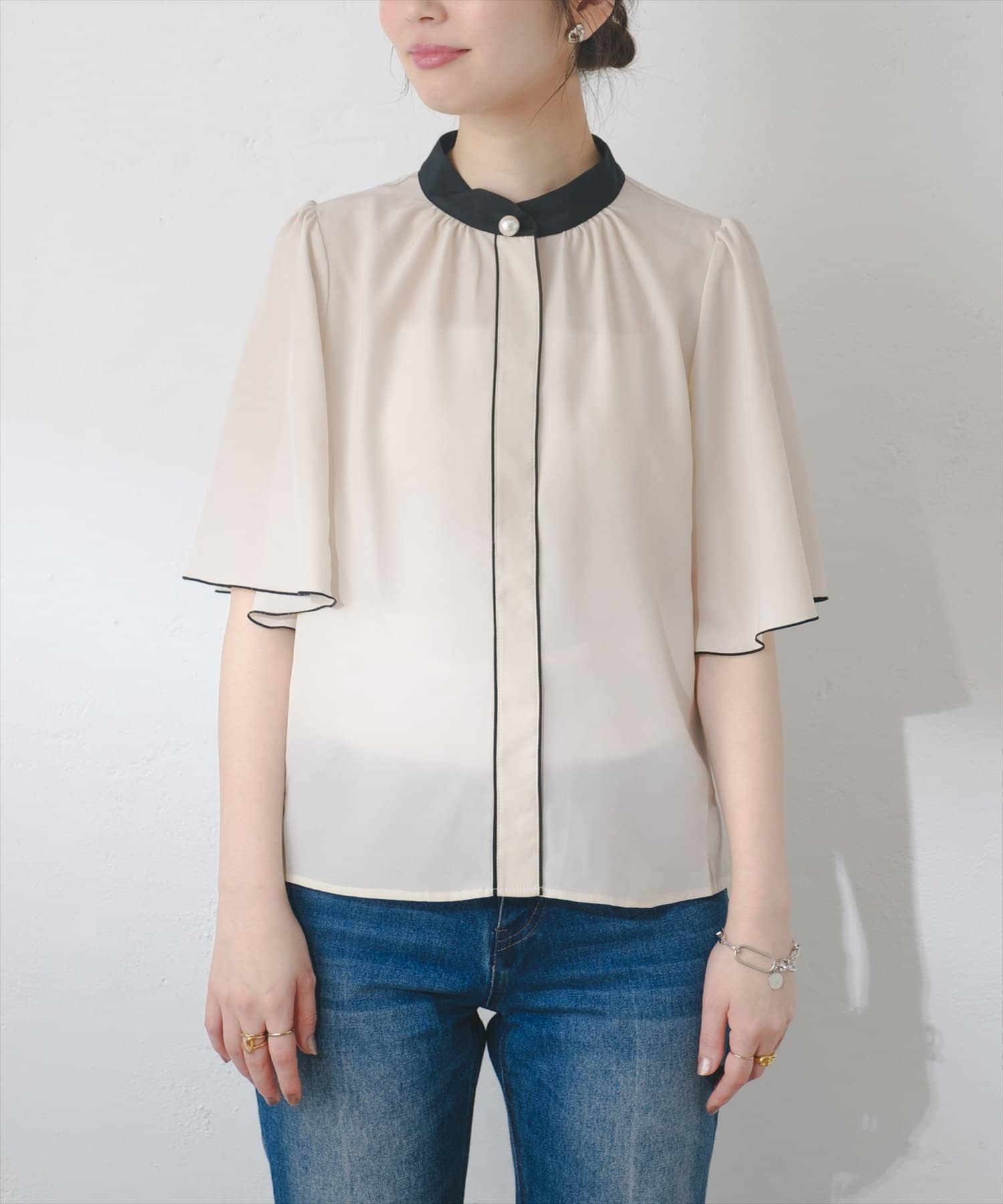 【WEB限定】パール釦ポイントバイカラーフレア5分袖ブラウス