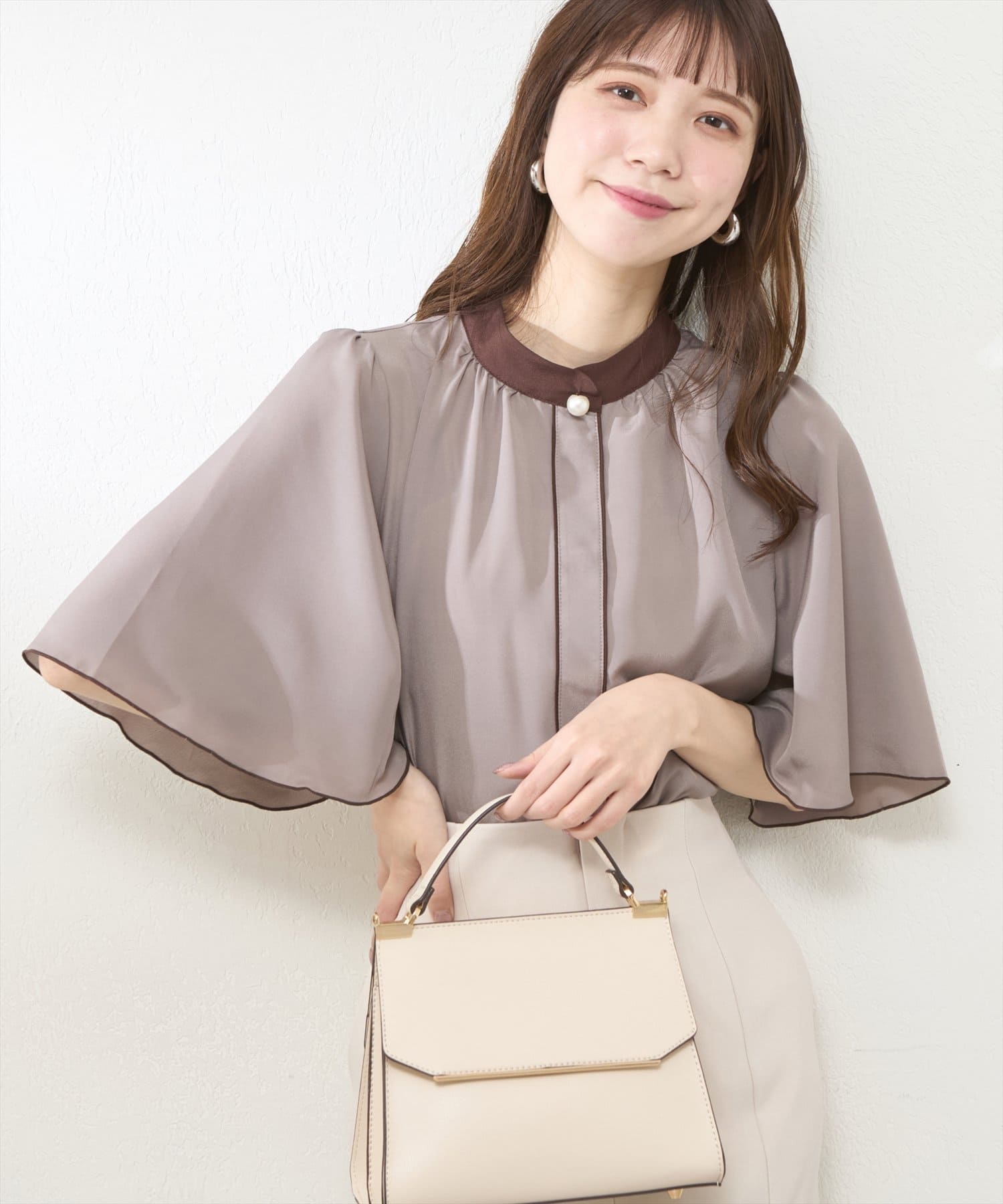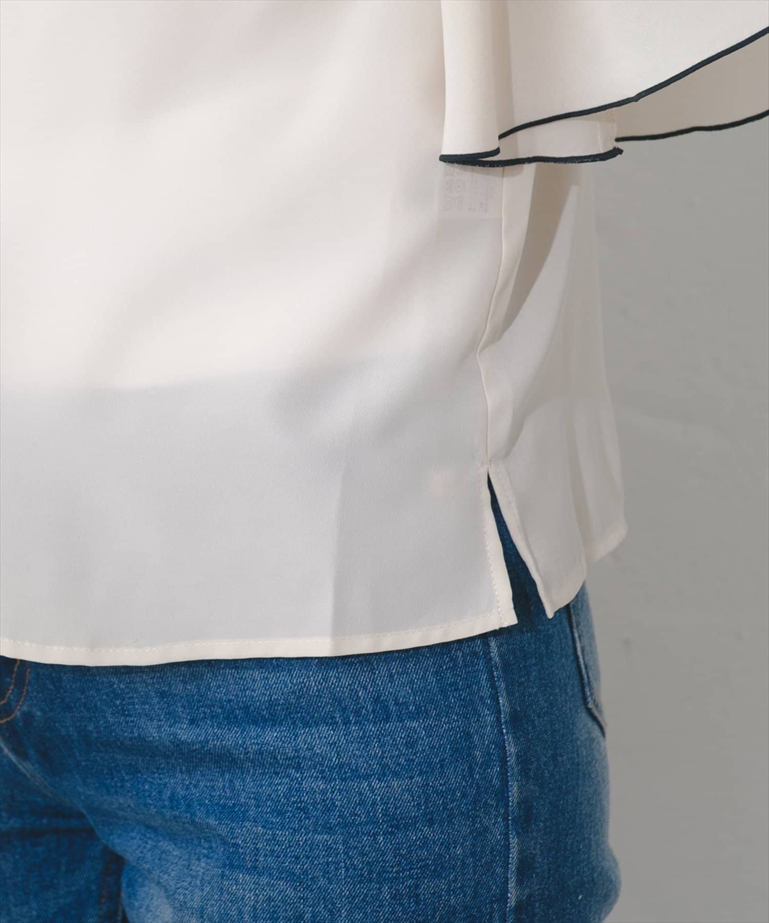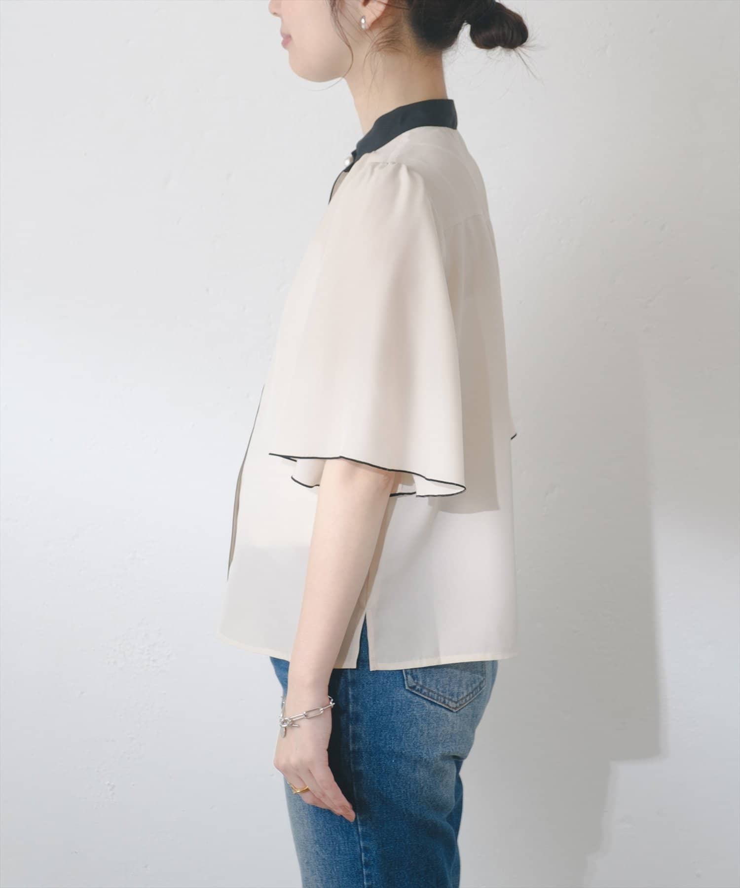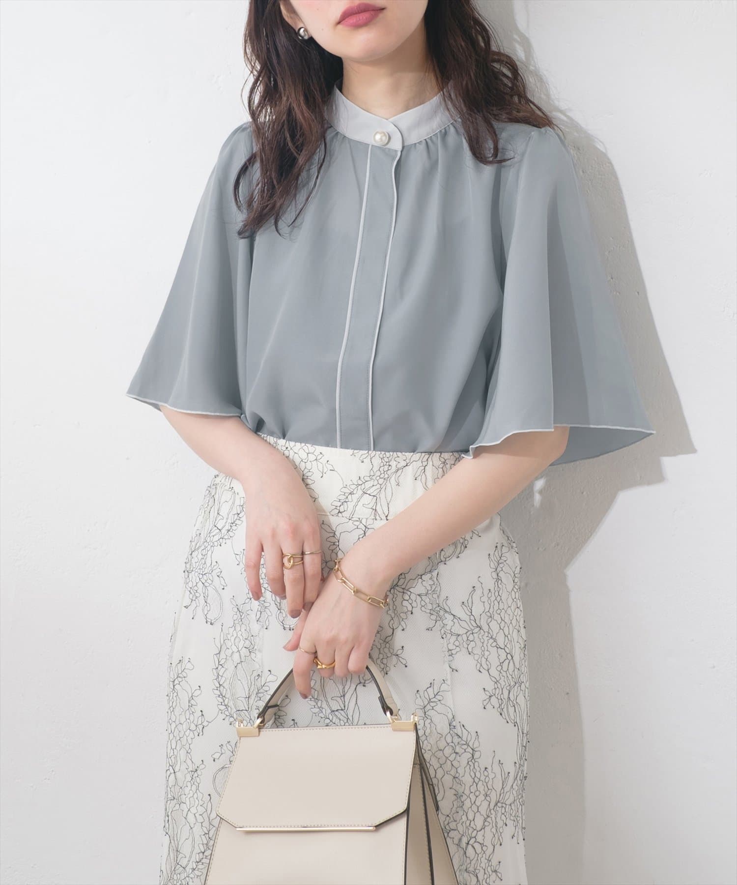 【WEB限定】パール釦ポイントバイカラーフレア5分袖ブラウス