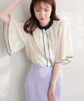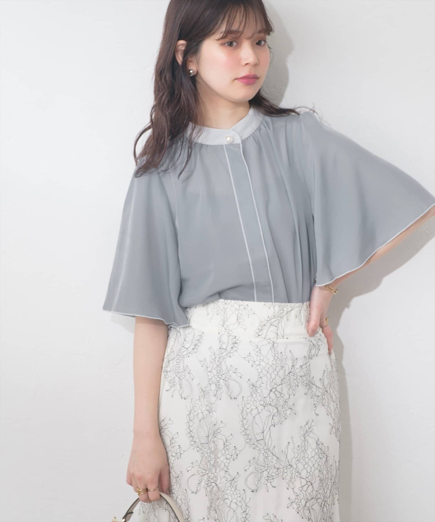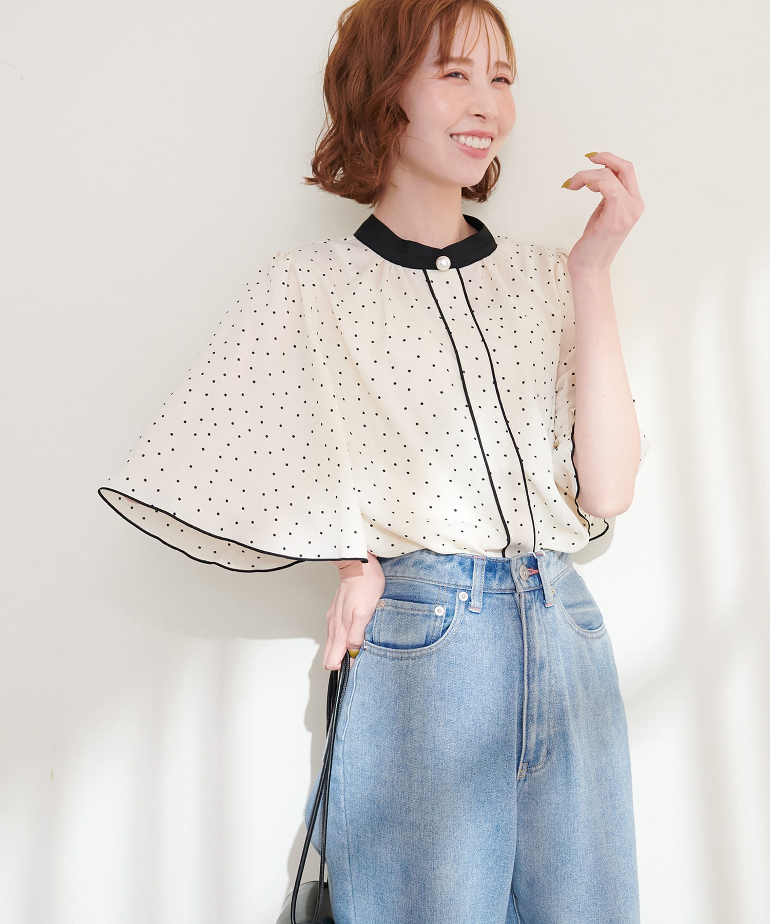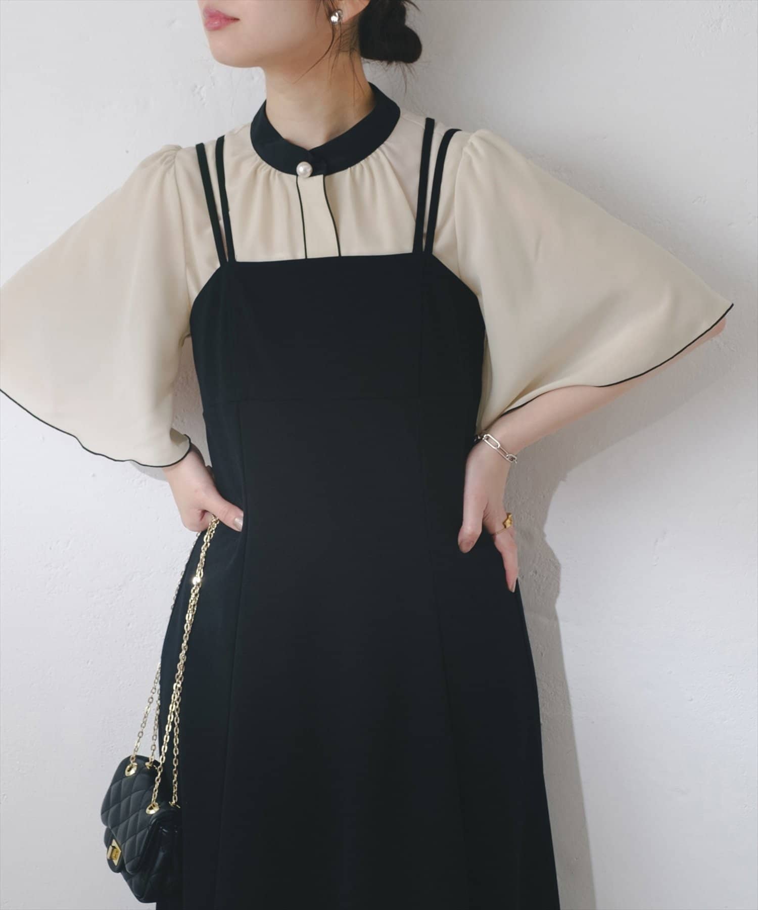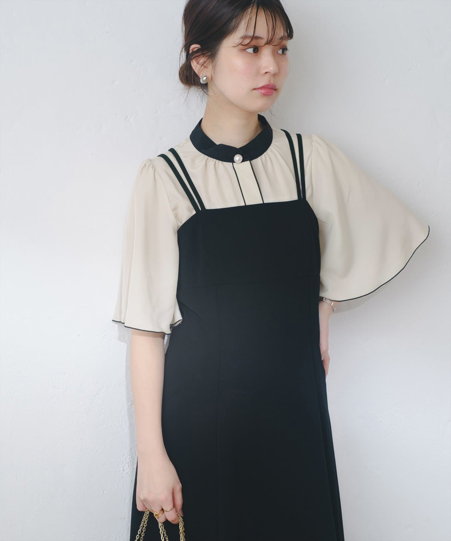 【WEB限定】パール釦ポイントバイカラーフレア5分袖ブラウス