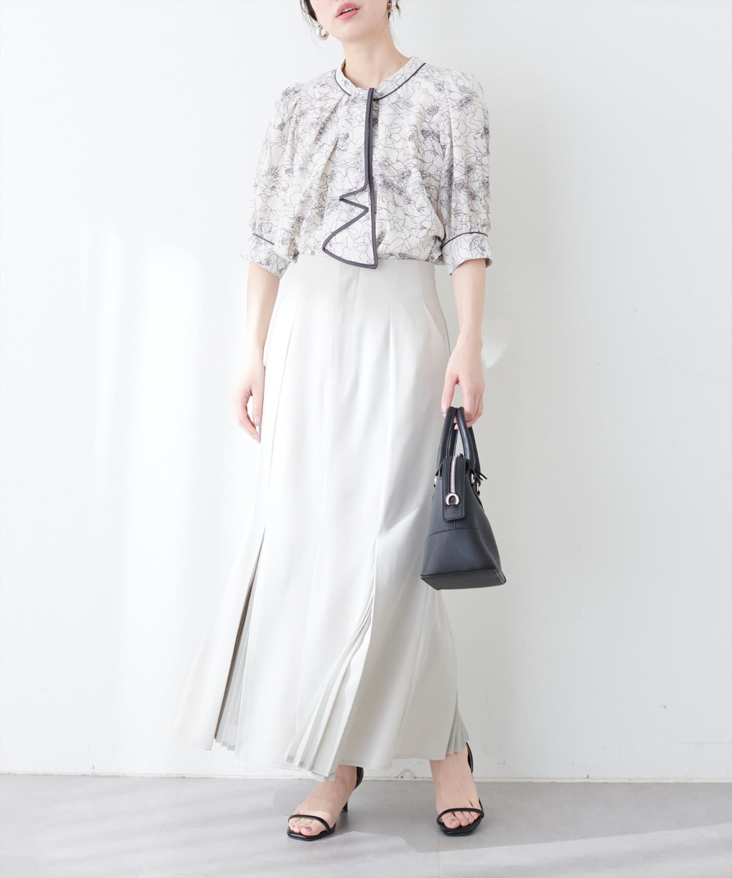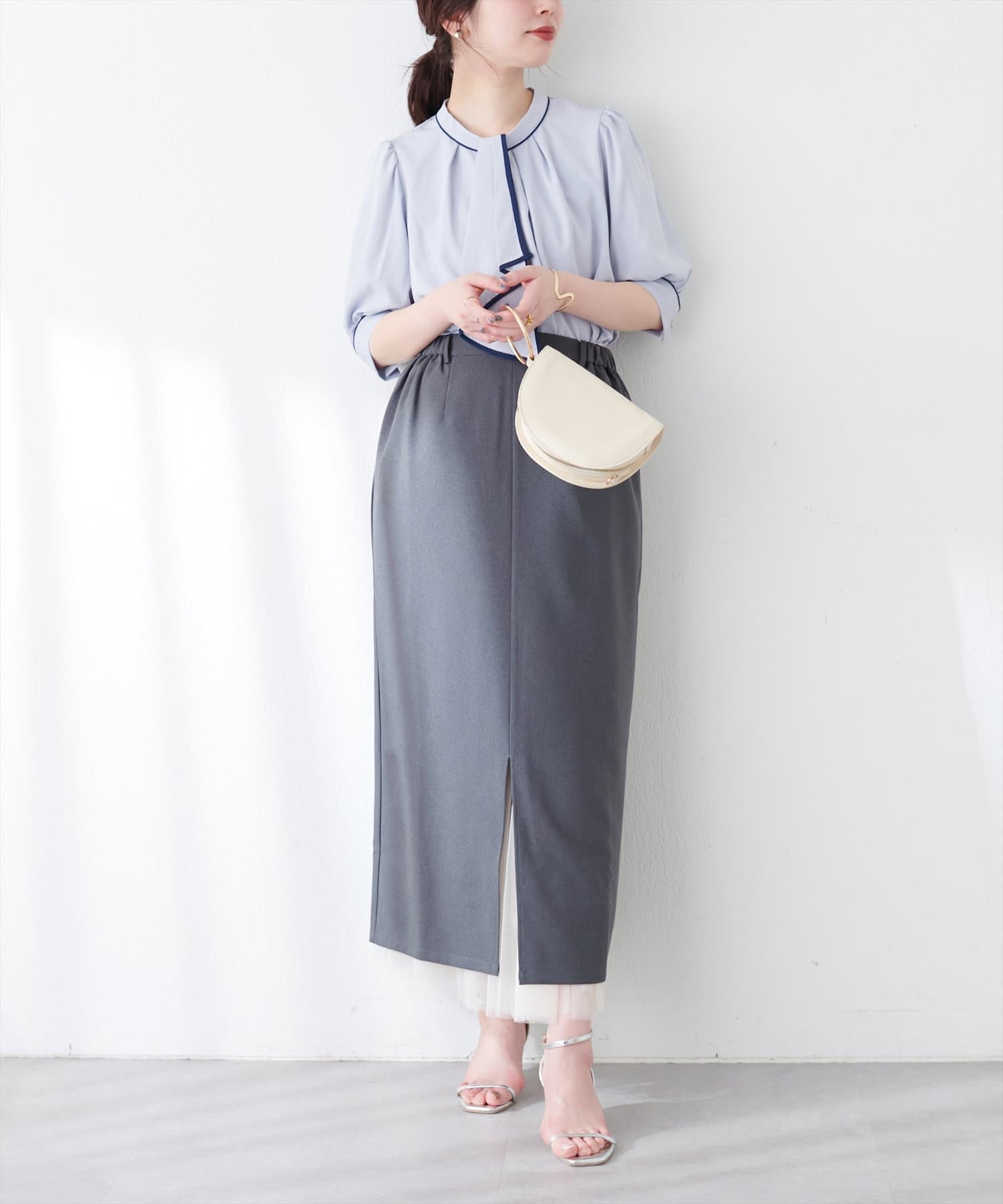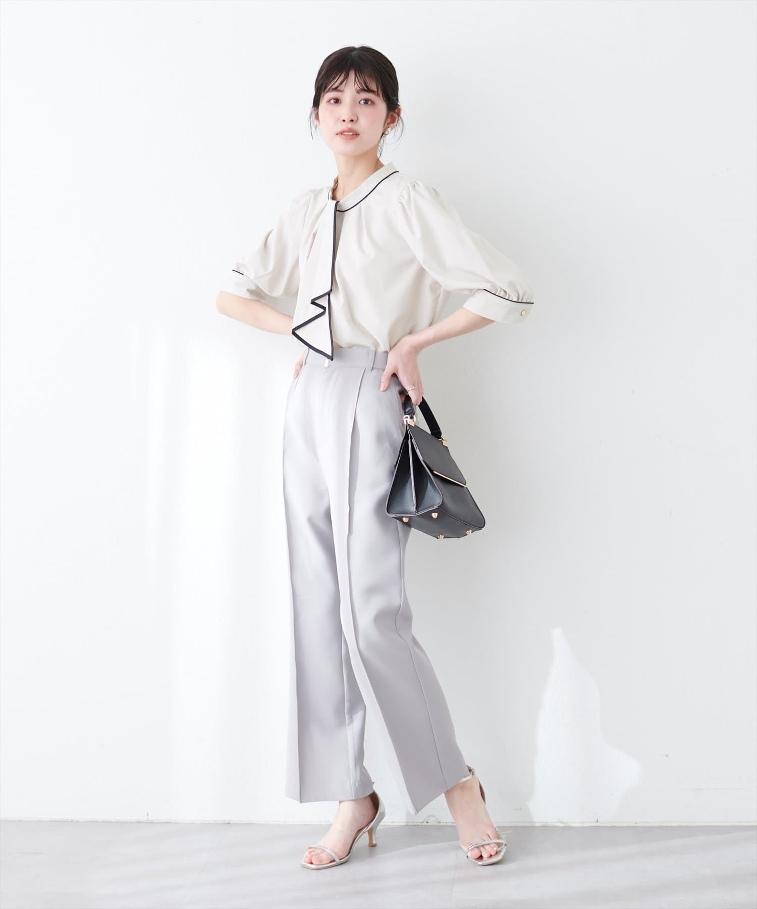 ブラウスがさらりとしている分、ボトムは厚みのあるアイテムを合わせて素材感にメリハリを付けるのがおすすめです。