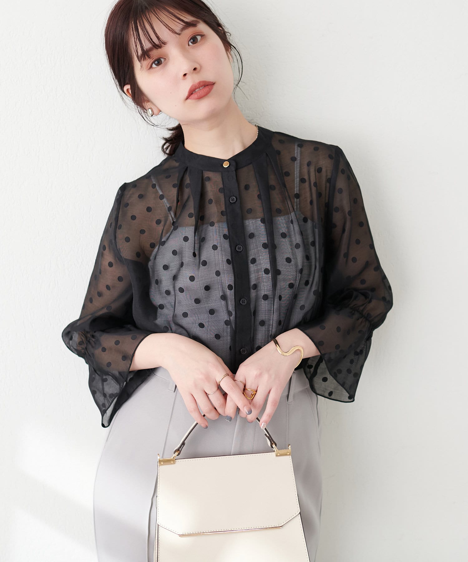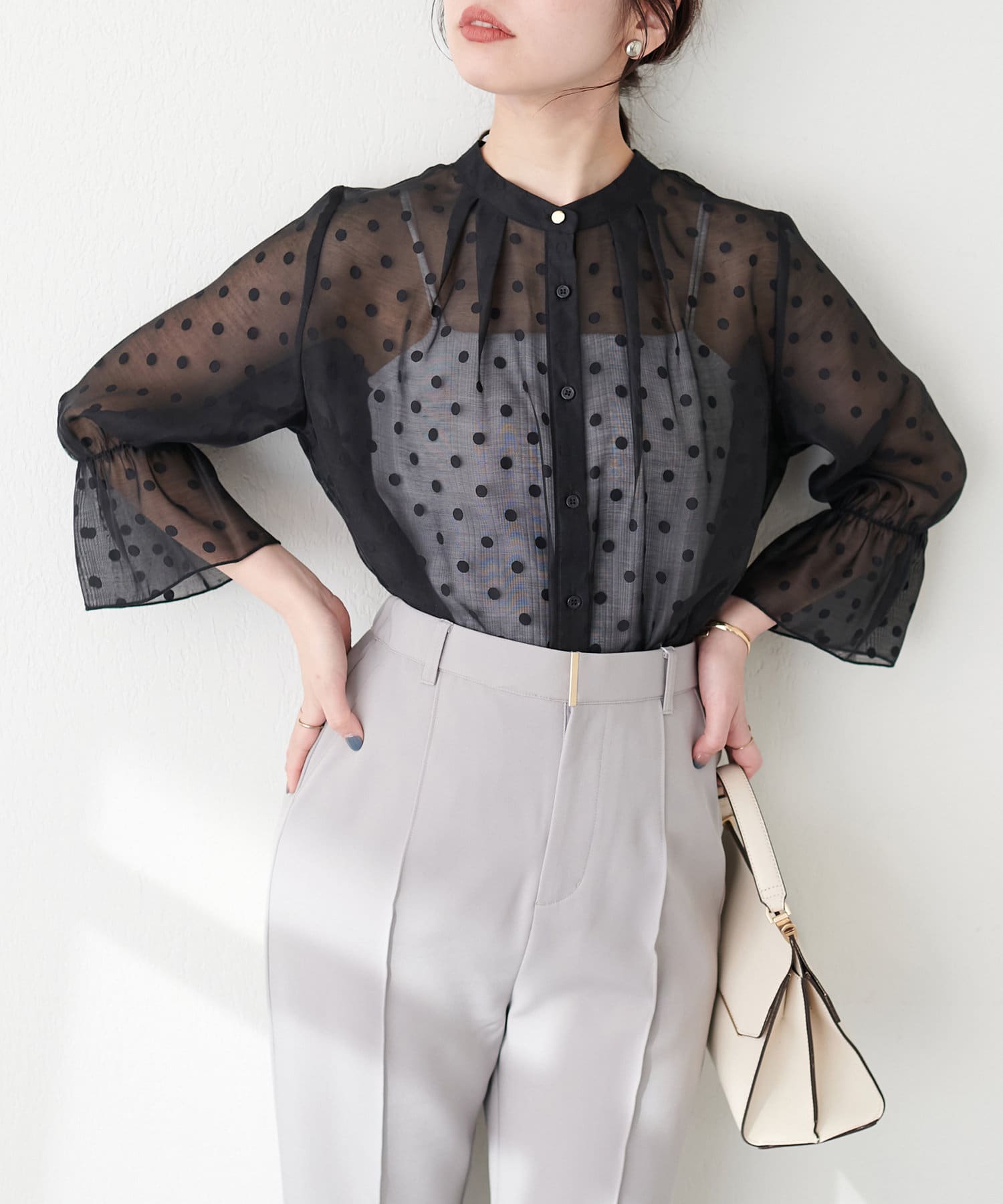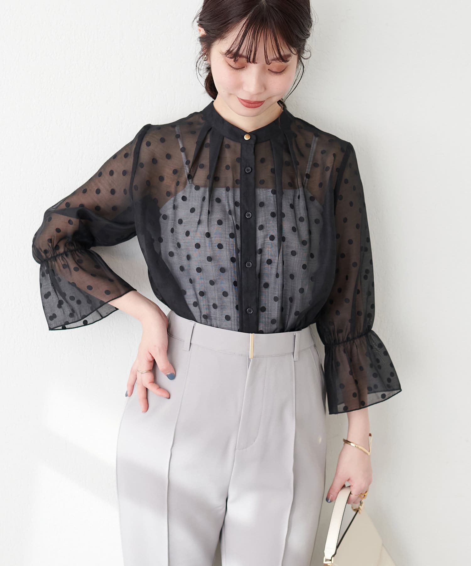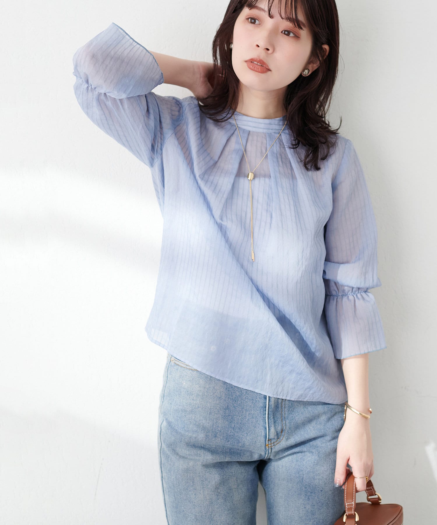 シアー素材からほんのり覗くヘルシーな肌見せが女性らしいブラウス。