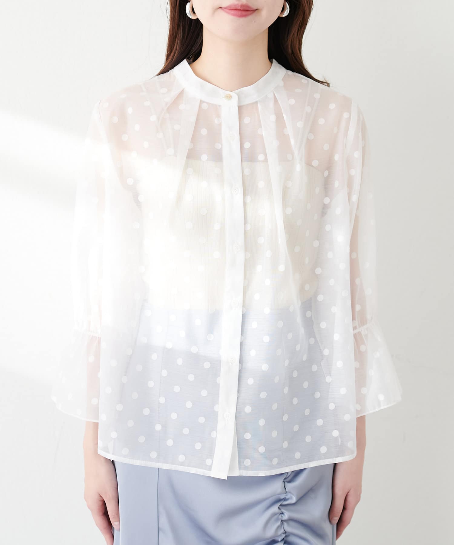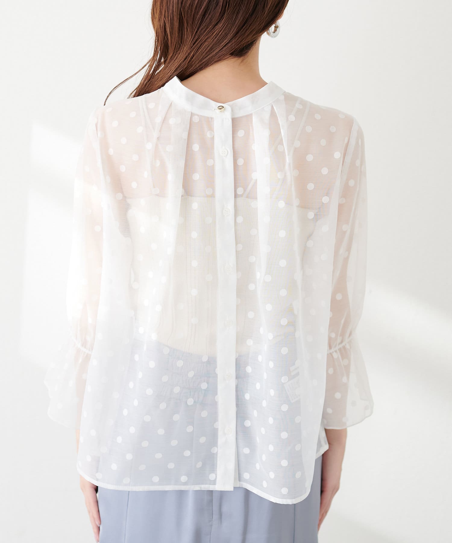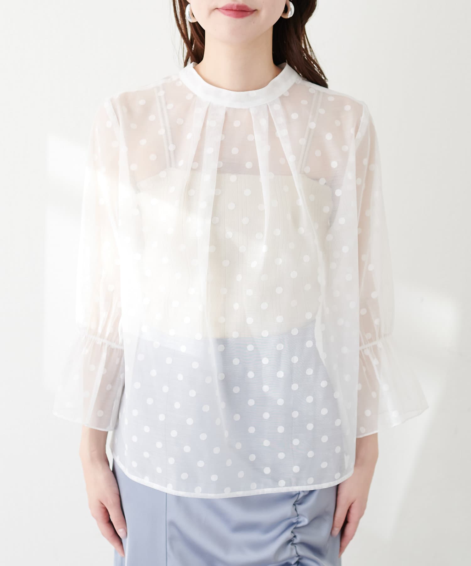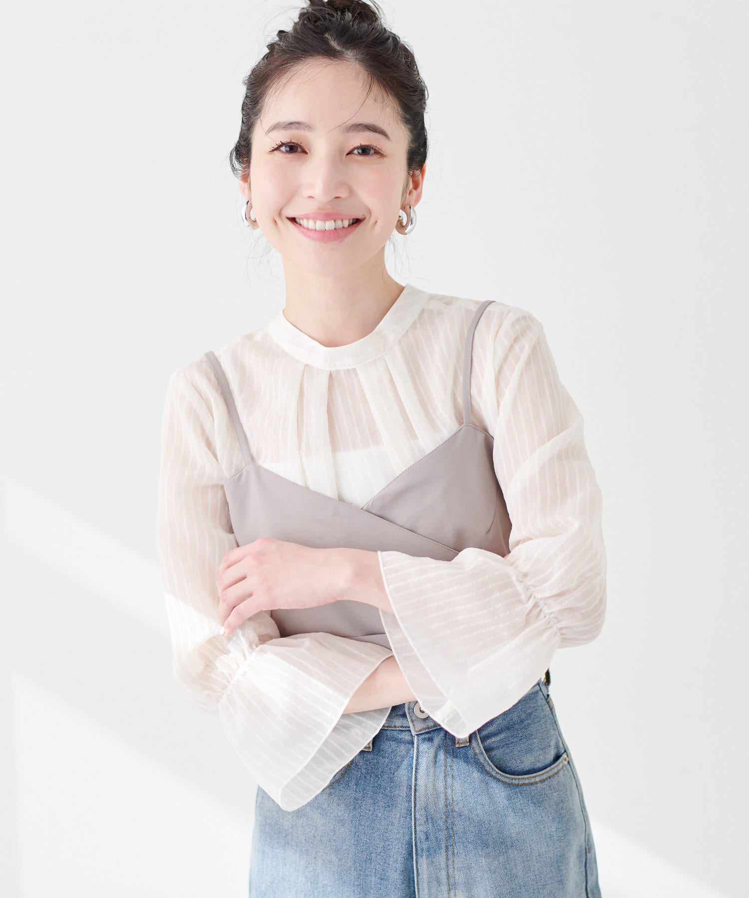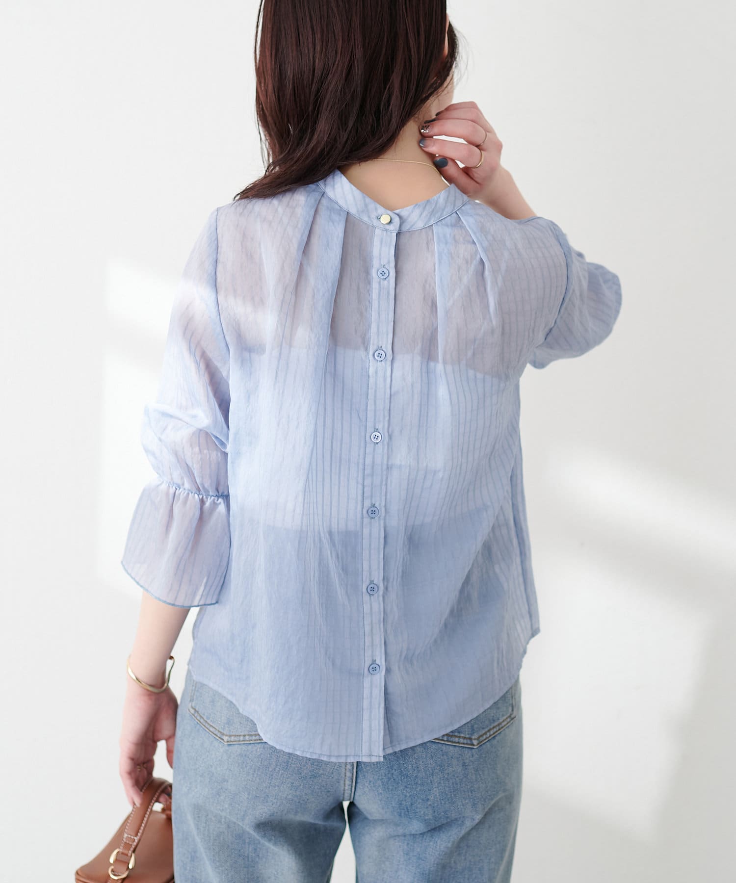シアー素材からほんのり覗くヘルシーな肌見せが女性らしいブラウス。
