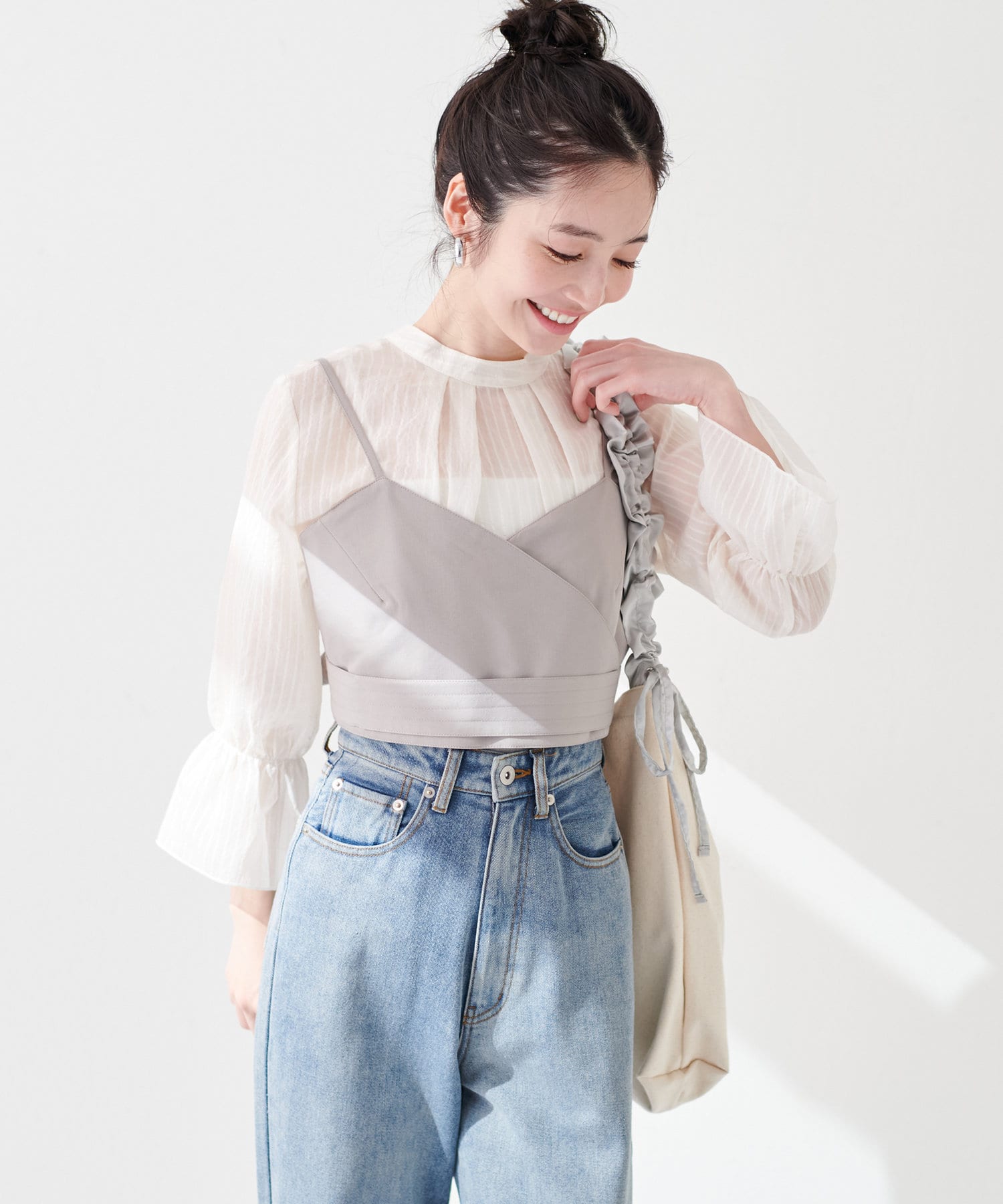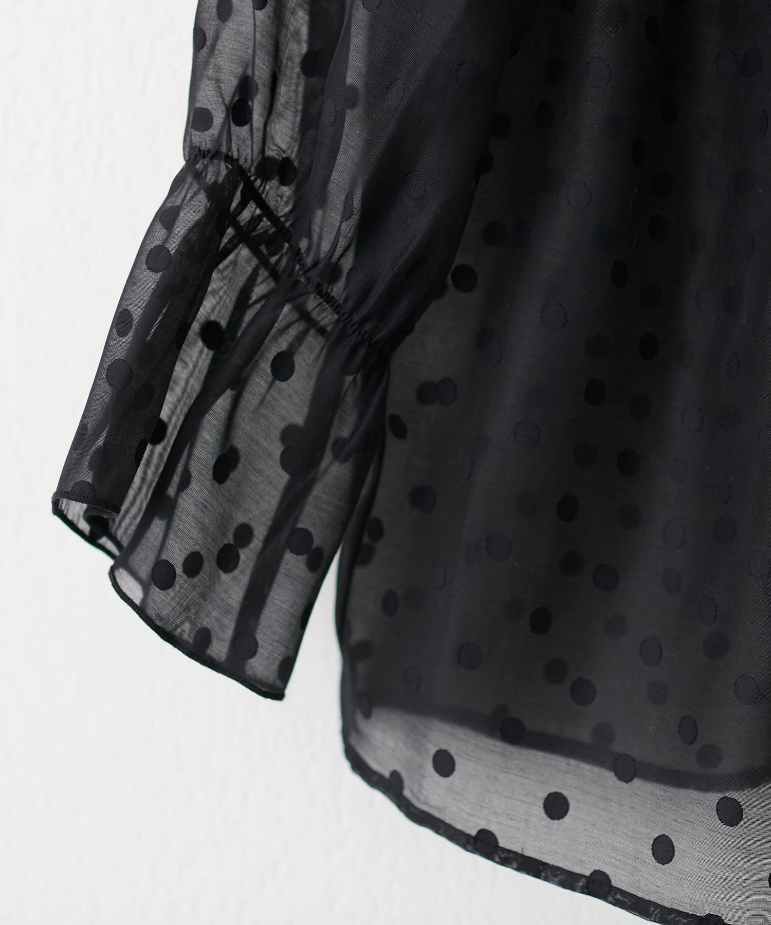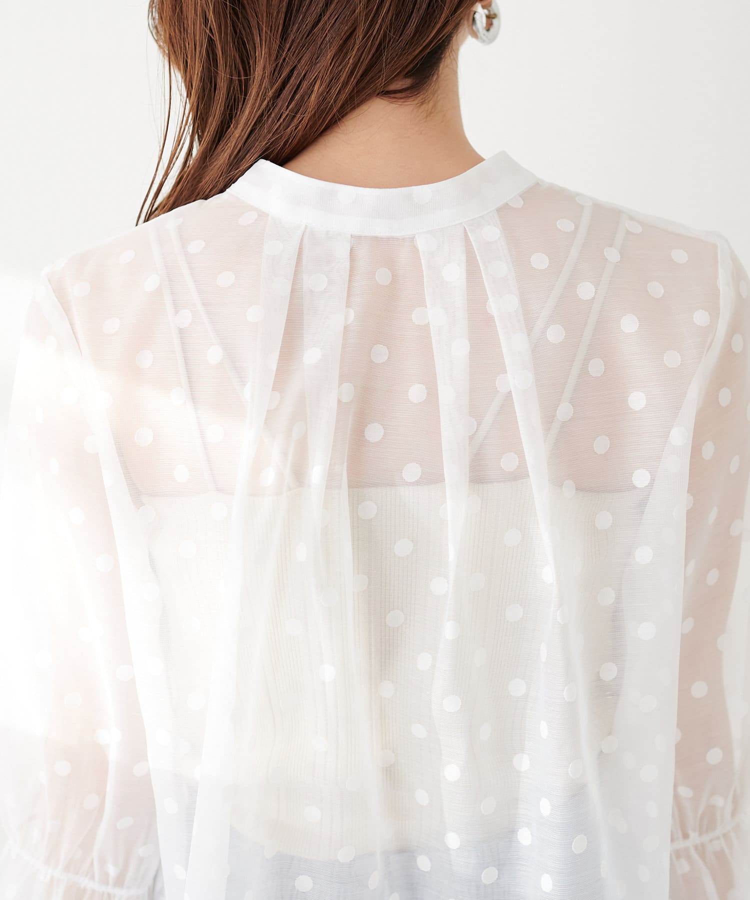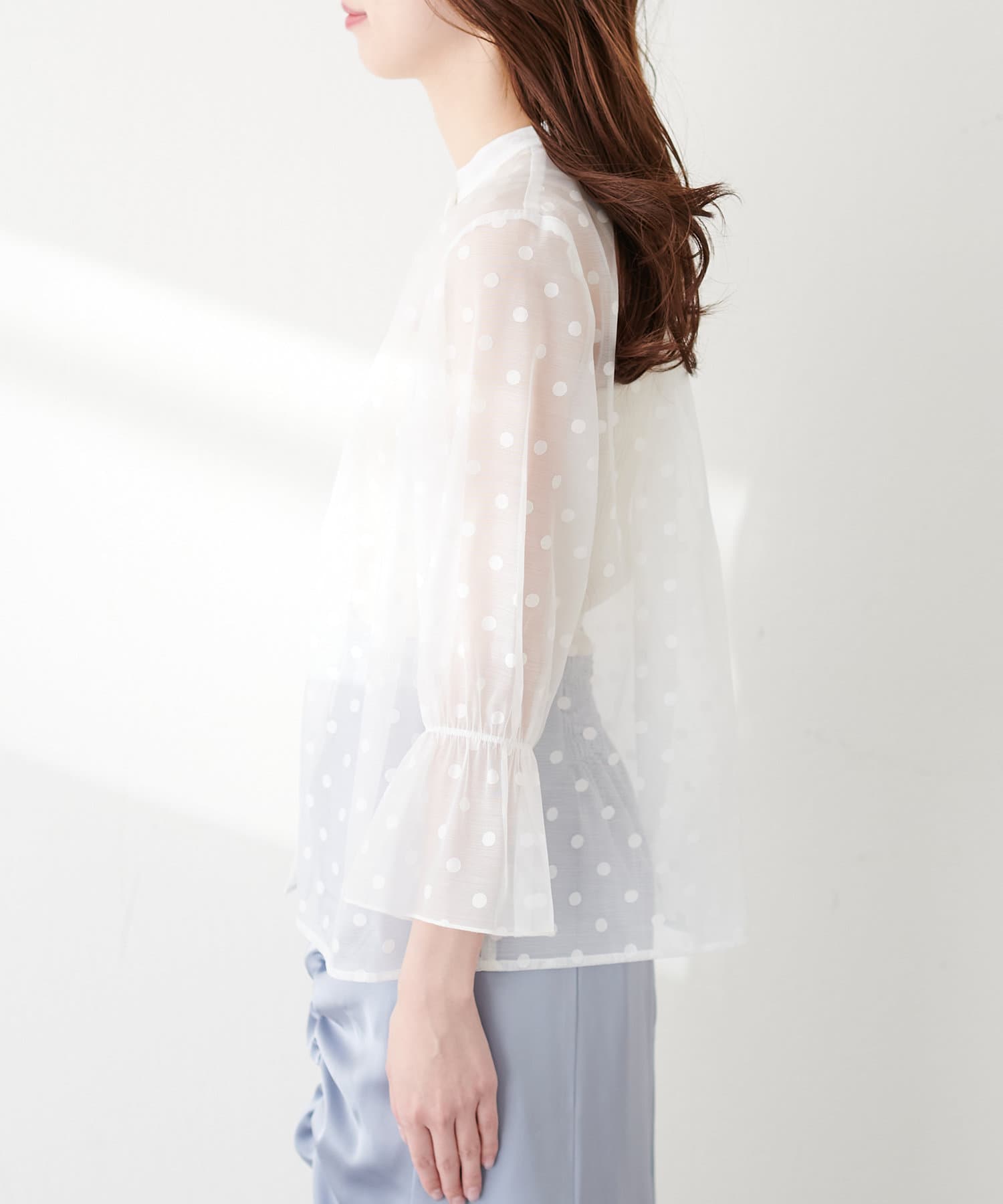 シアー素材からほんのり覗くヘルシーな肌見せが女性らしいブラウス。