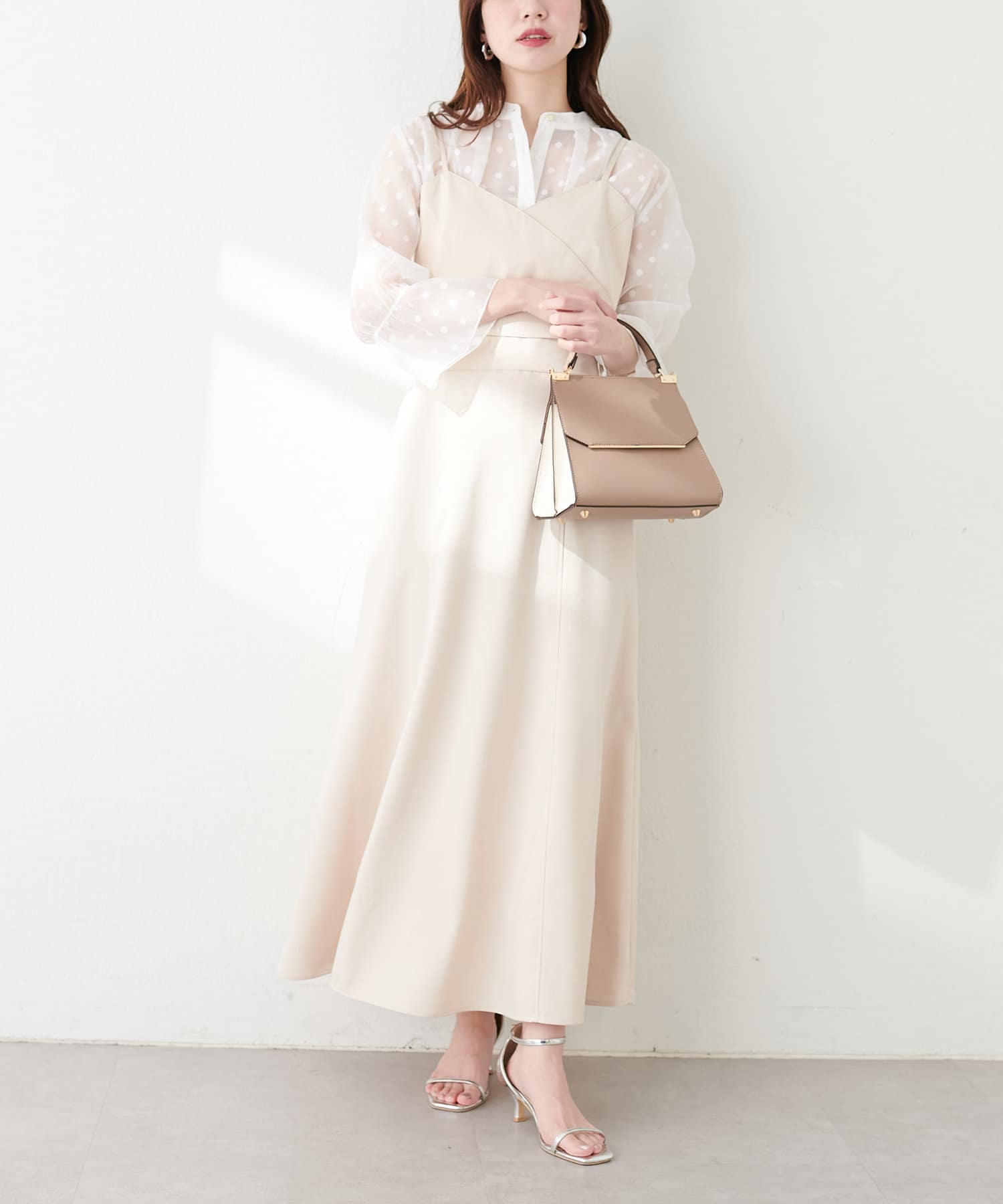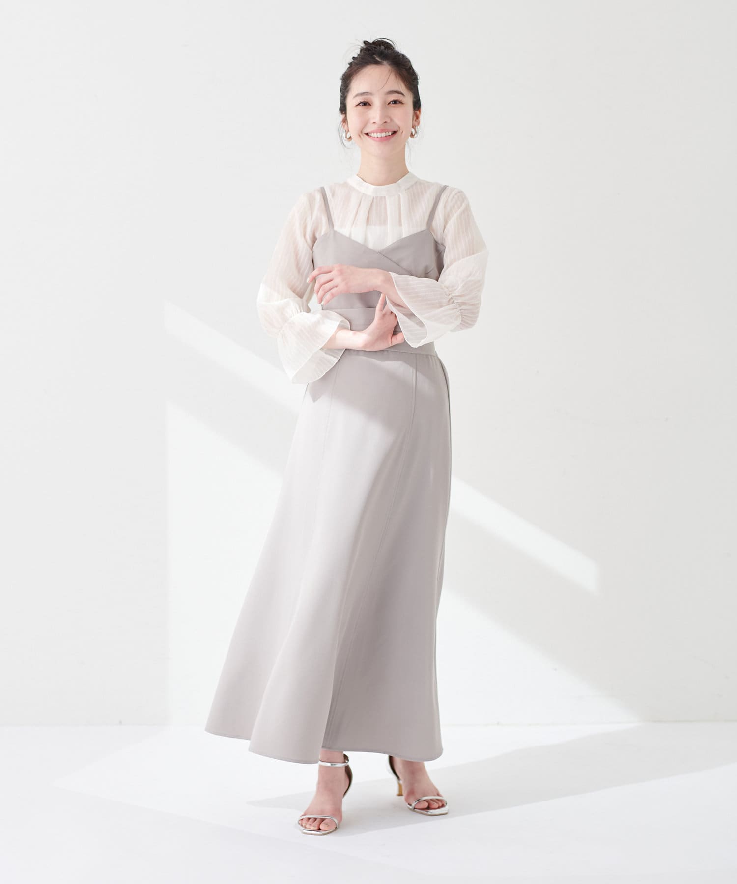 【骨格】 透け感があり軽い生地感で骨格ウェーブにイチオシなアイテム。 上半身の立体感が気になる方は、 ビスチェやジャケットなどとレイヤードをした着こなしで広がりを抑えると〇