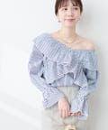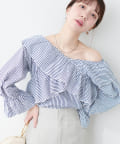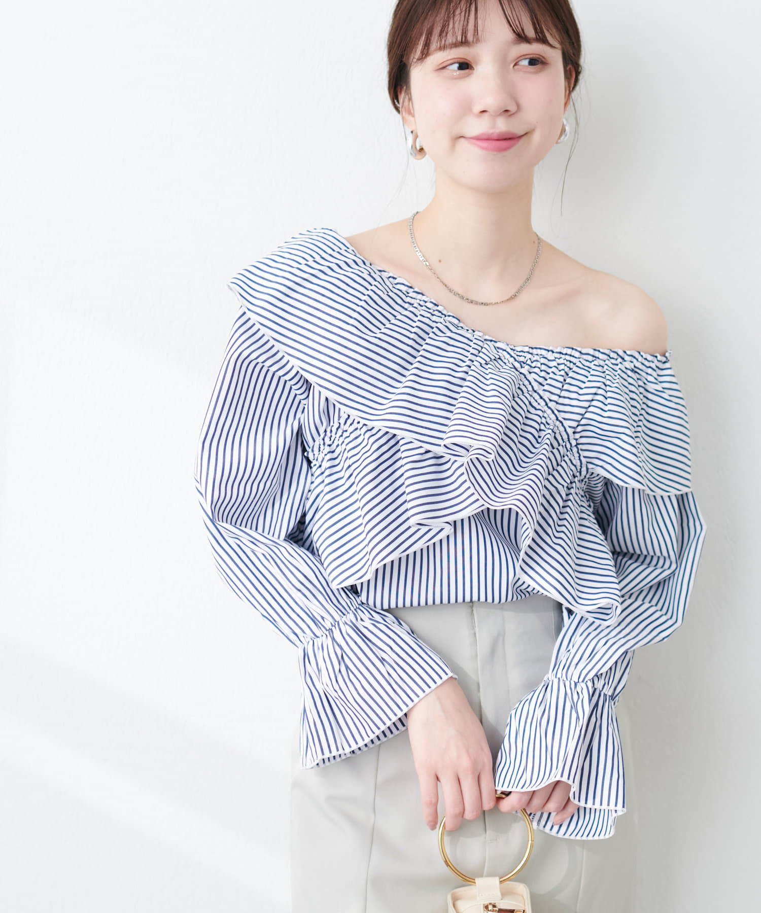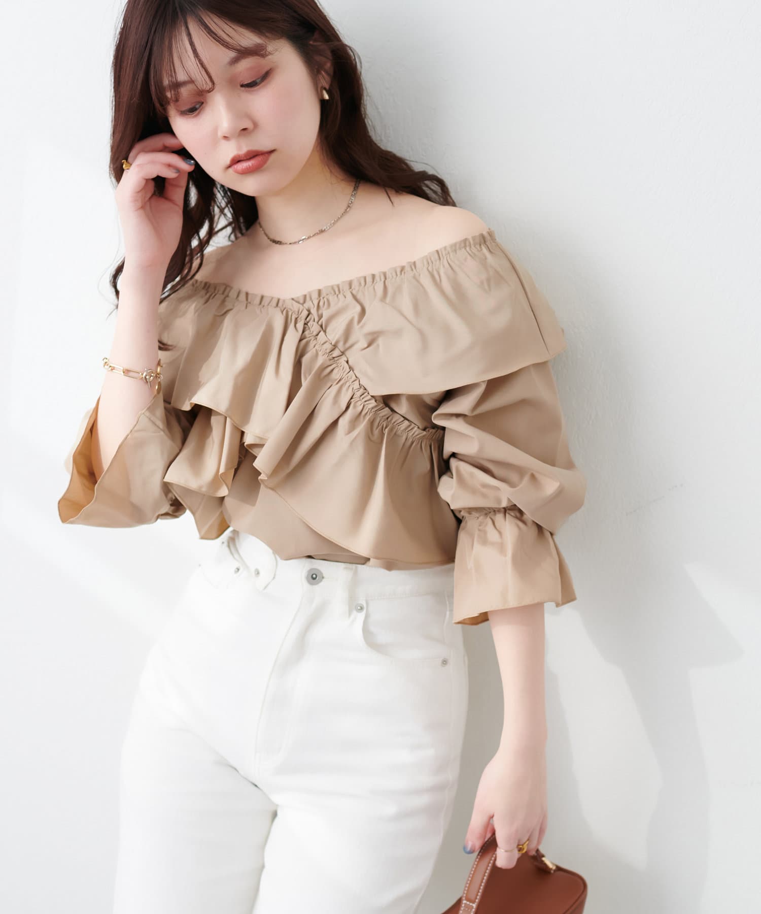 肩から胸にかけてクロスしたフリルデザインが目を惹くフェミニンブラウス。