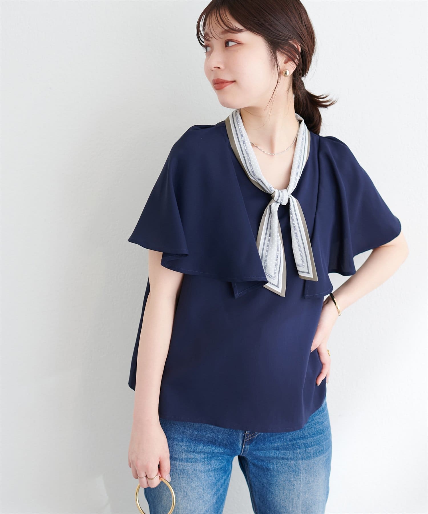 スカーフをつけたいけど、上手く着こなせせない。そんな時に見つけました。気軽にスカーフコーデ。袖もふんわり可愛く二の腕カバーで良いです。