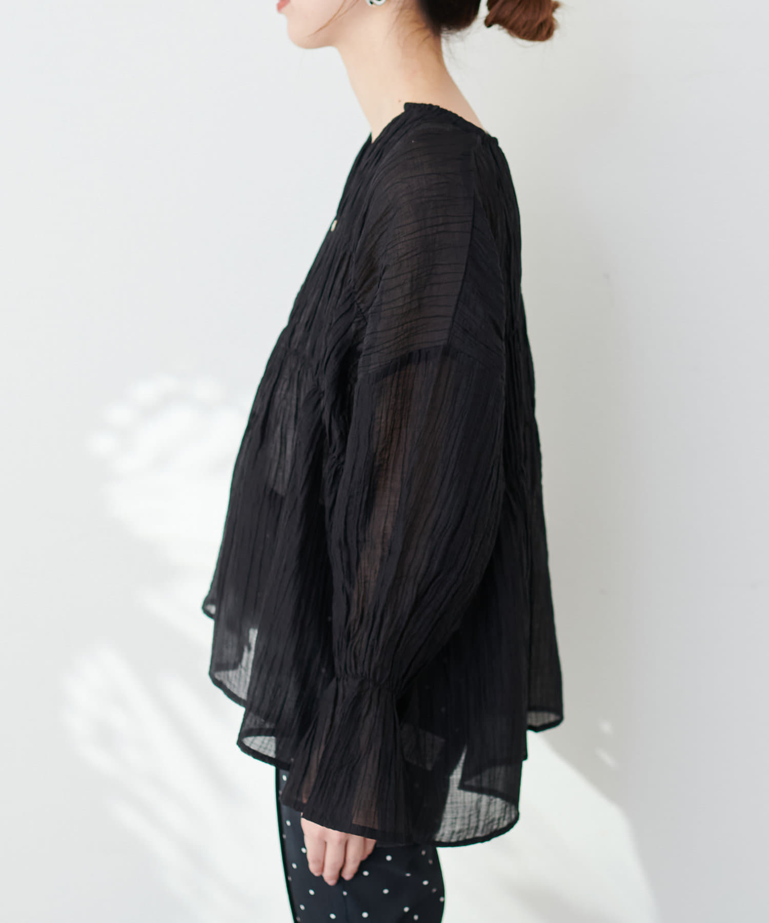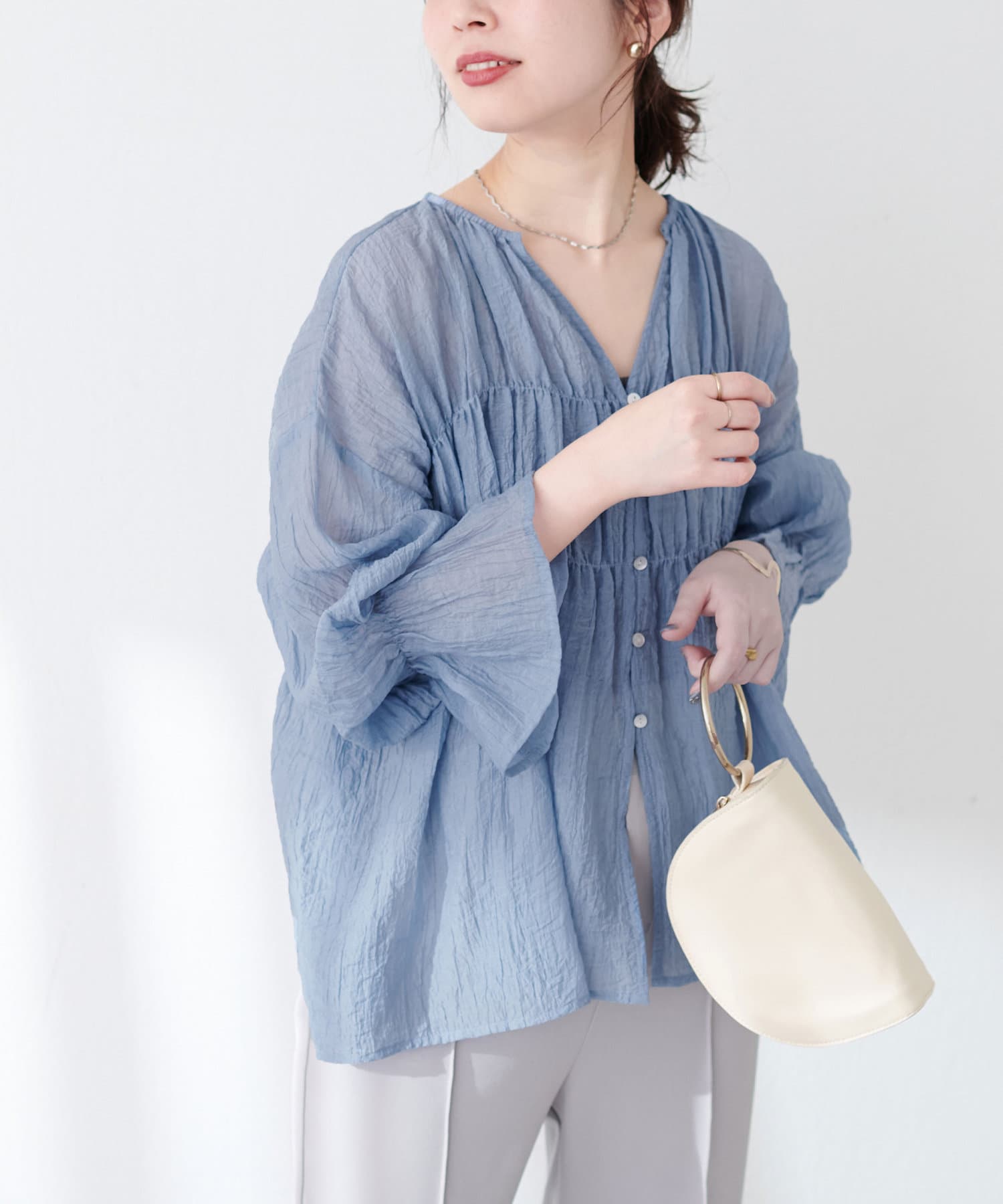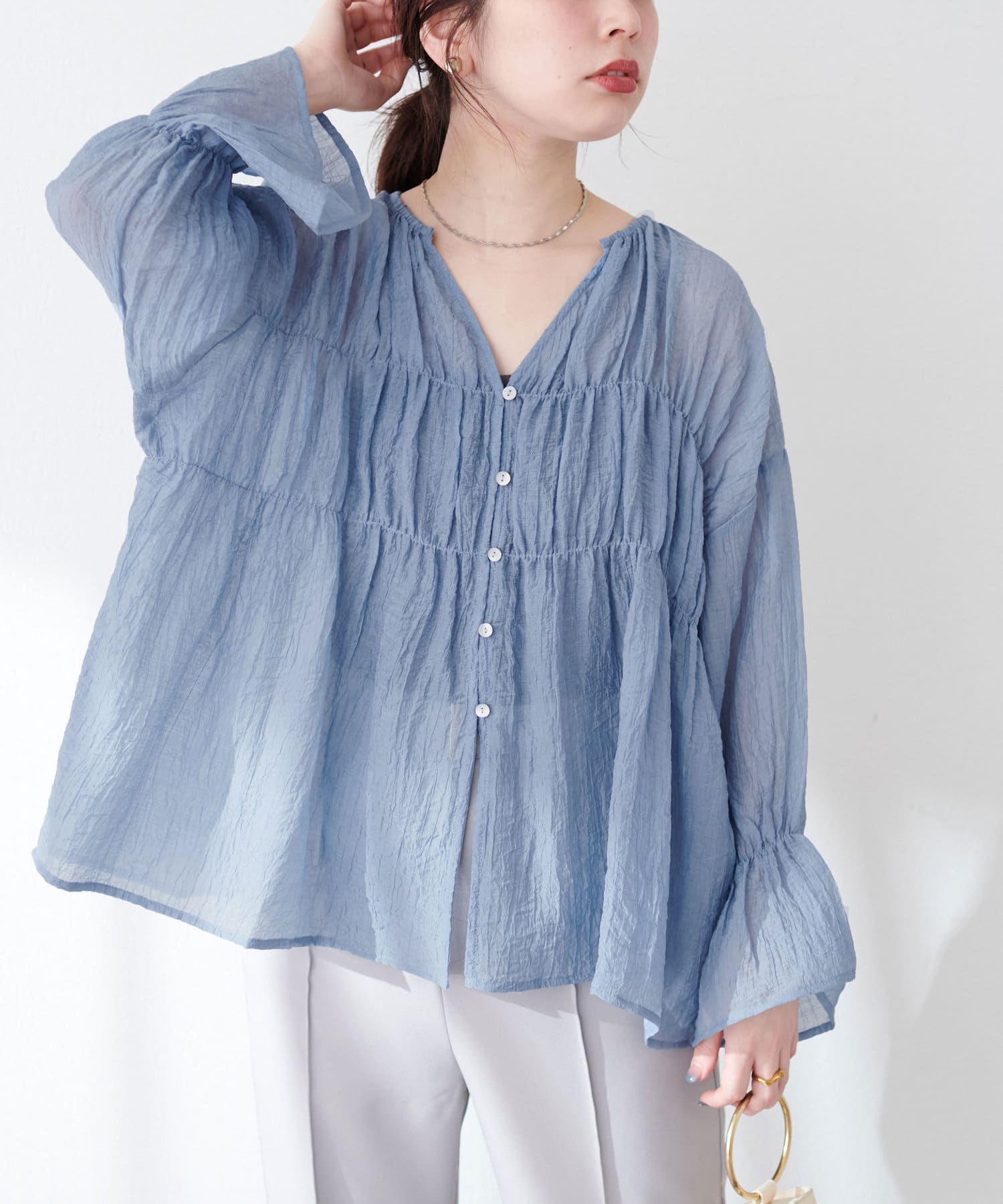 洗いざらしのような自然な風合いが魅力のシアーブラウス。