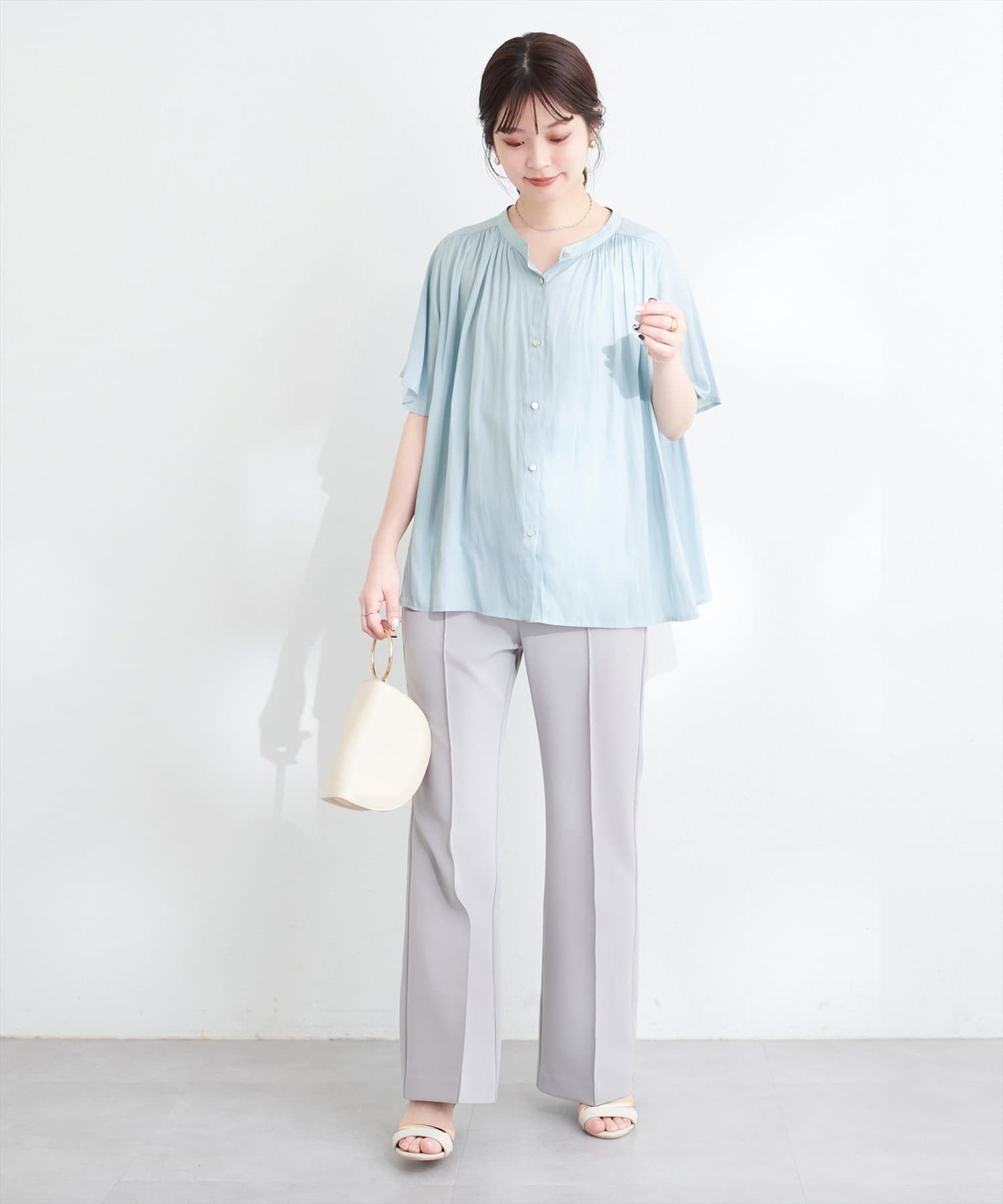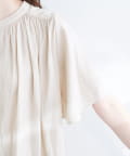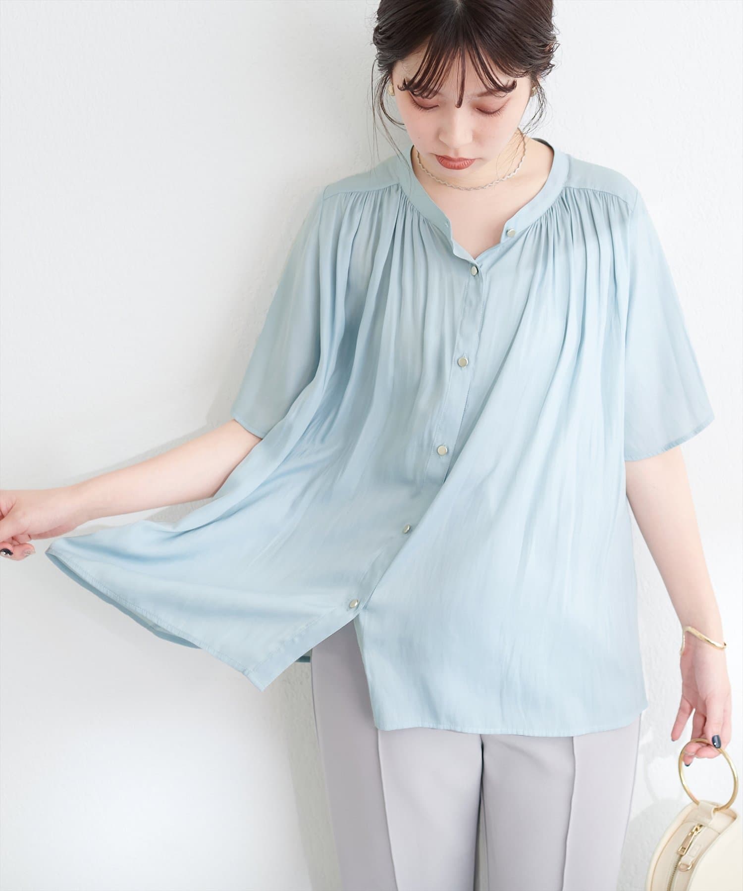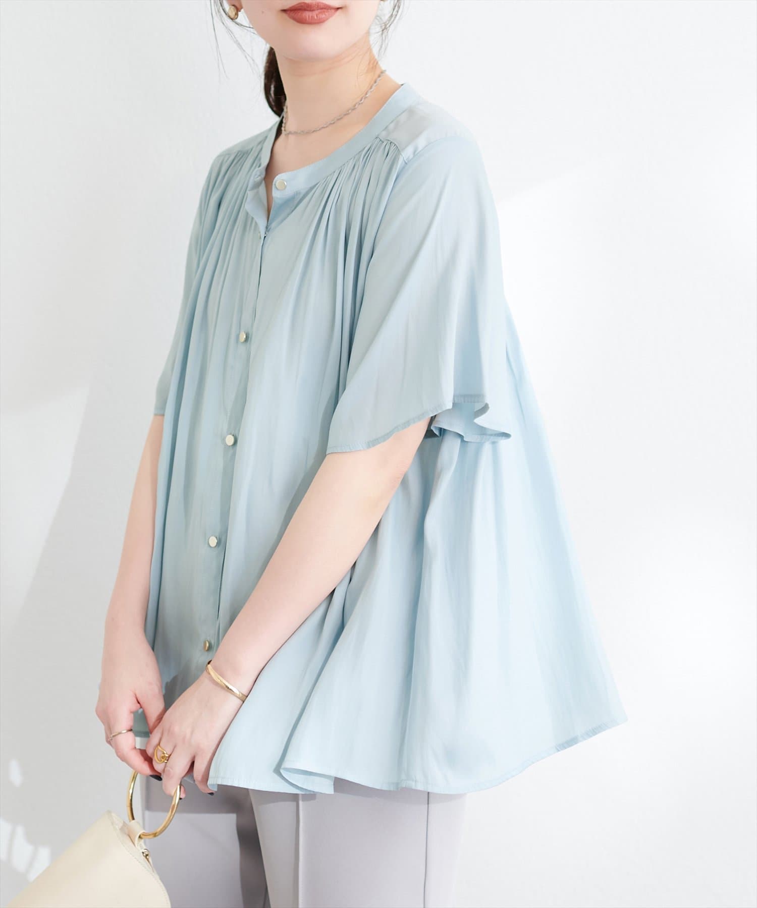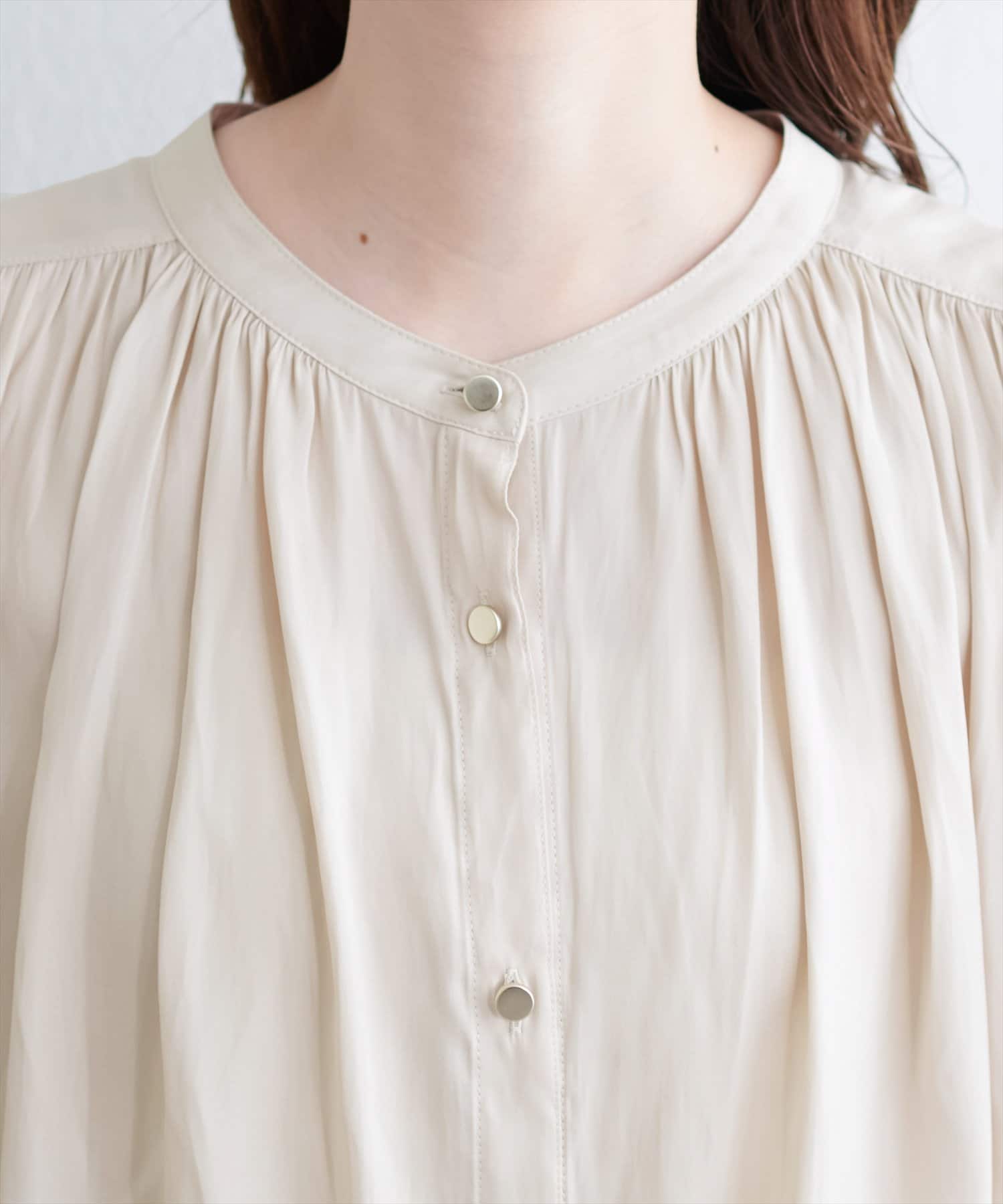 落ち感のあるとろみ素材と、たっぷりと施したギャザーが魅力のブラウス。