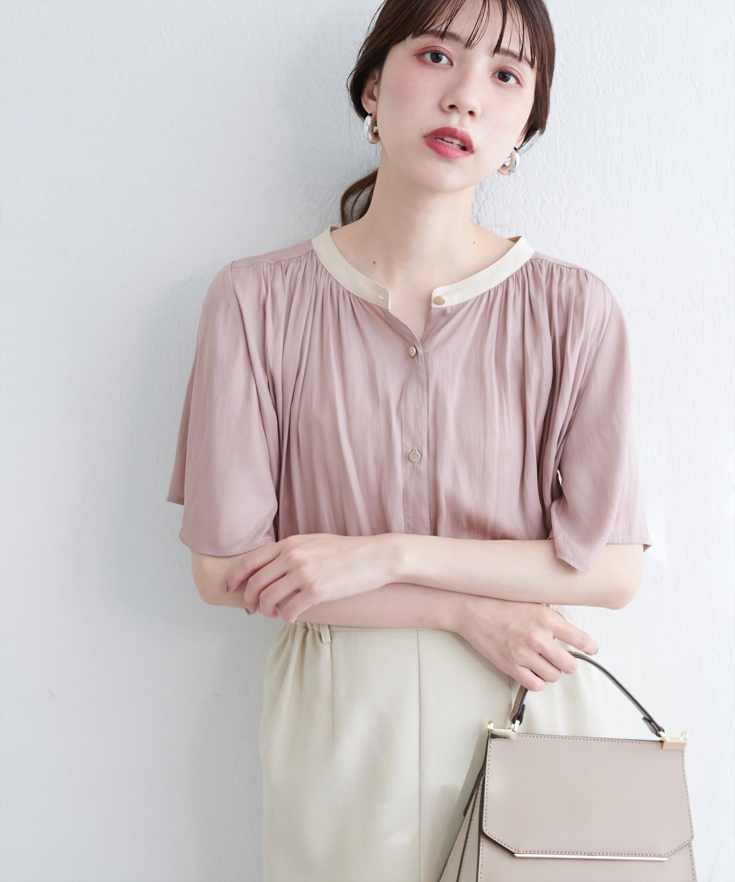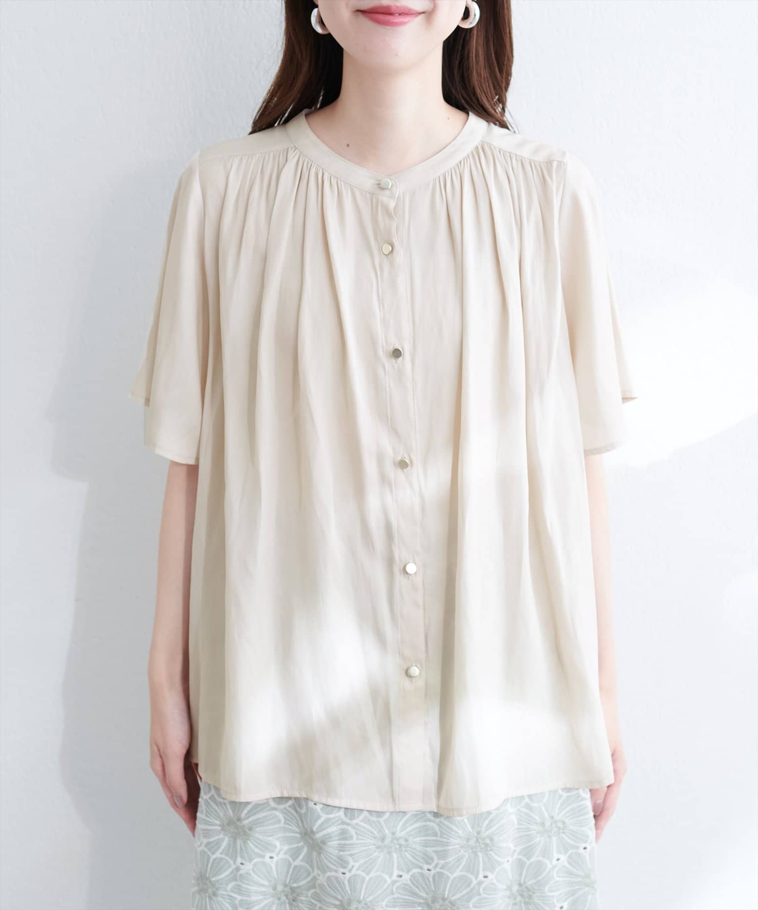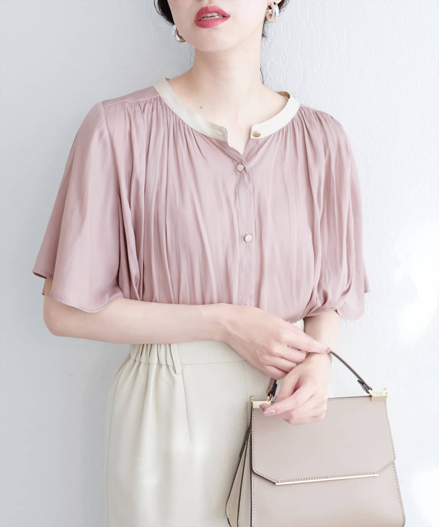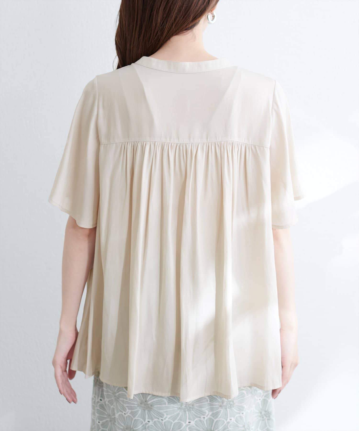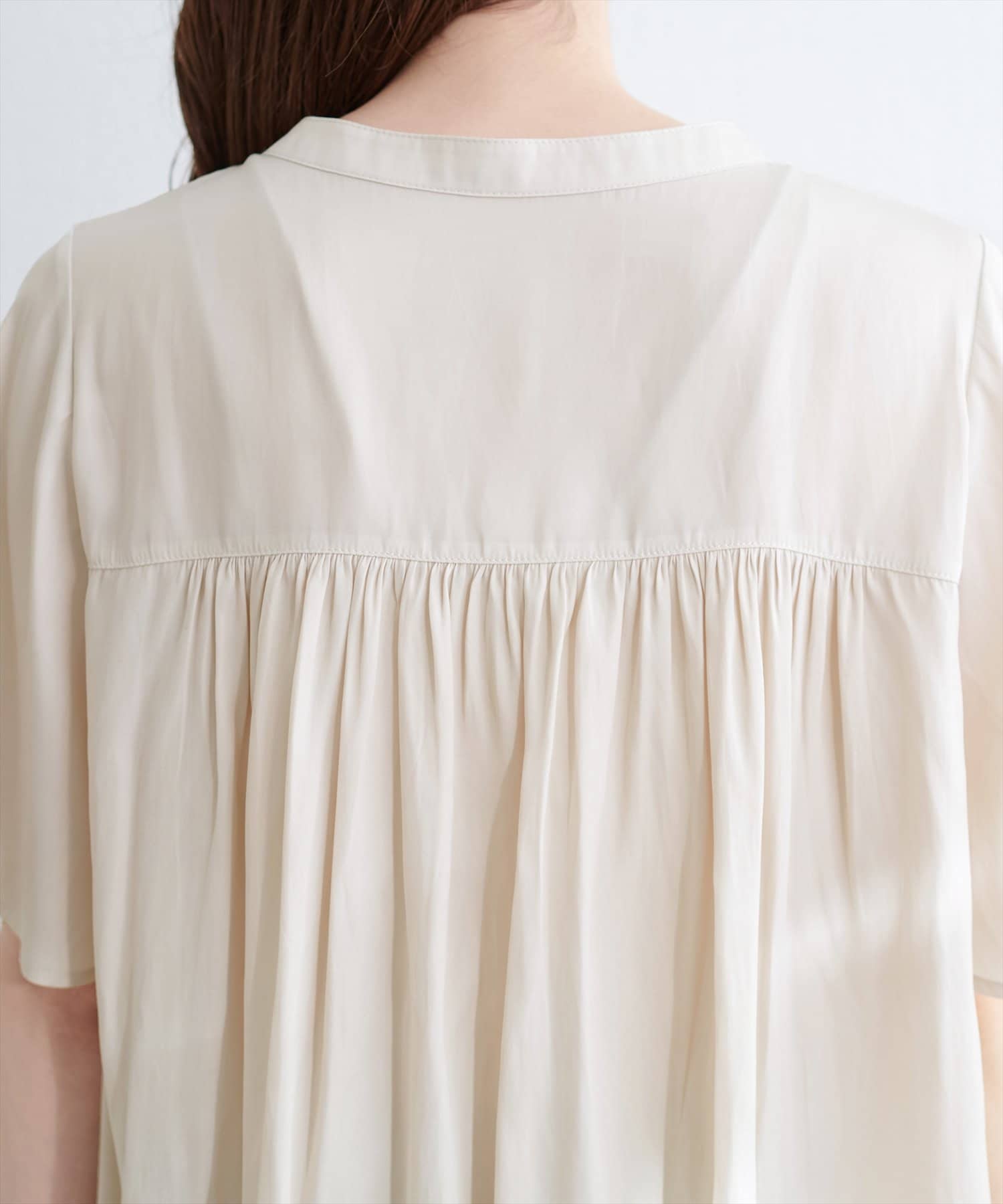 落ち感のあるとろみ素材と、たっぷりと施したギャザーが魅力のブラウス。
