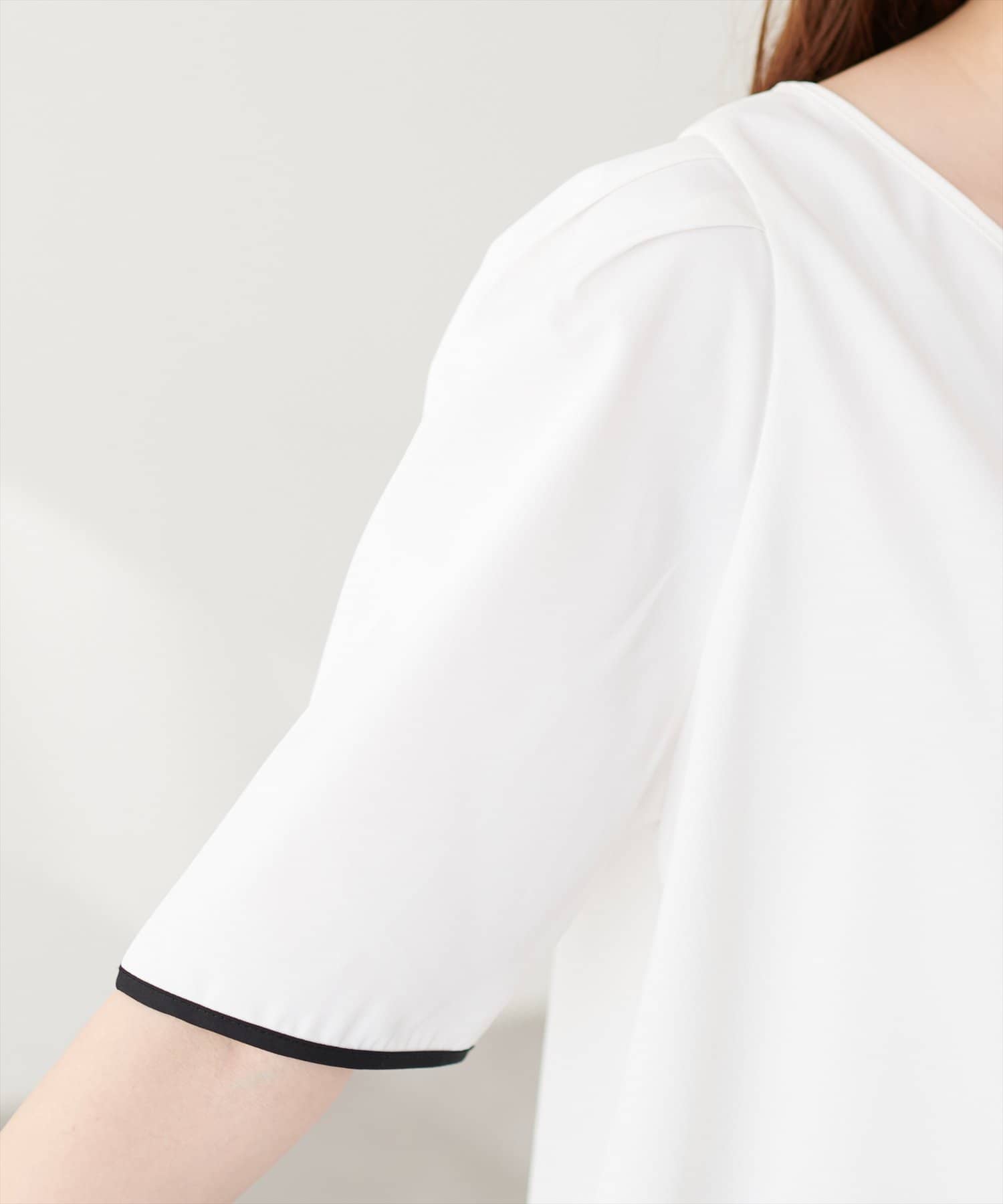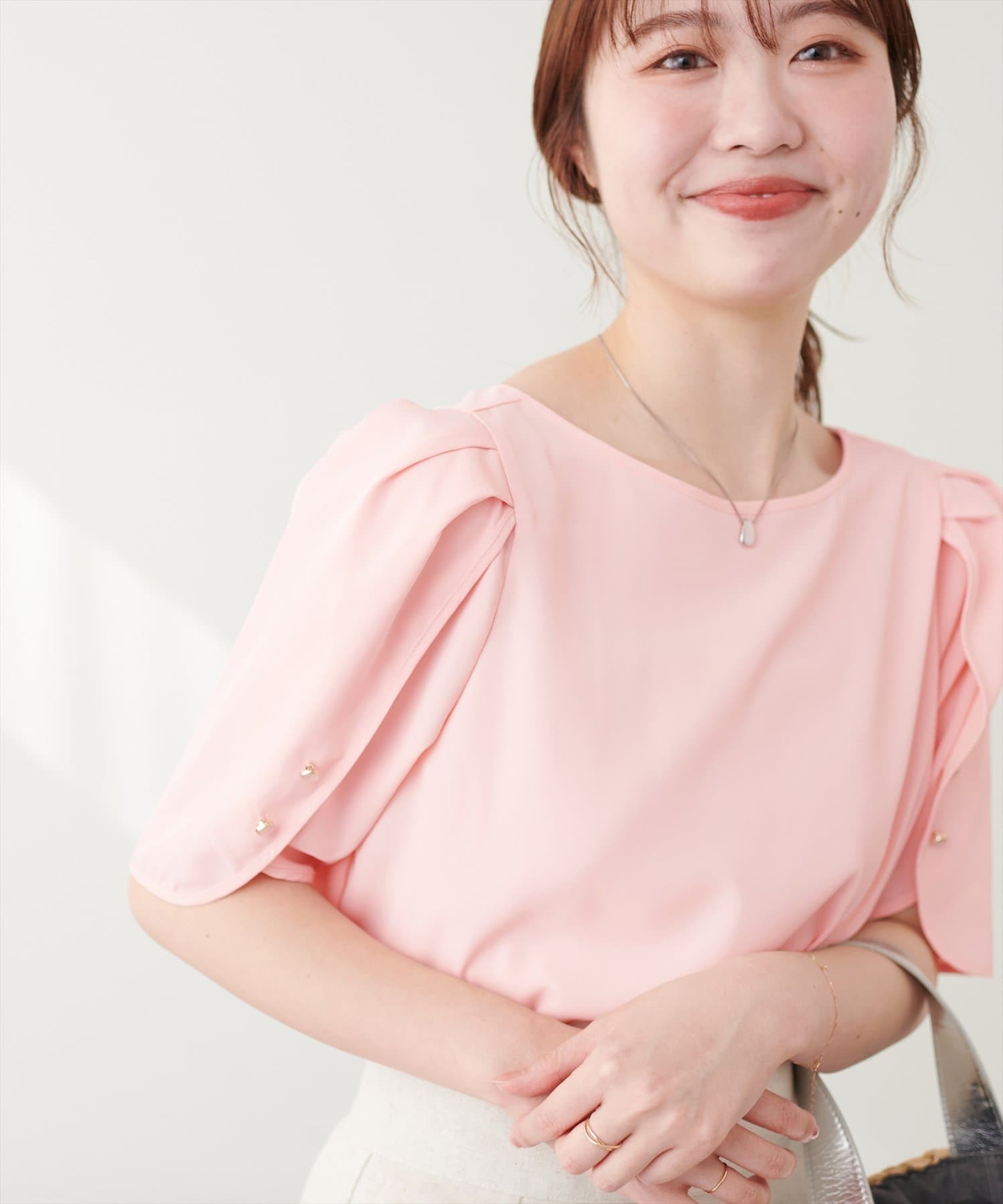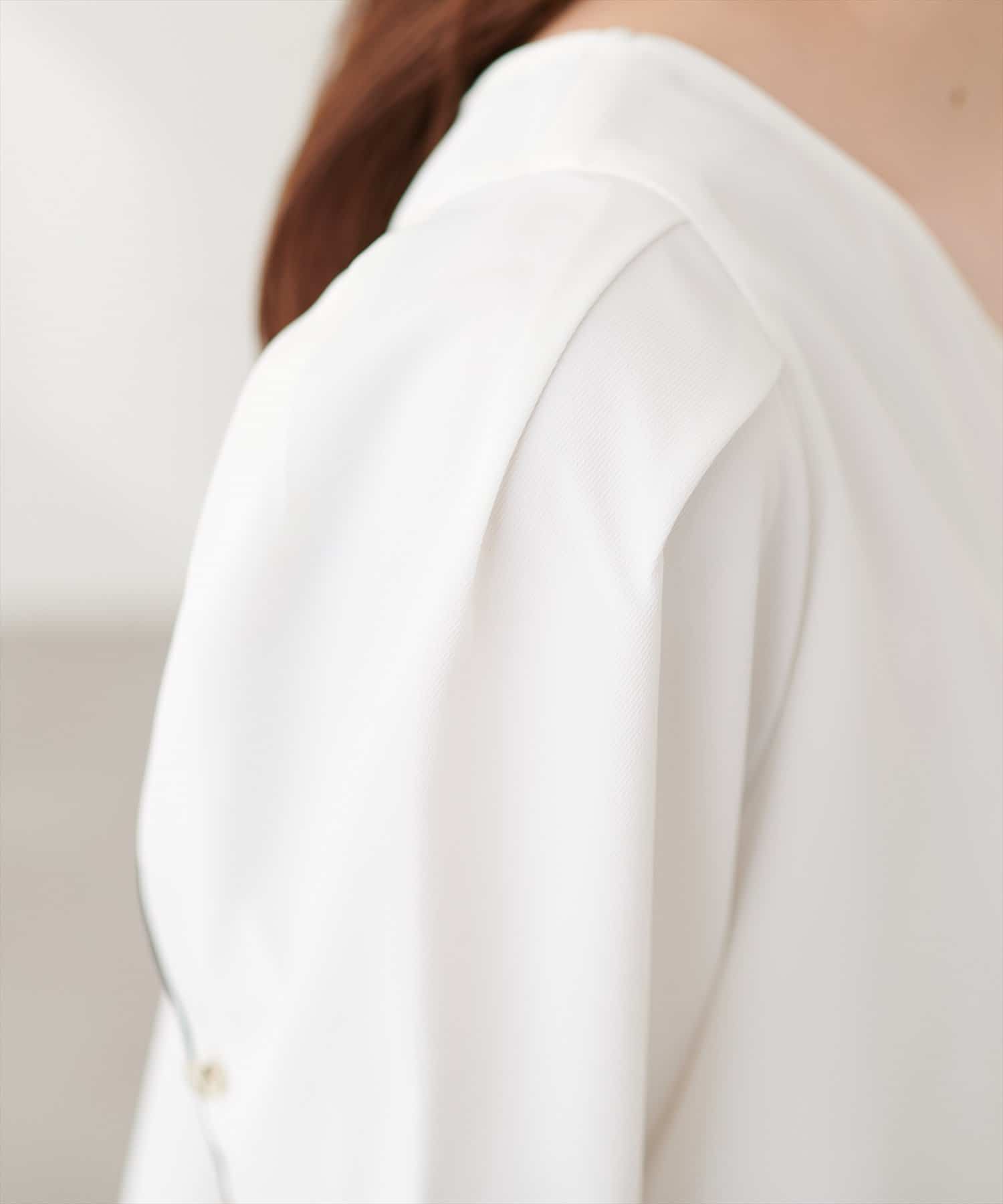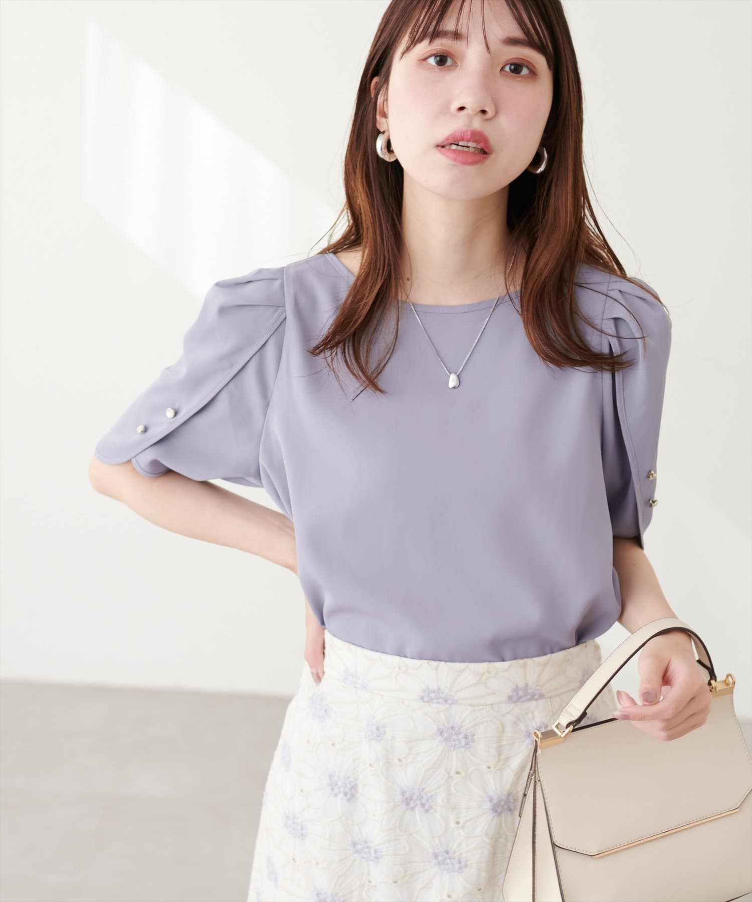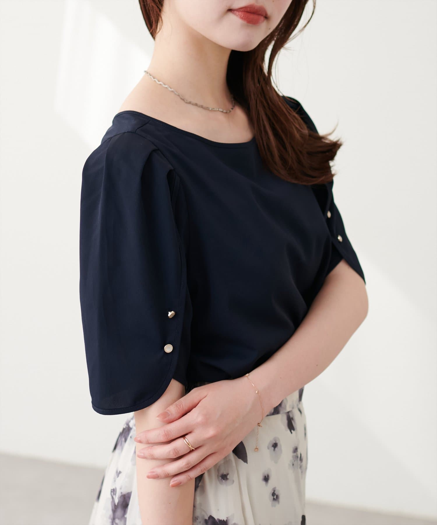少し二の腕にかかる袖丈と花びらのようなチューリップが、肩まわりを華奢に見せてくれつつ涼しげな印象にしてくれます。