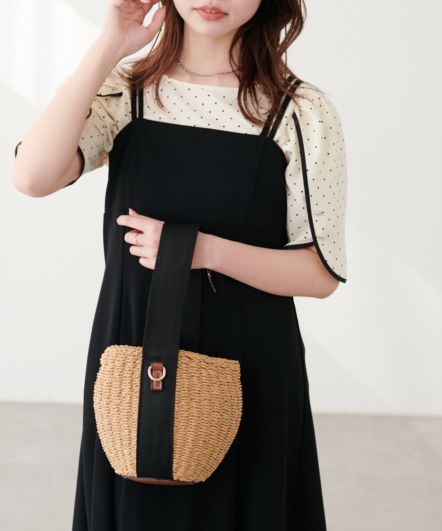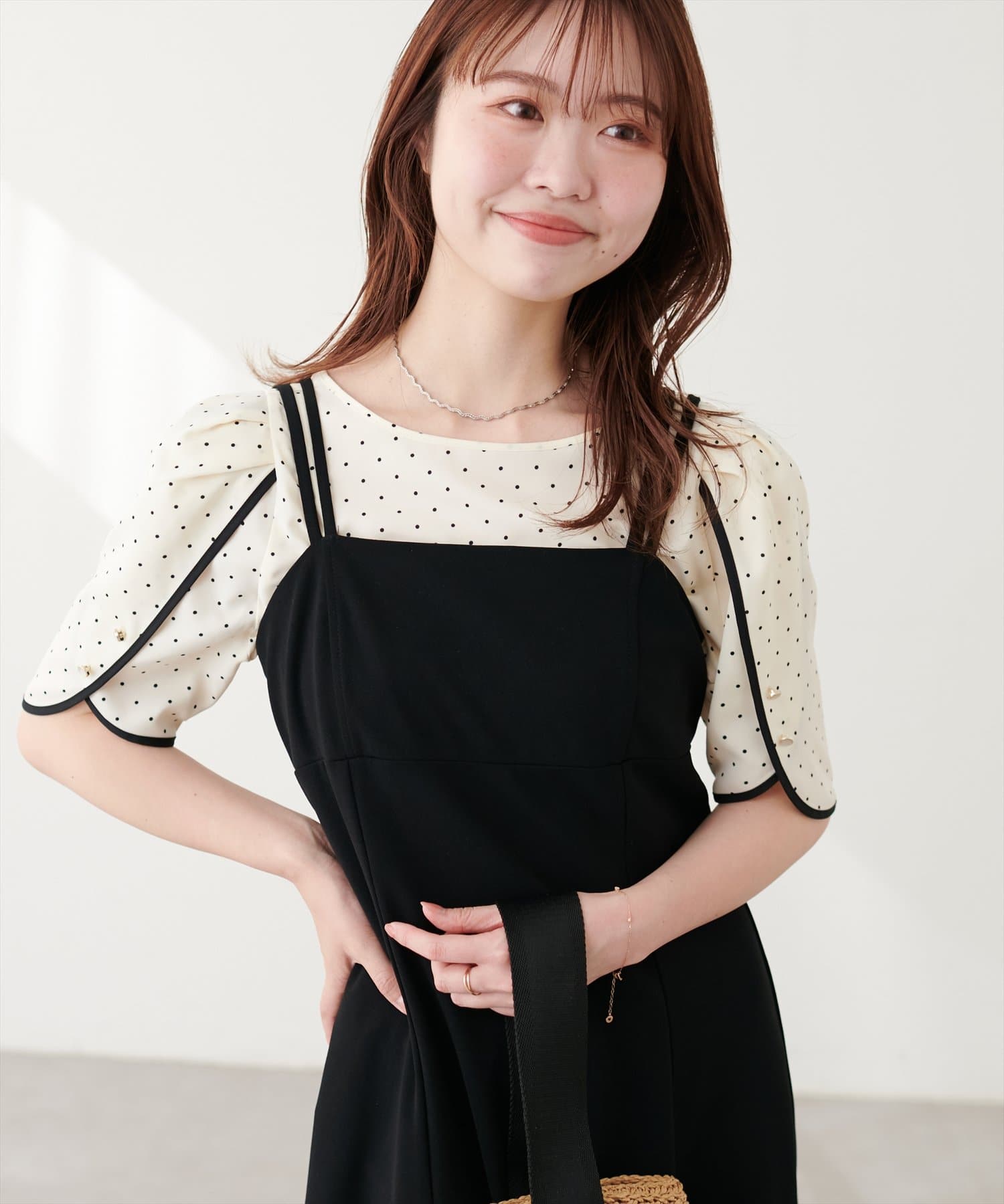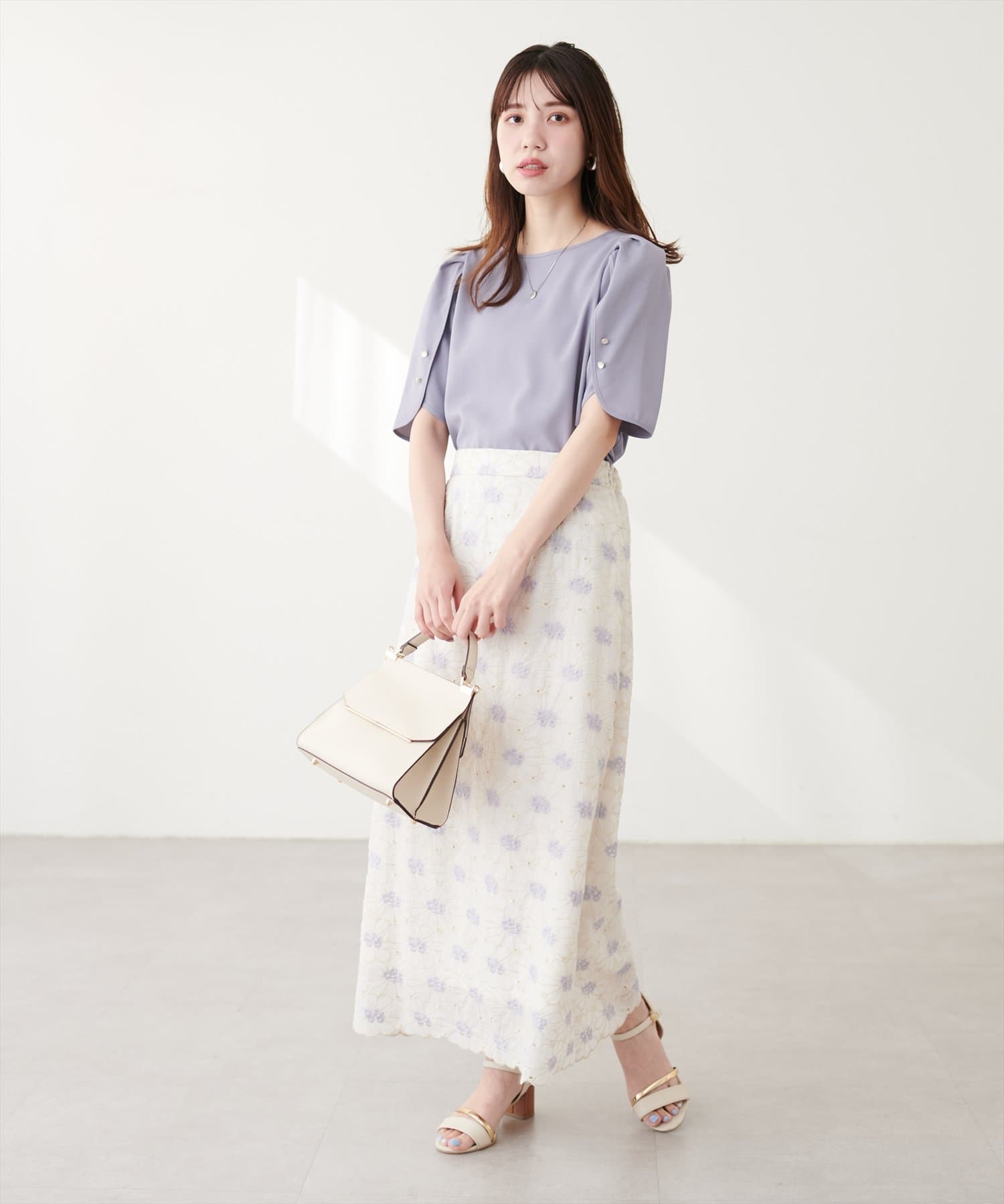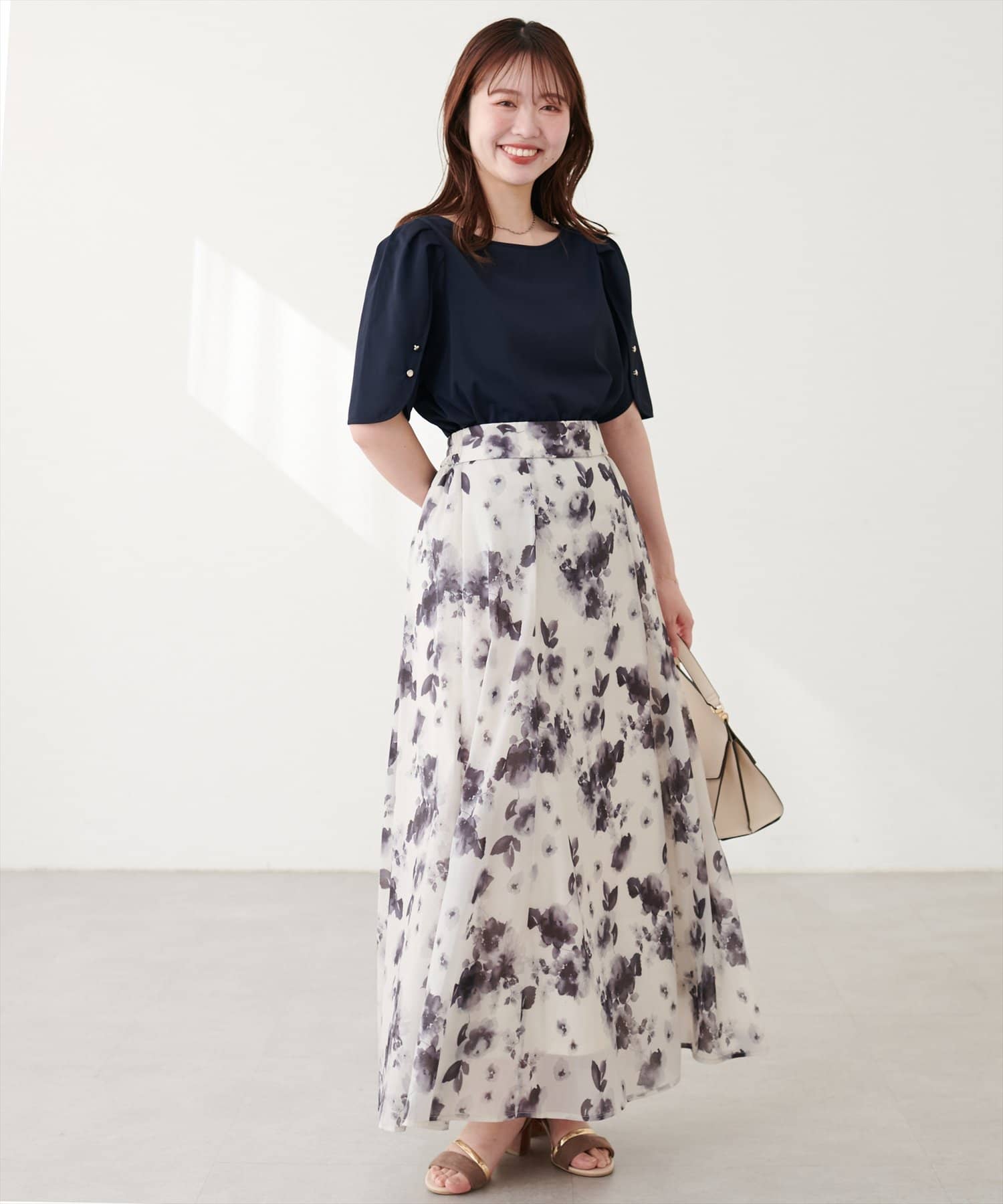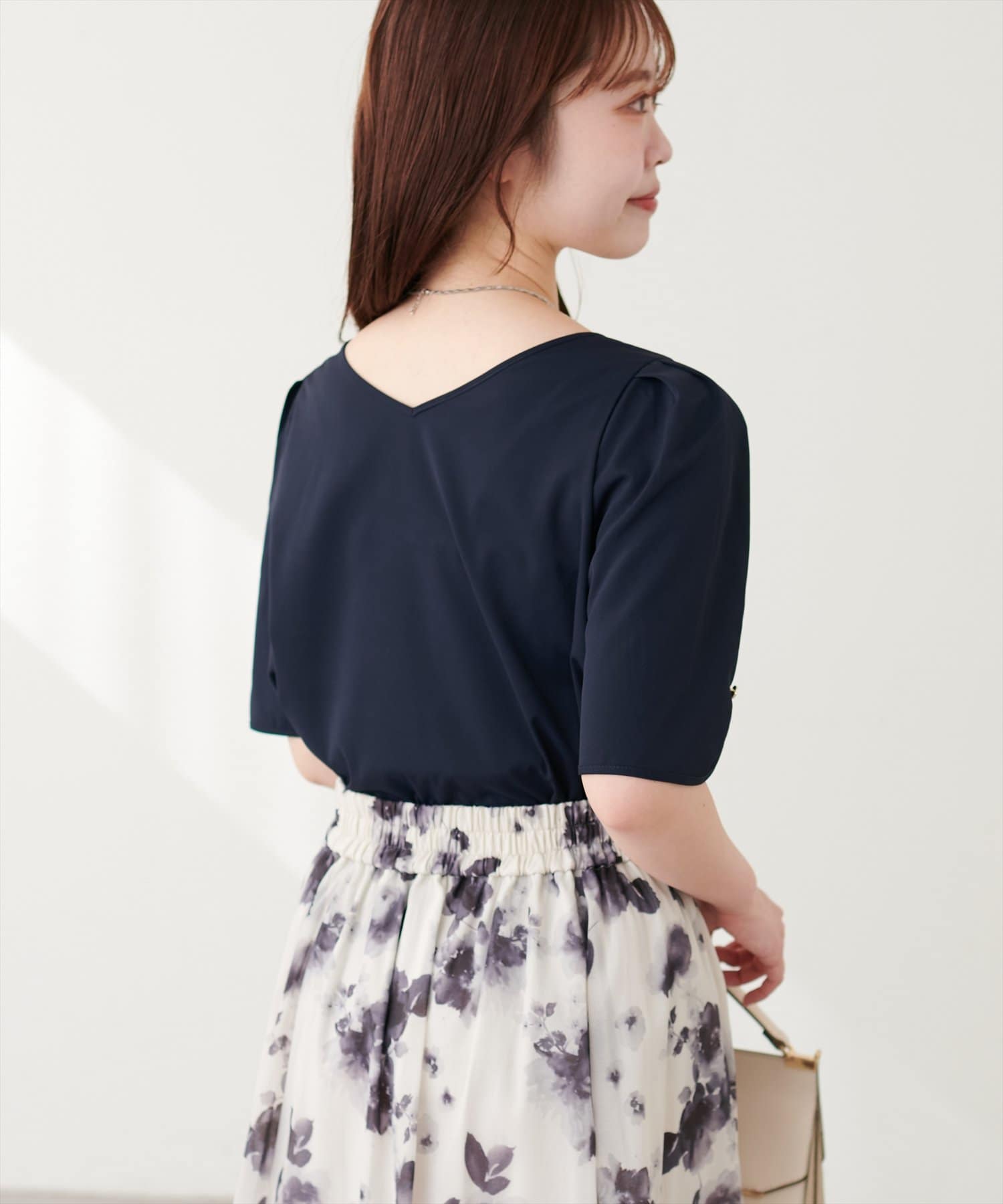 少し二の腕にかかる袖丈と花びらのようなチューリップが、肩まわりを華奢に見せてくれつつ涼しげな印象にしてくれます。
