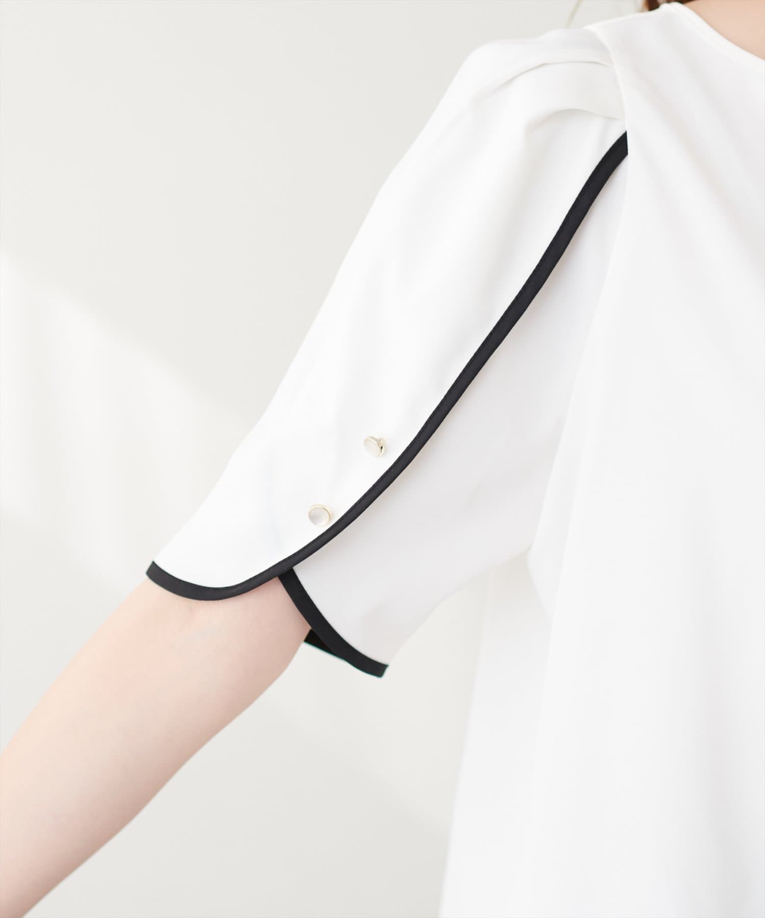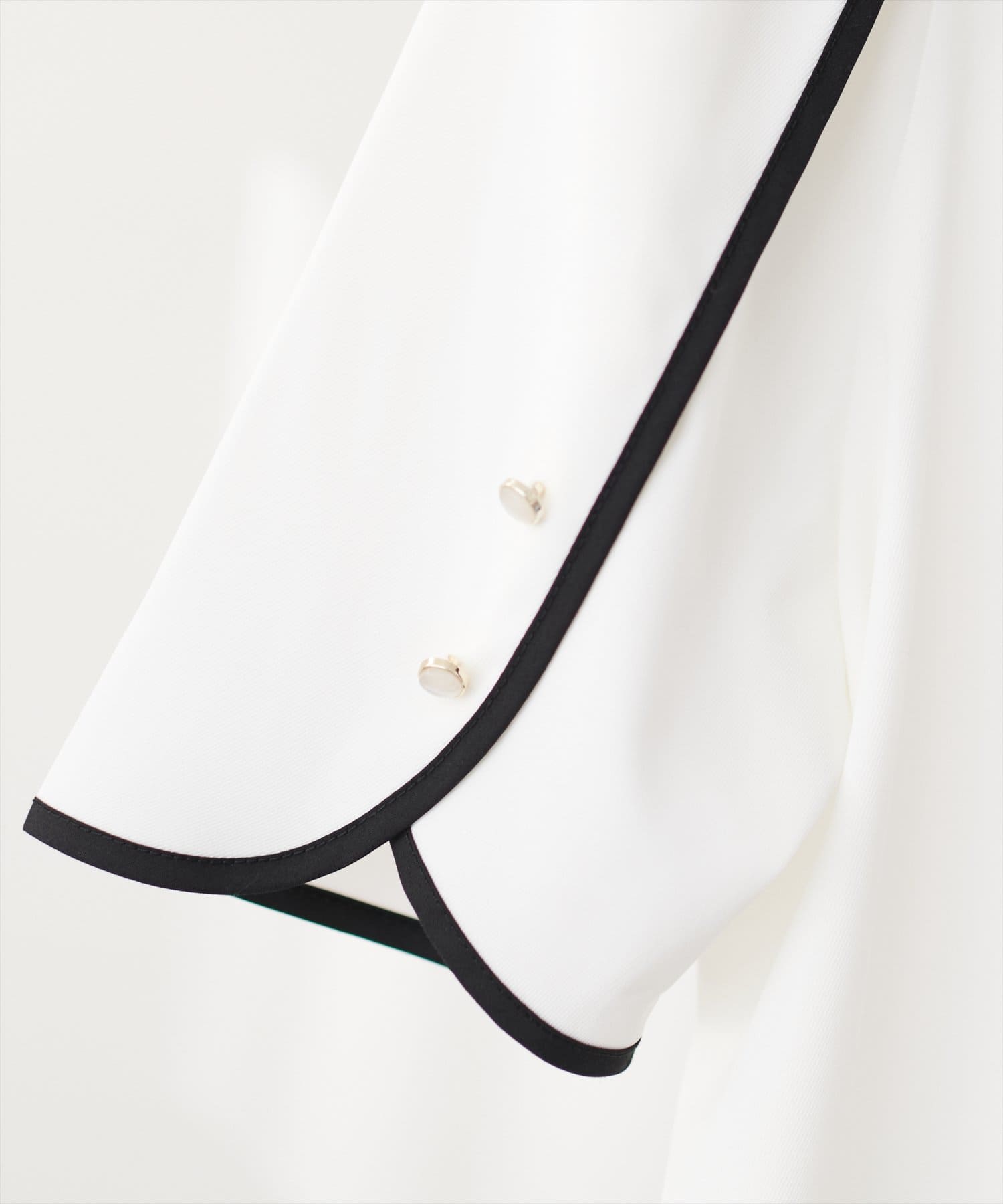 袖にはキラッとした金ぶちの乳白色ボタンが施されており、無地でも目を惹くデザイン。