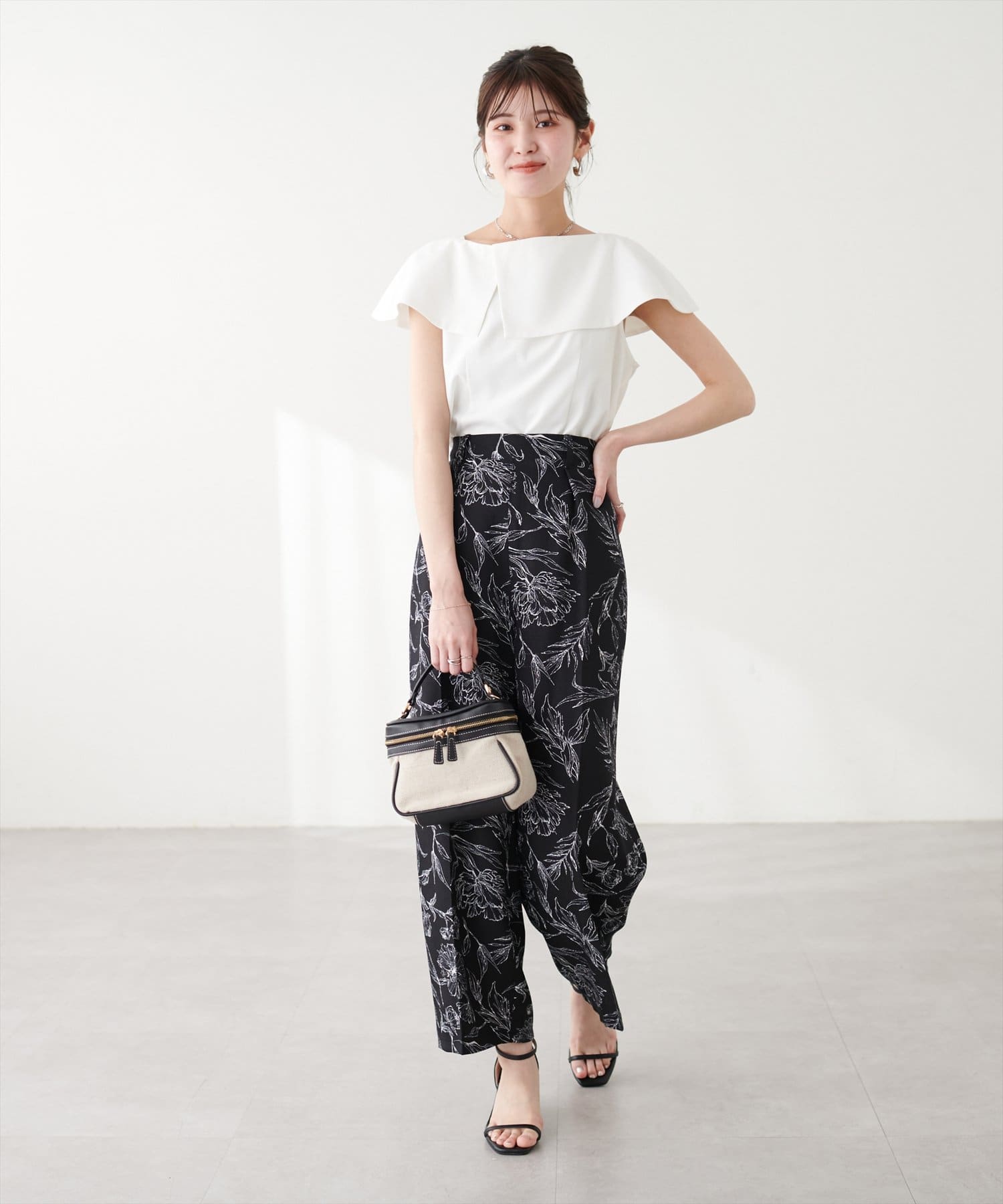 1枚で存在感のあるデザインなので、ボトムはシンプルなアイテムを選ぶとすっきりとまとまります。