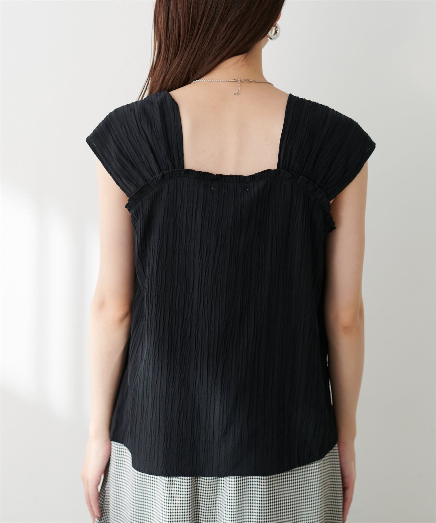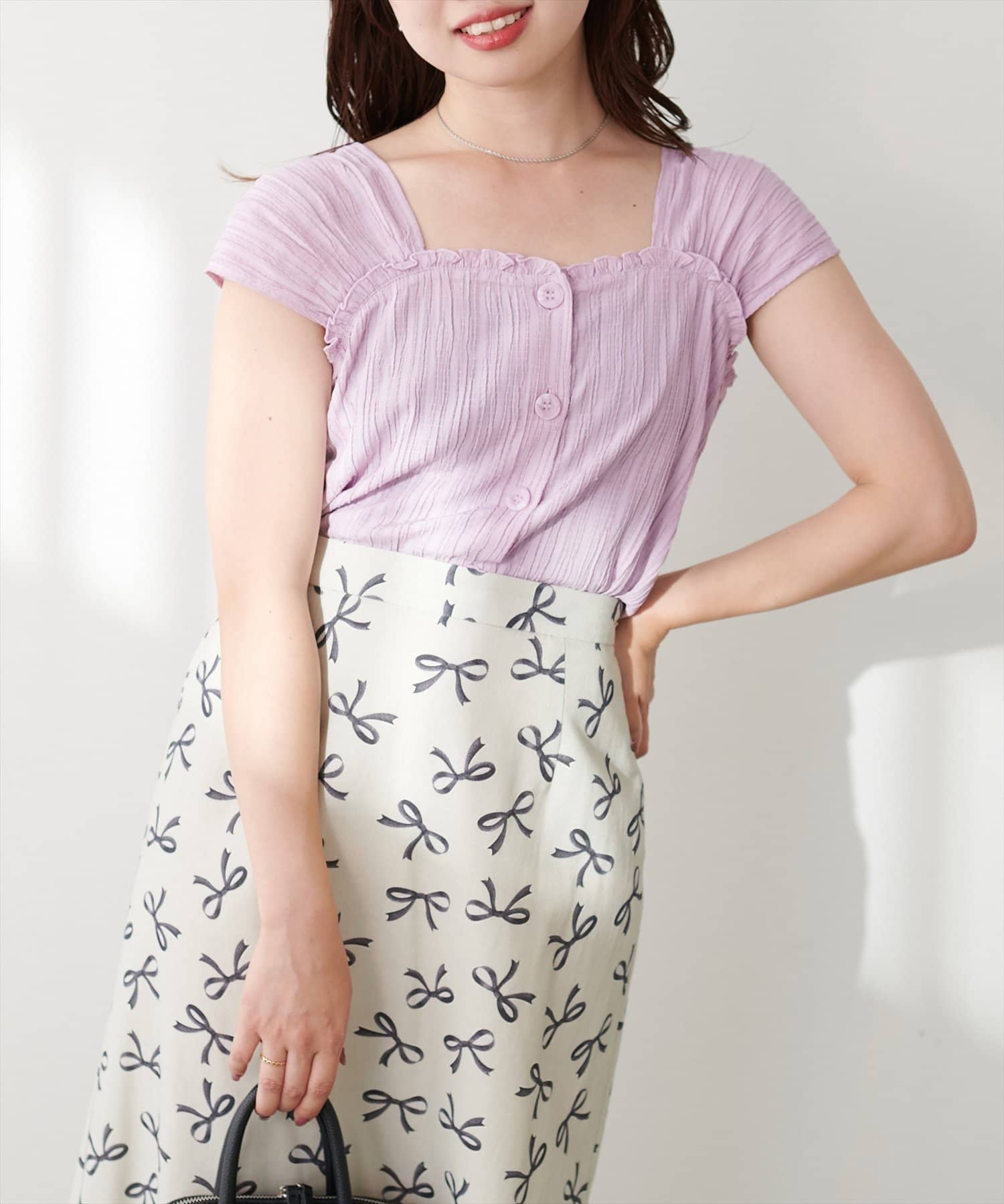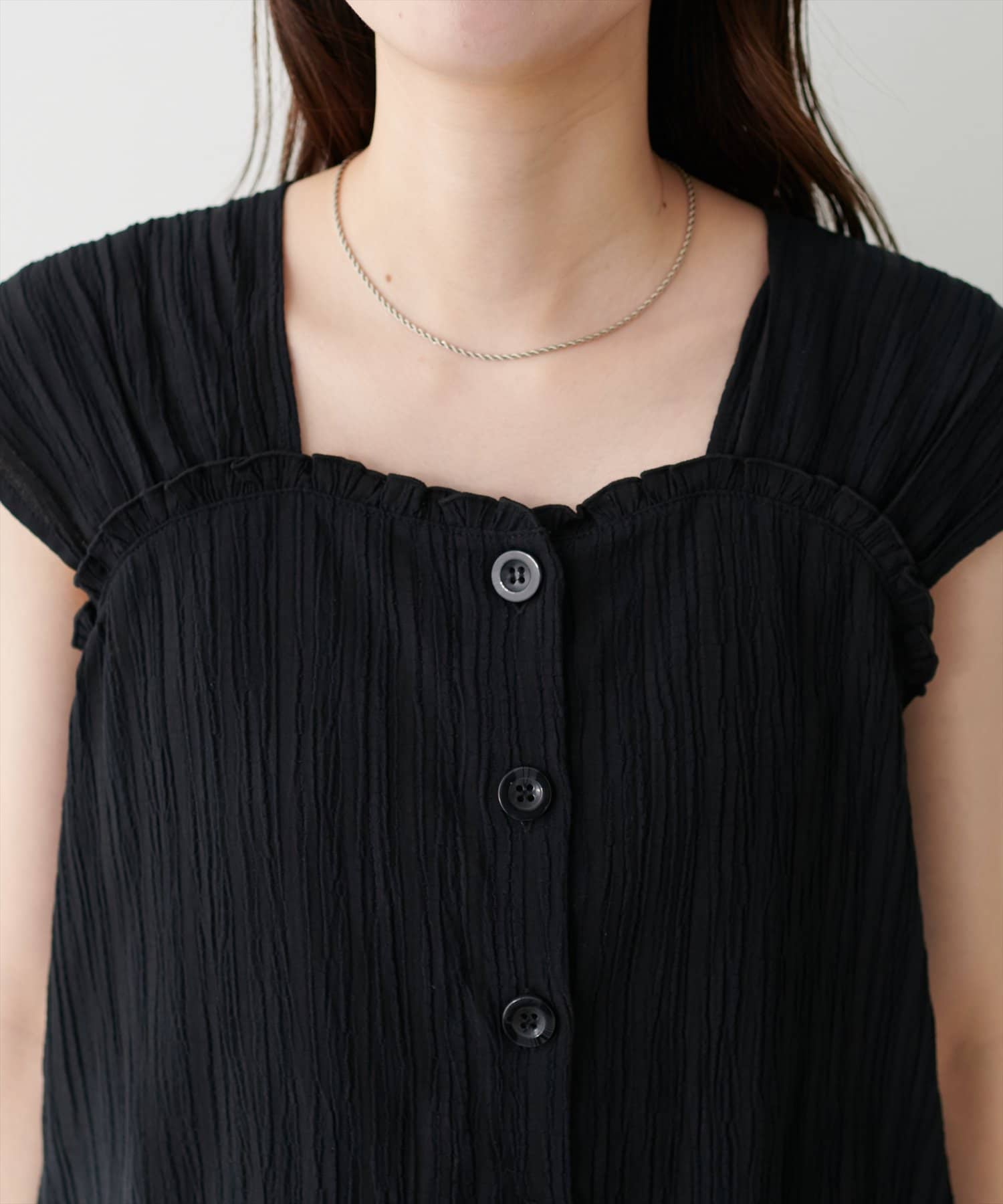 また、胸元のフリルは甘すぎないメロー始末で大人の女性にピッタリの1枚。