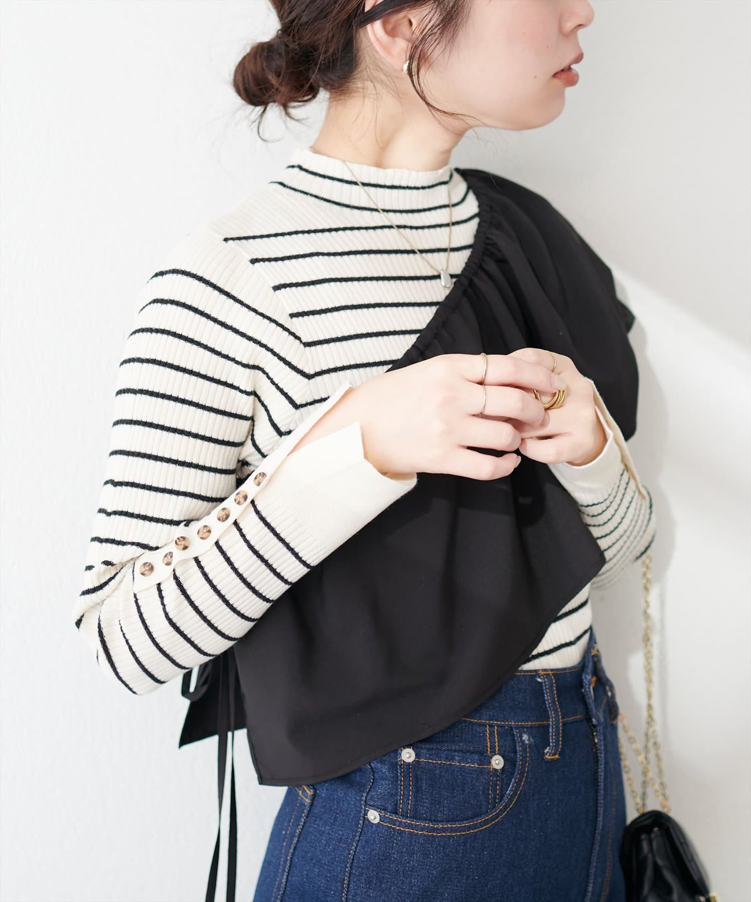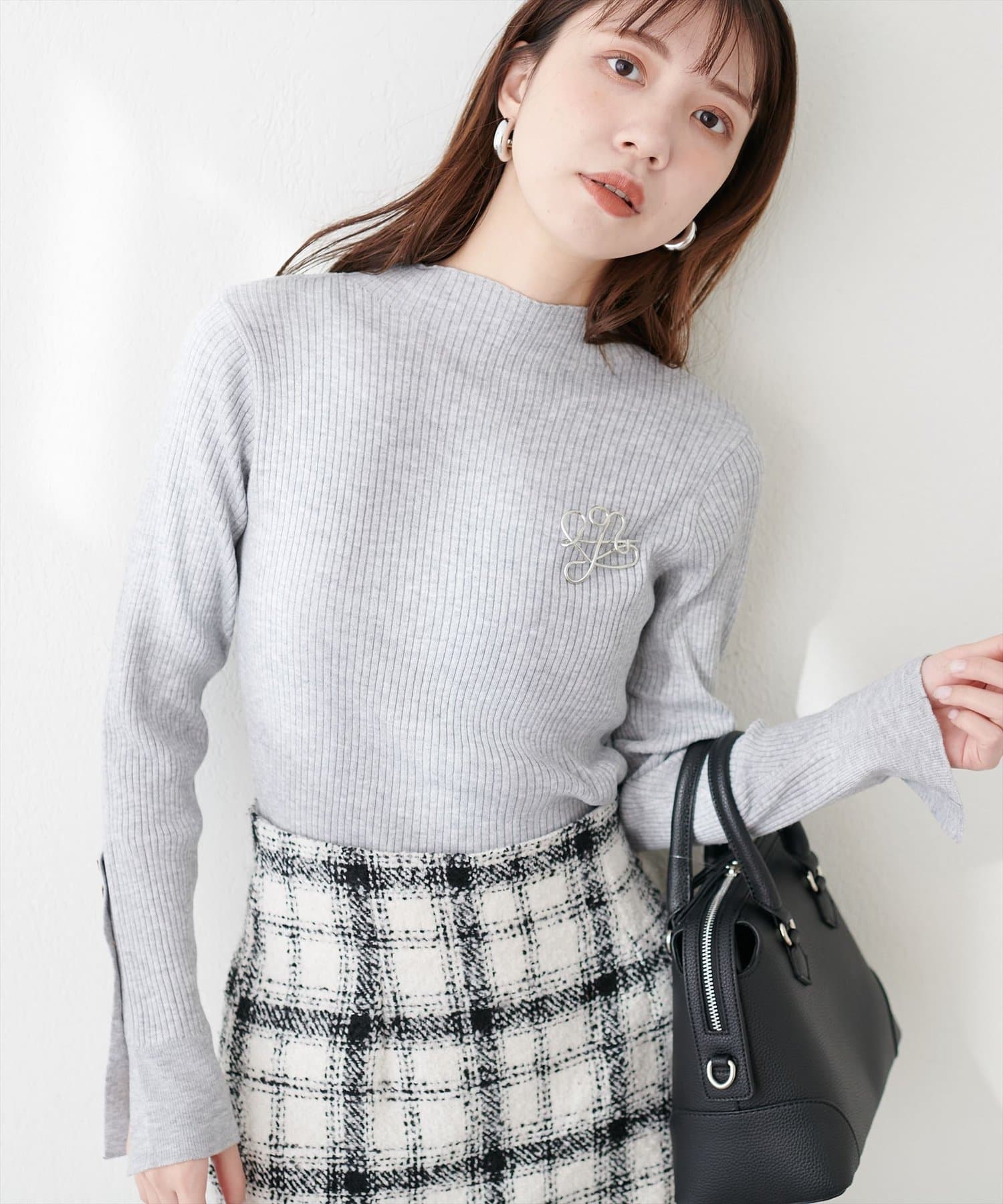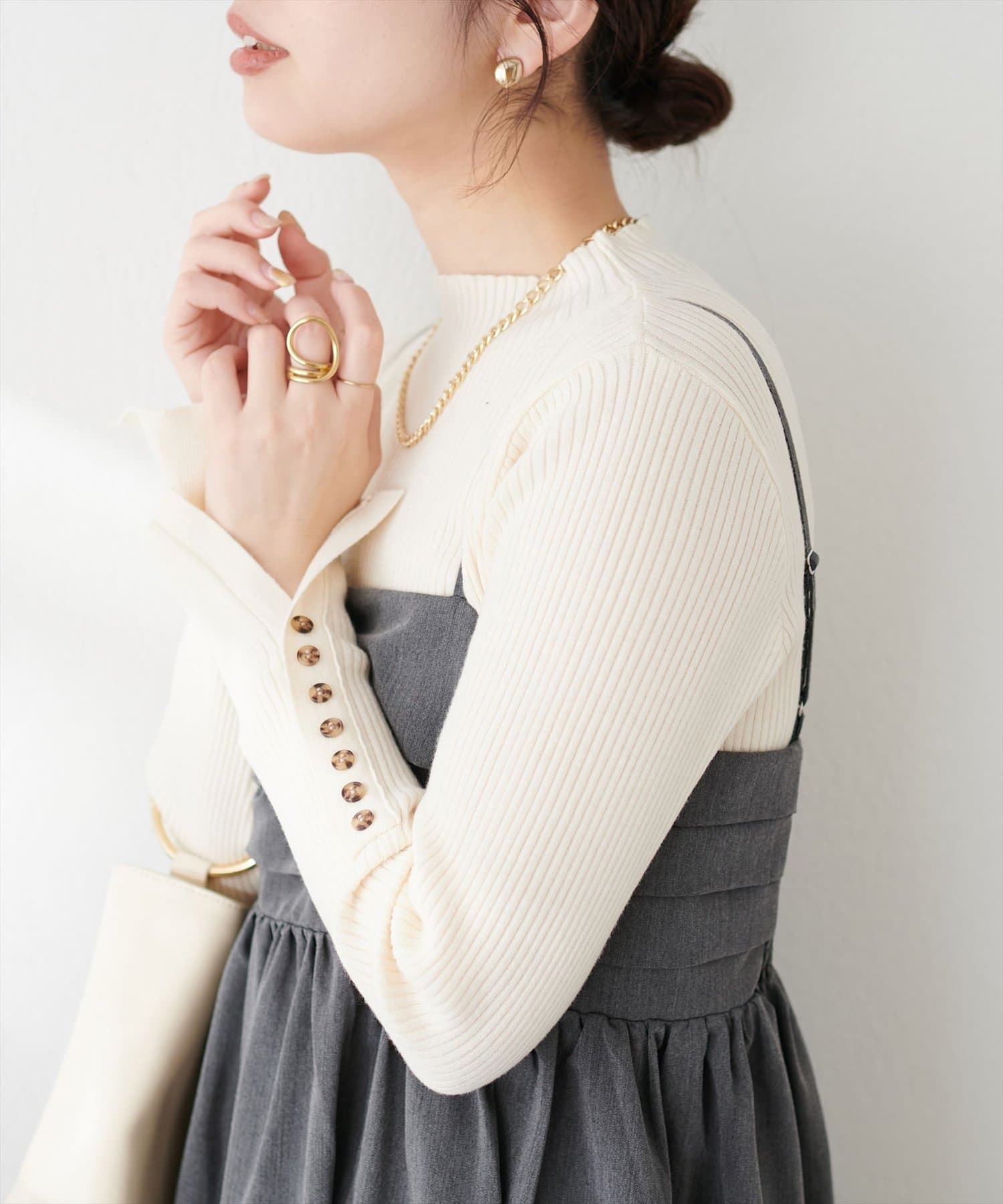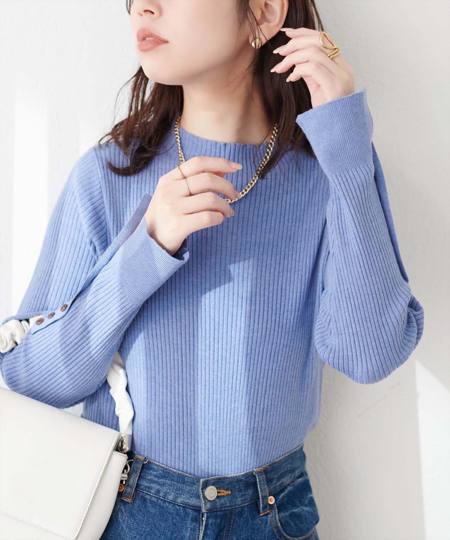 オンオフ問わず活躍する袖口ちび釦プチハイリブニット
