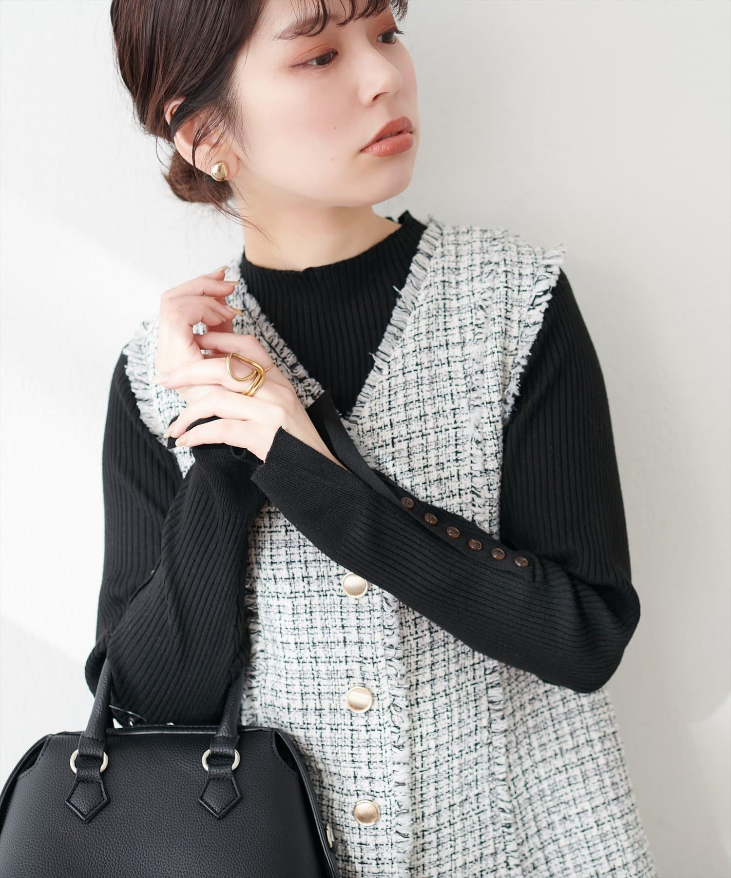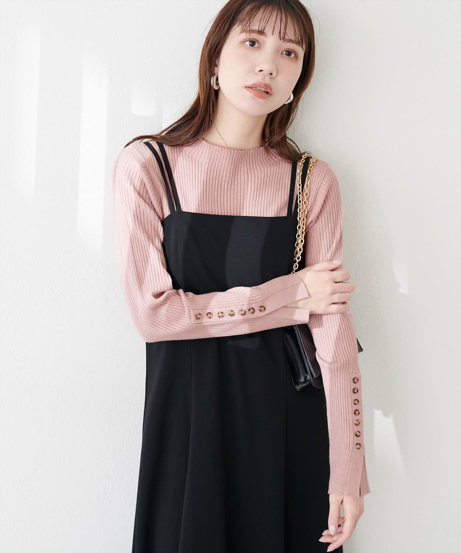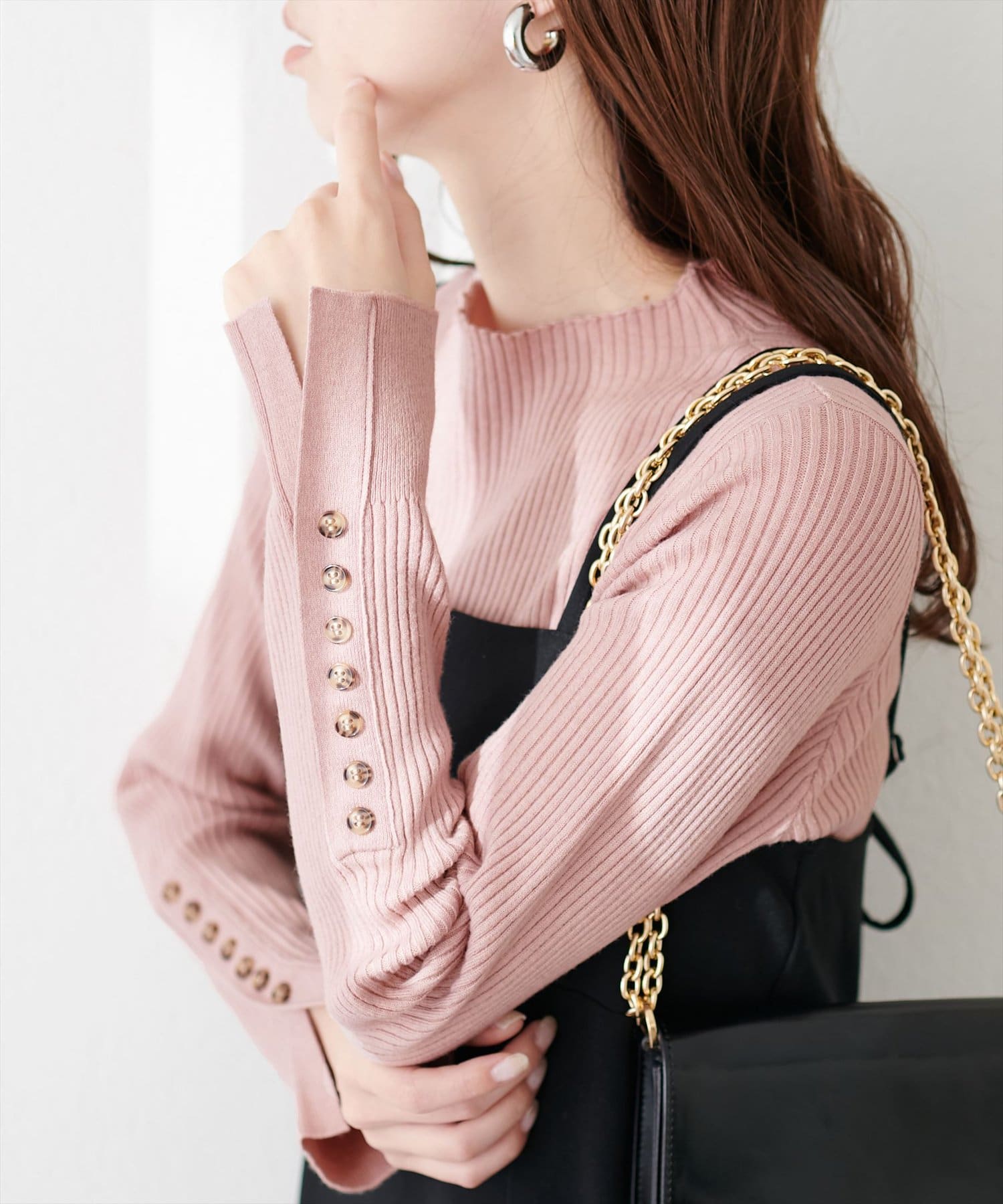 ナチュラルに高見えするべっ甲釦を袖に施した、もちもち素材のハイネックリブニット。