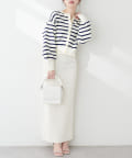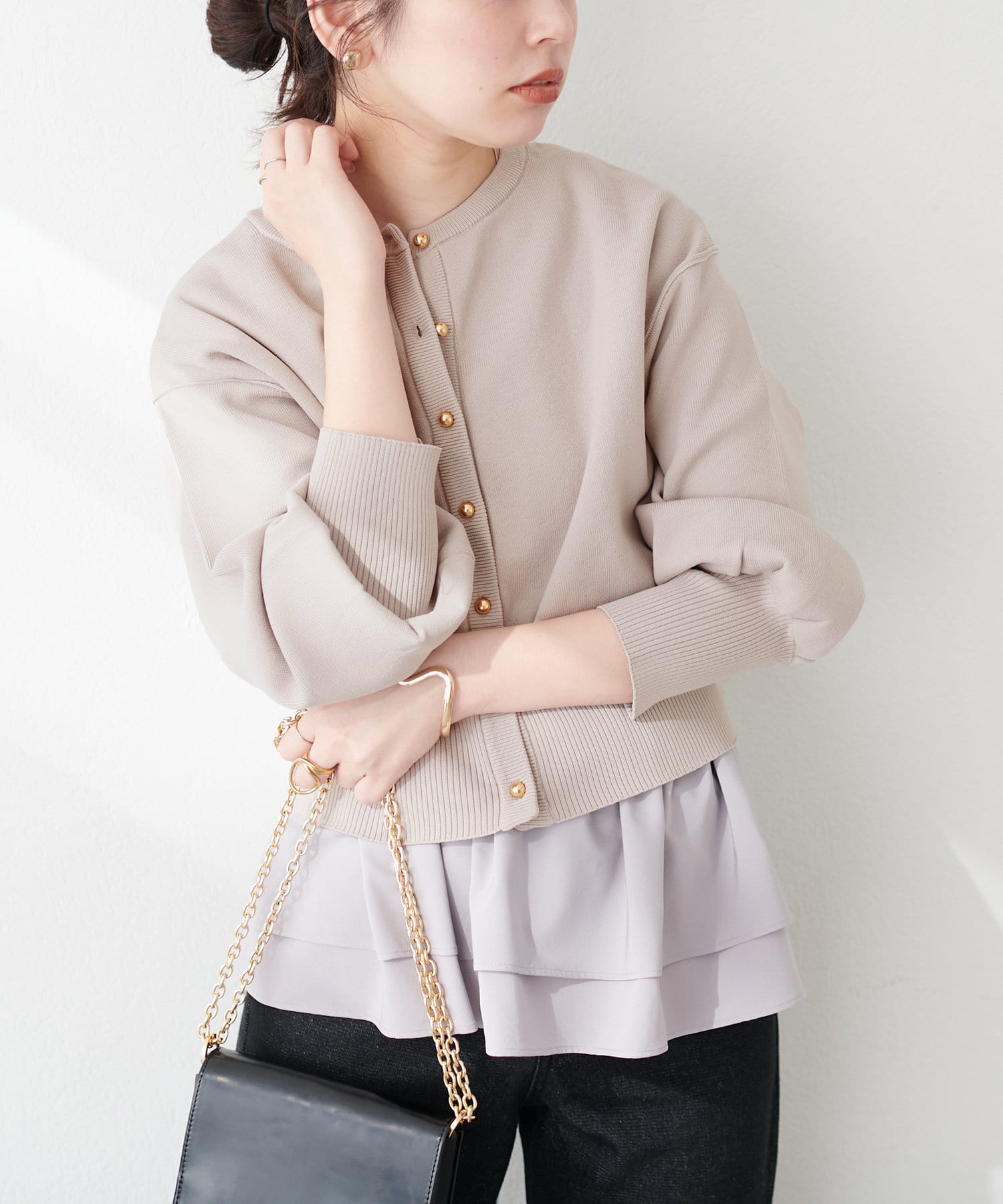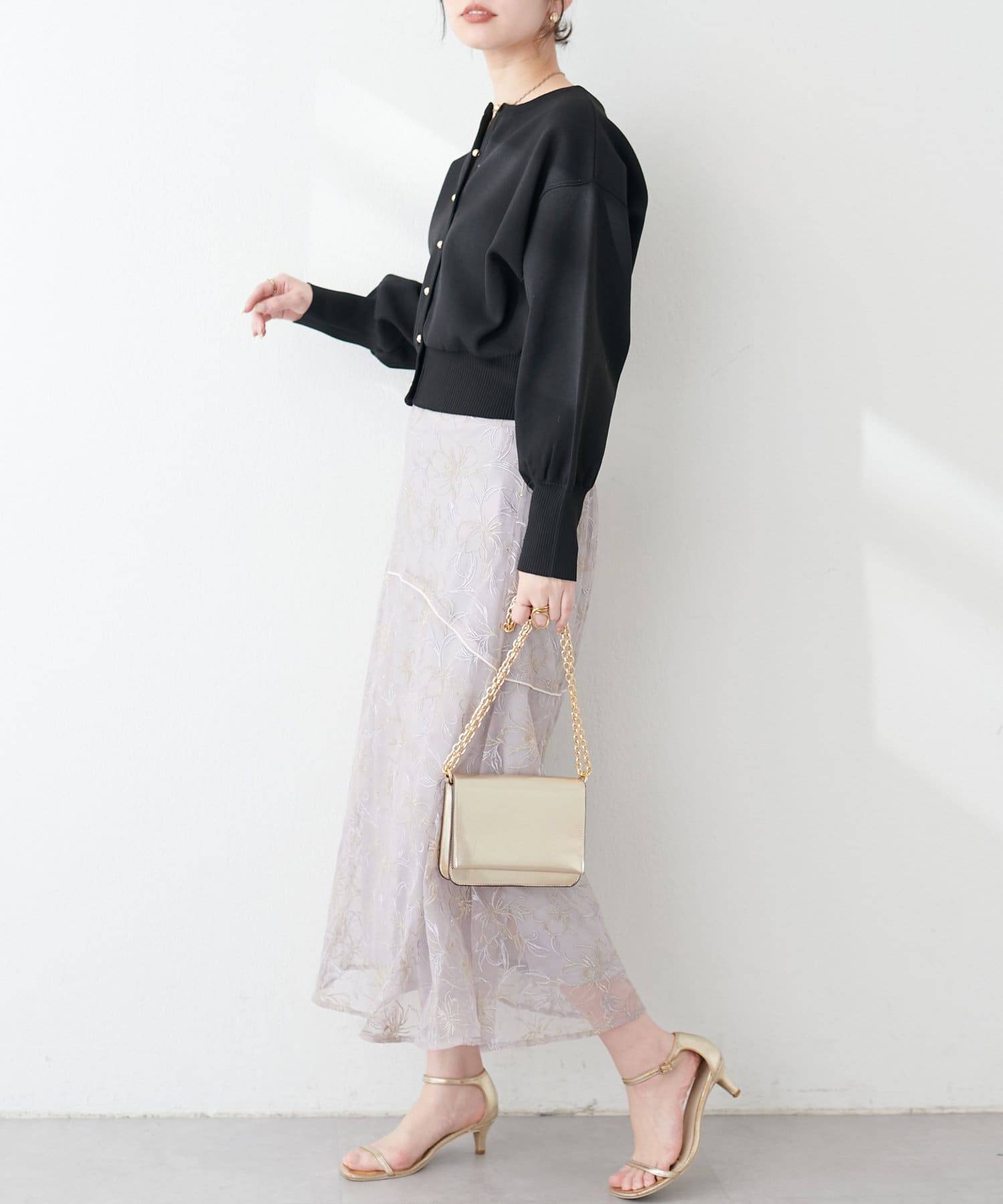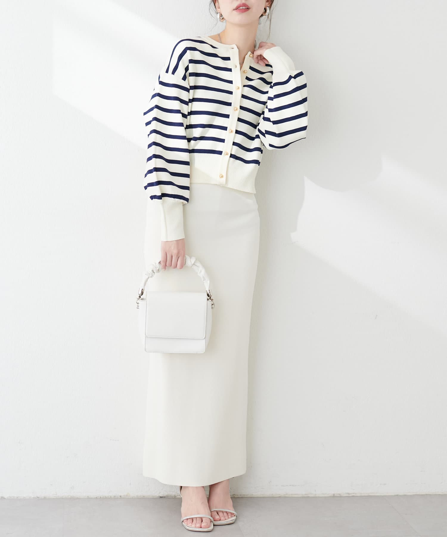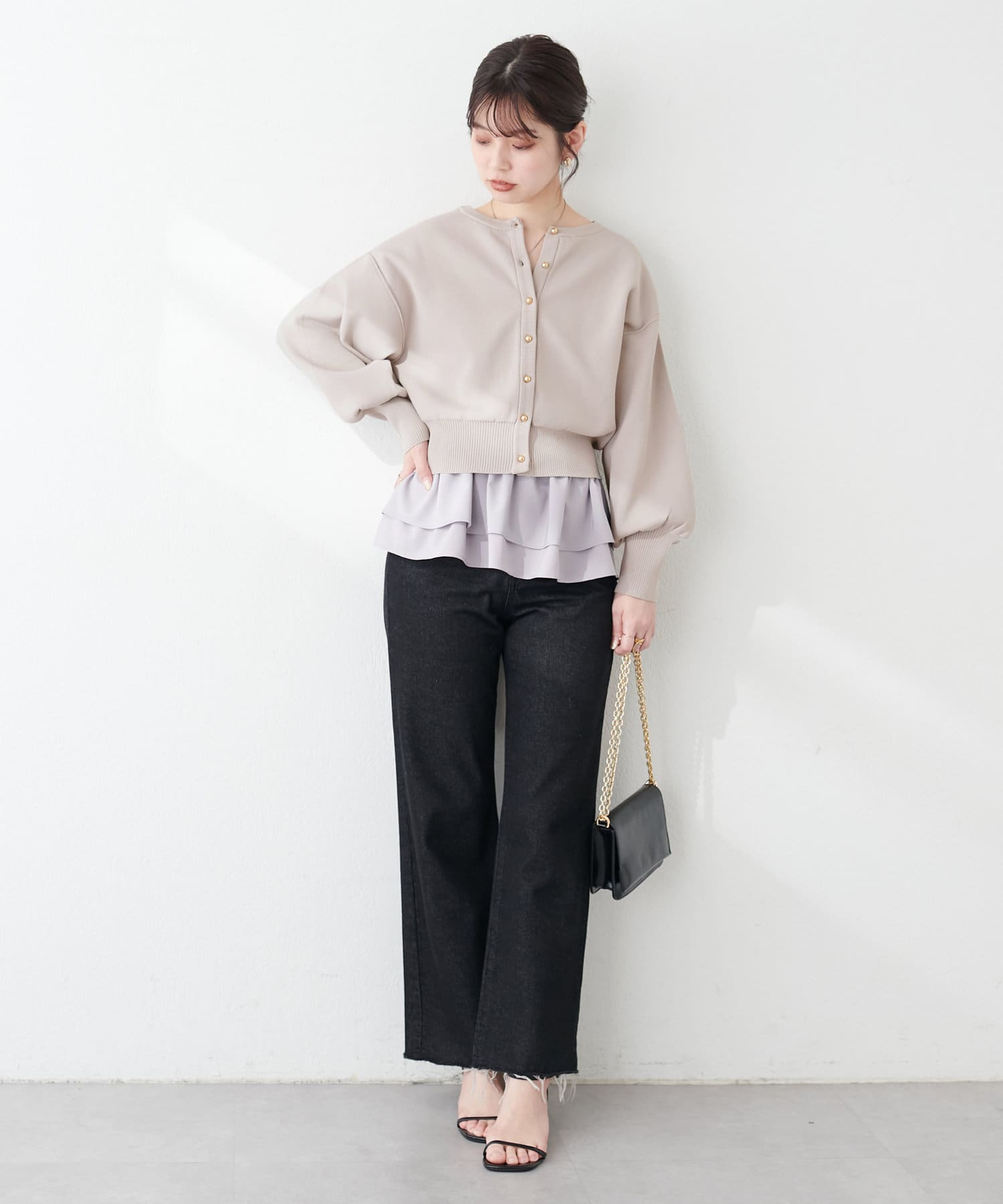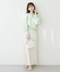 釦を閉じてプルオーバー風に着れば、タイトスカートと合わせてきれいめお仕事コーデに。