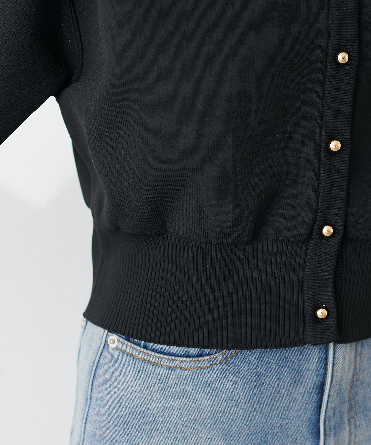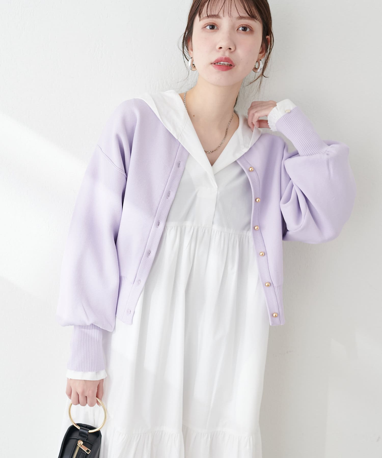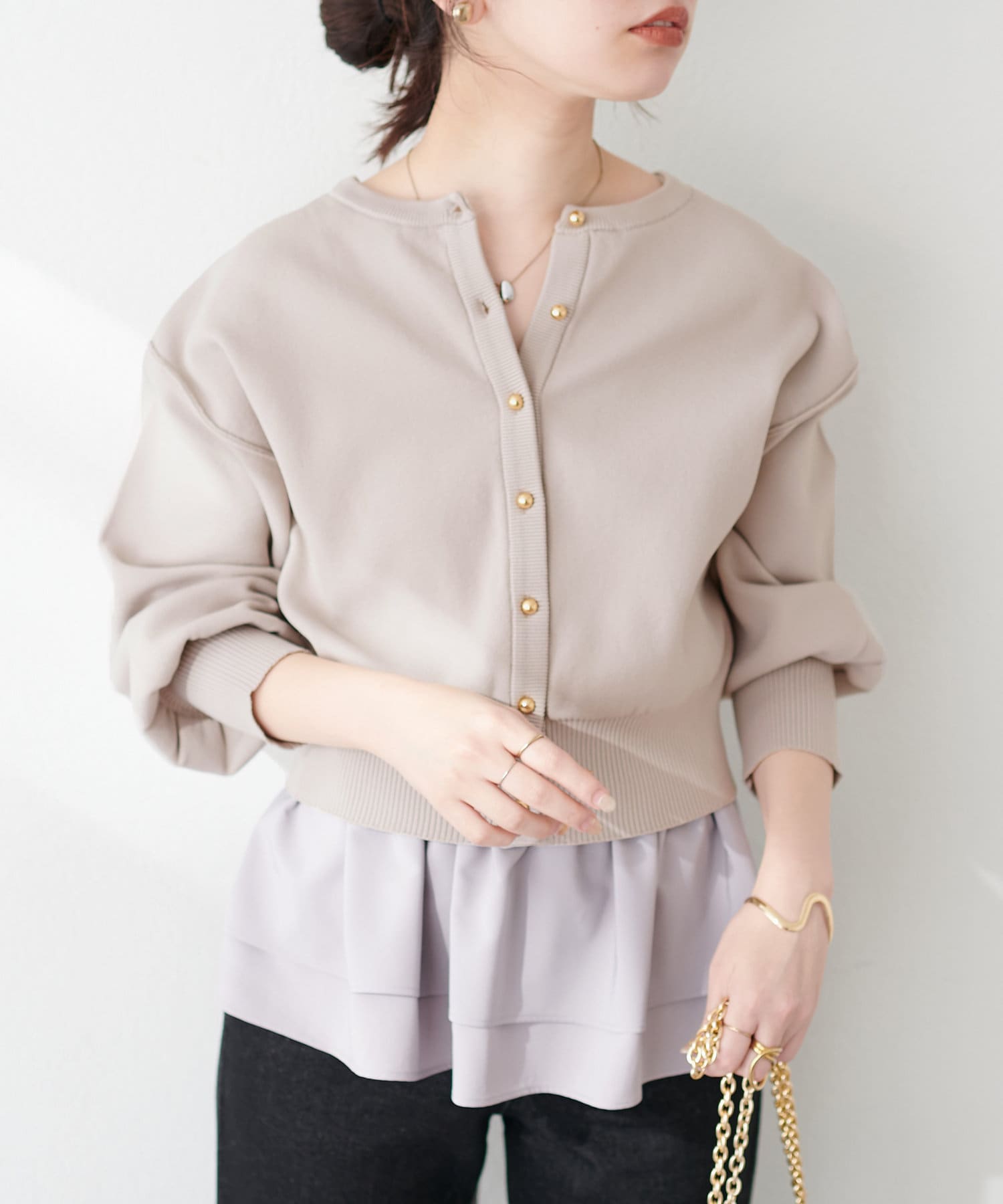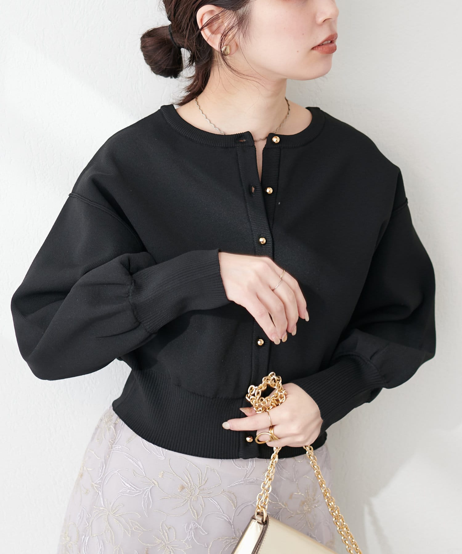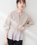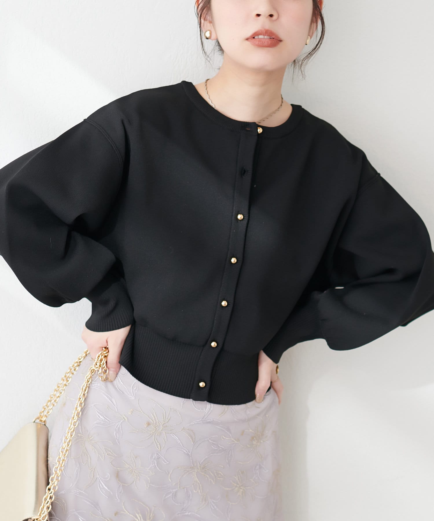 釦を閉じてプルオーバー風に着れば、タイトスカートと合わせてきれいめお仕事コーデに。