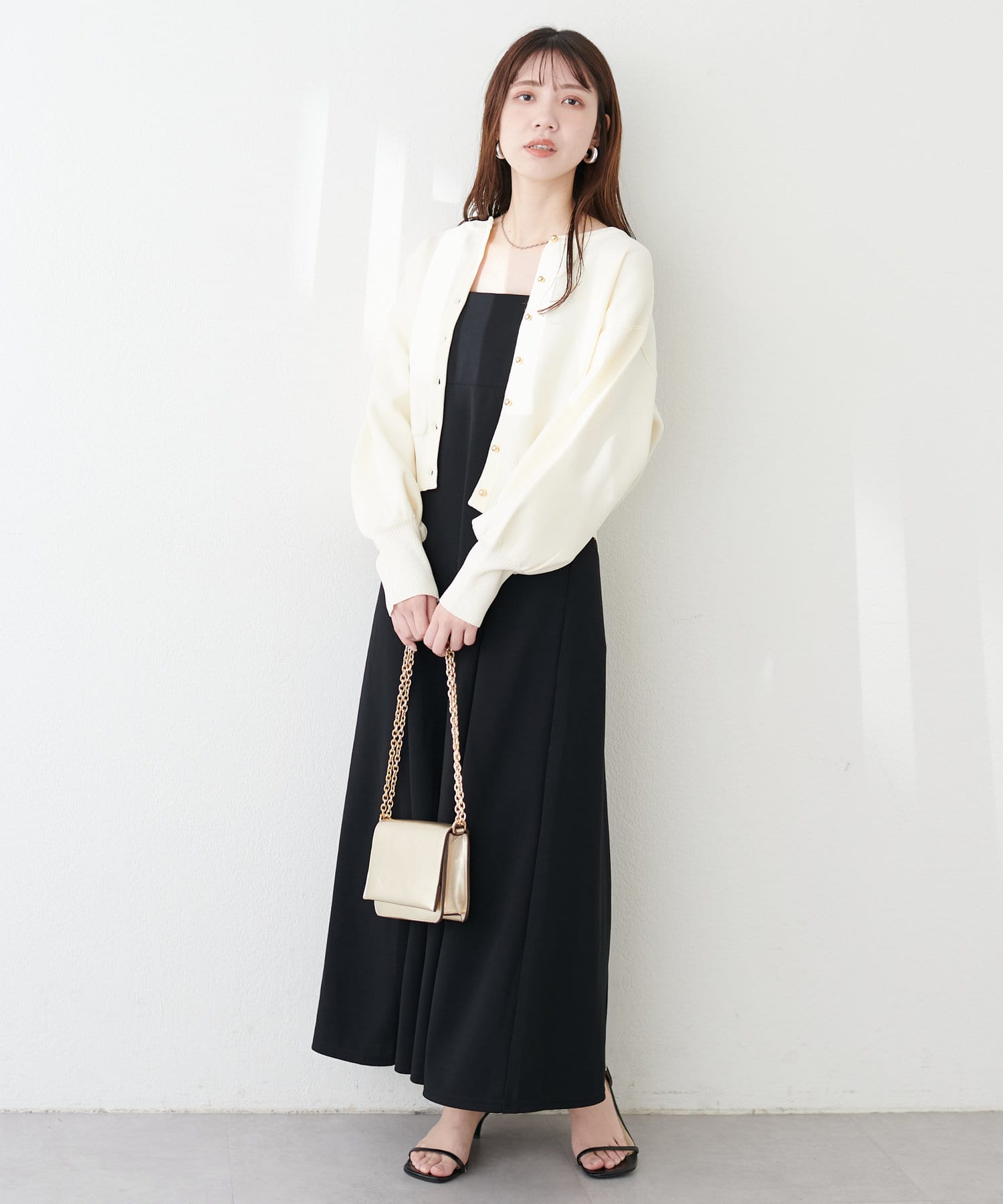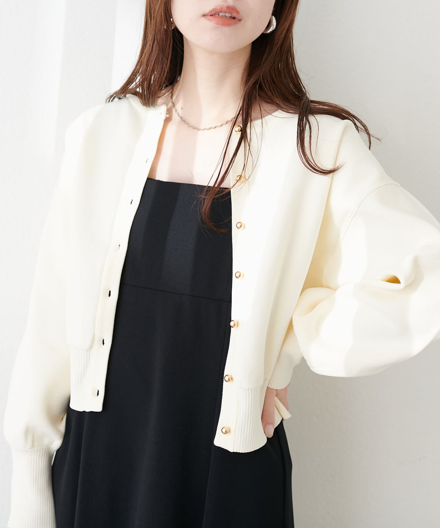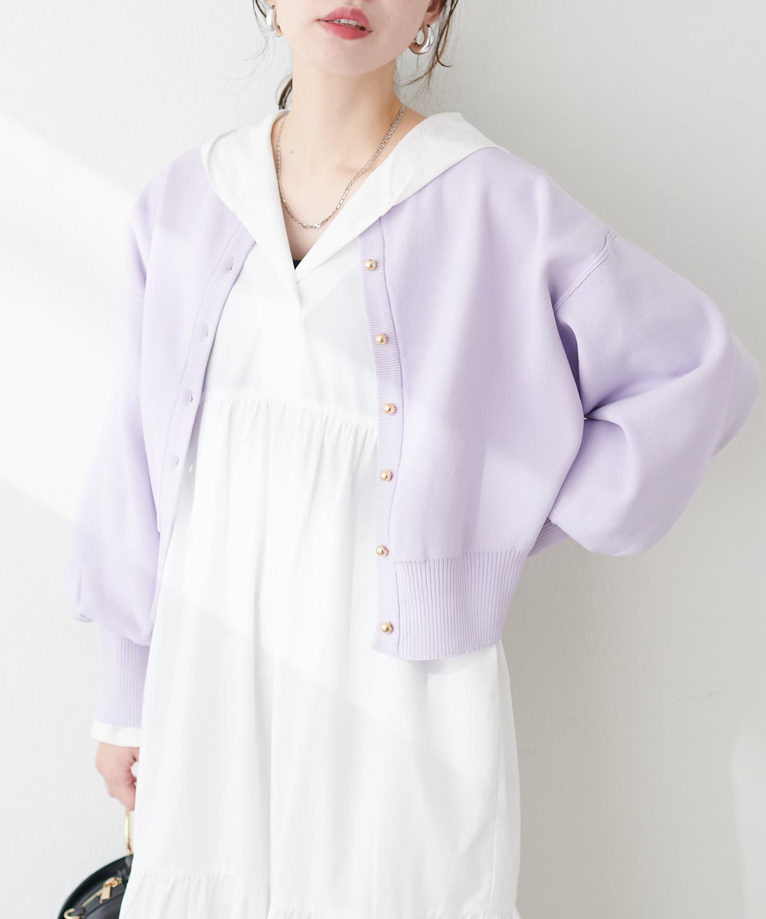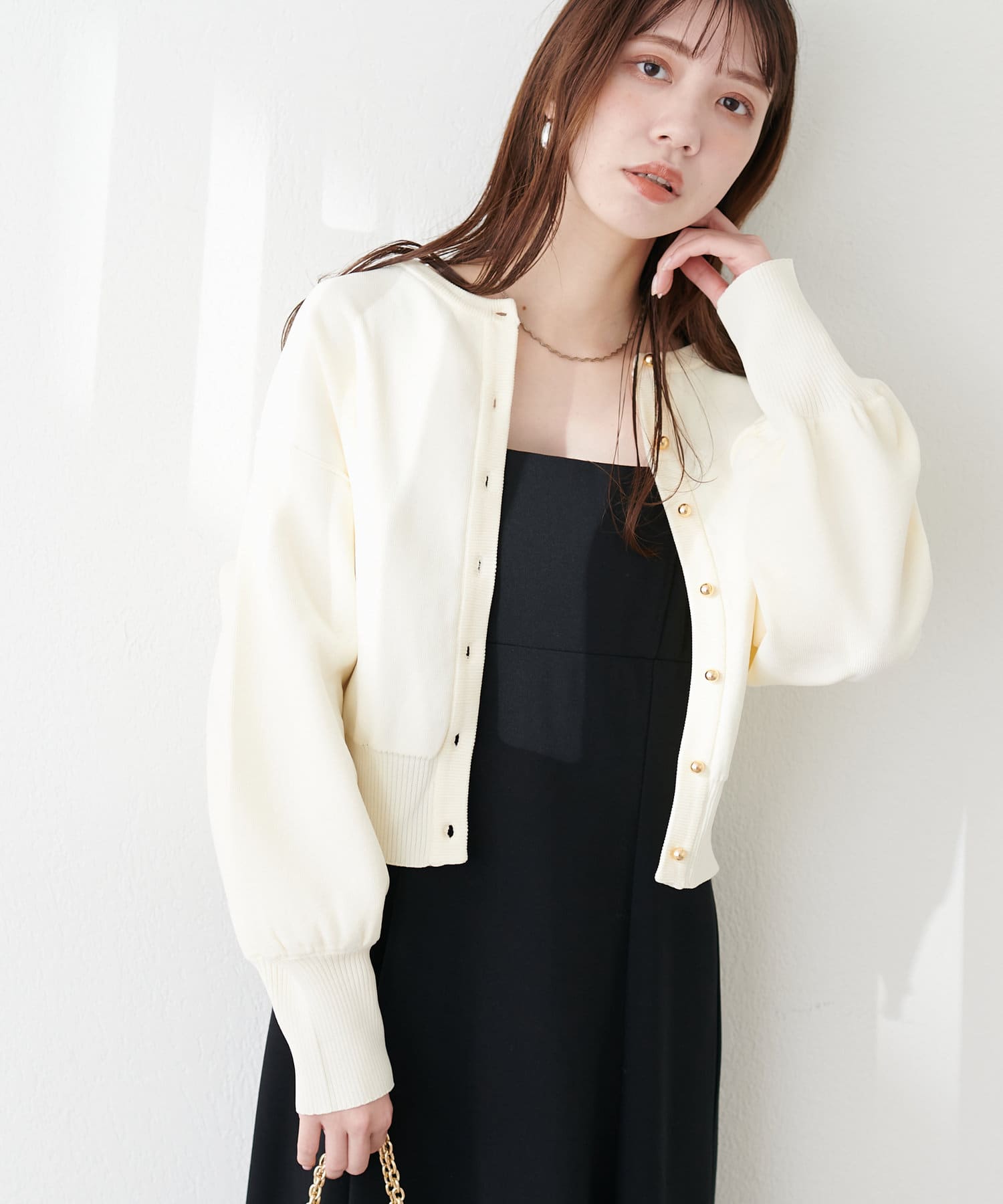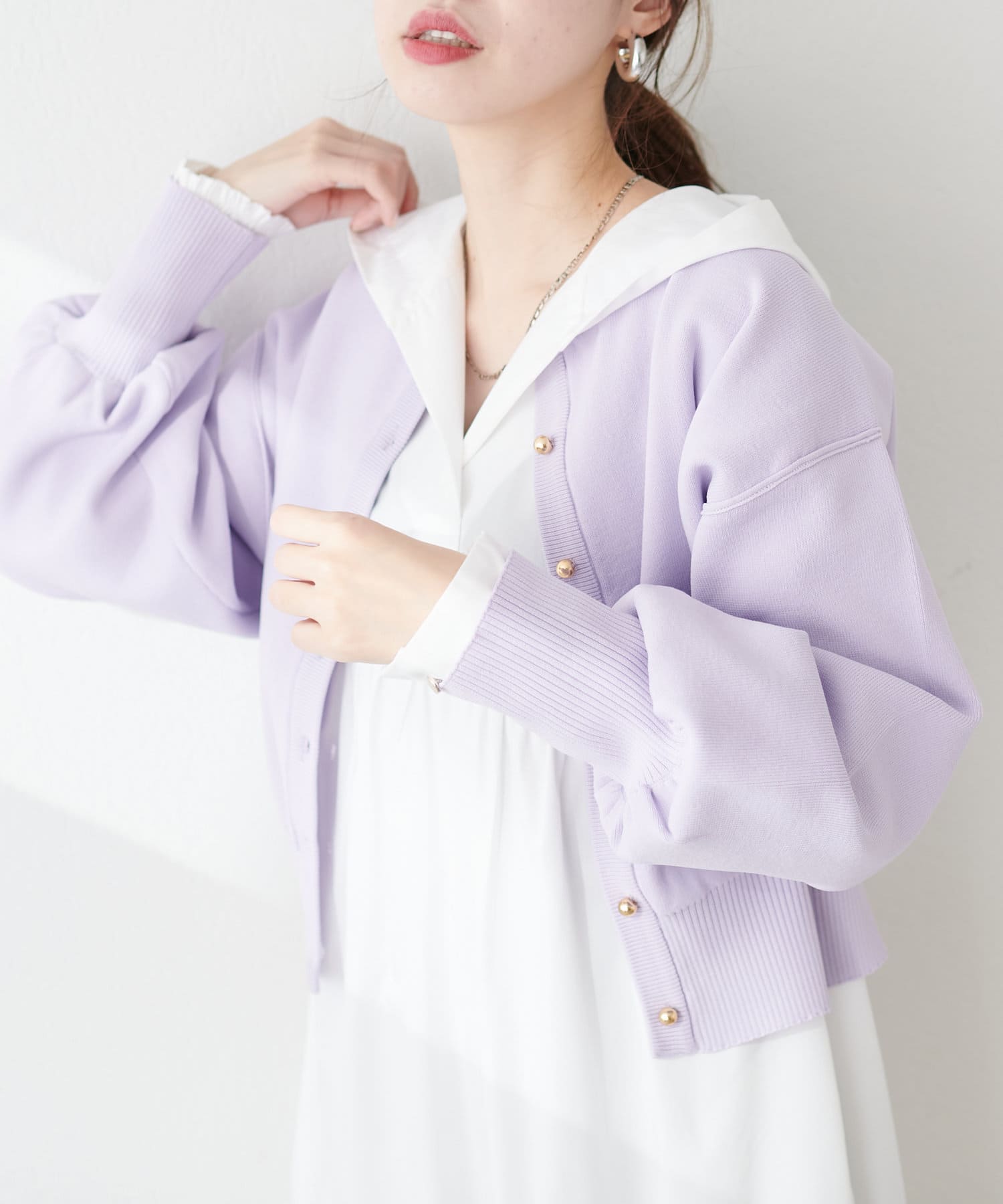 釦を閉じてプルオーバー風に着れば、タイトスカートと合わせてきれいめお仕事コーデに。