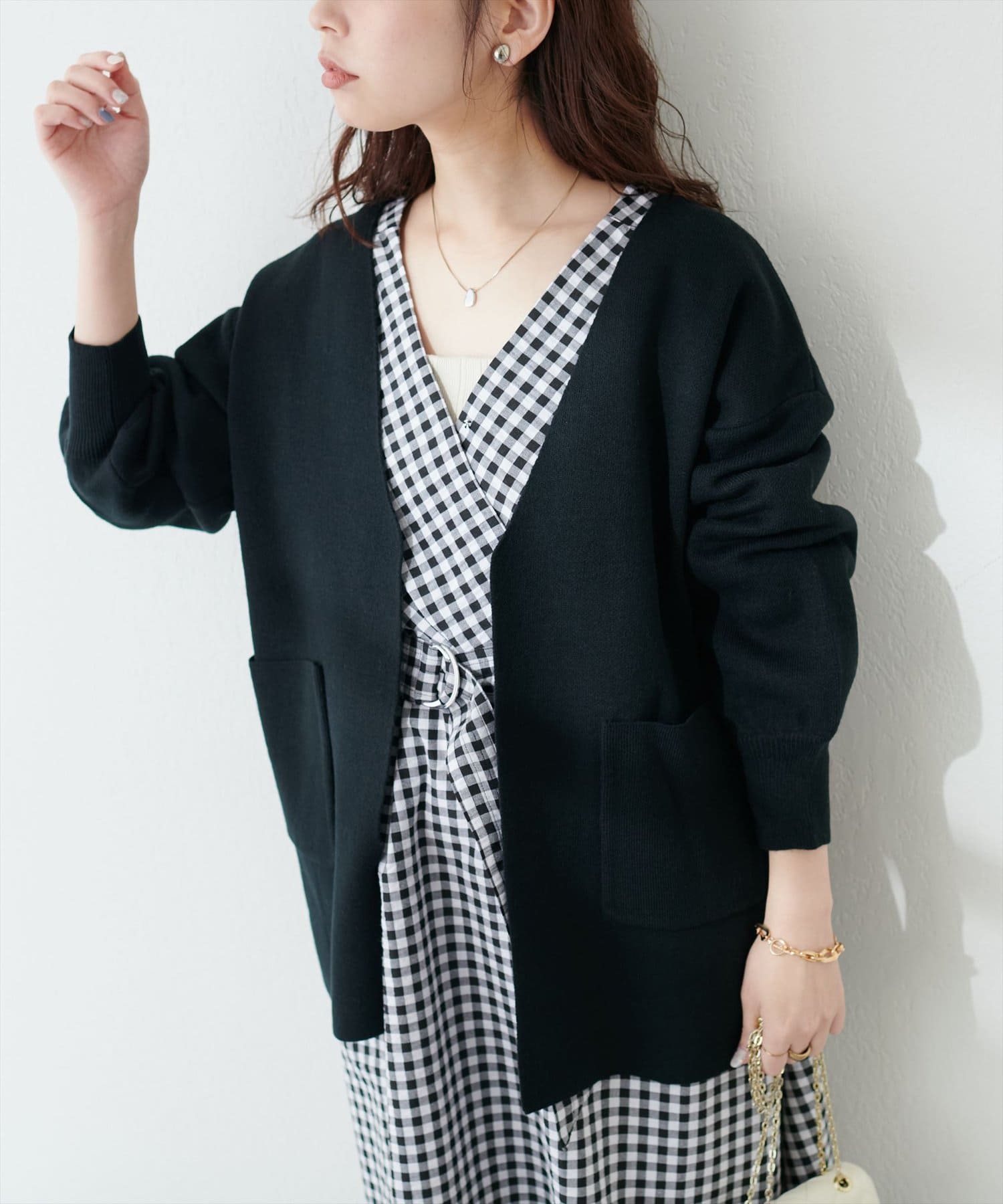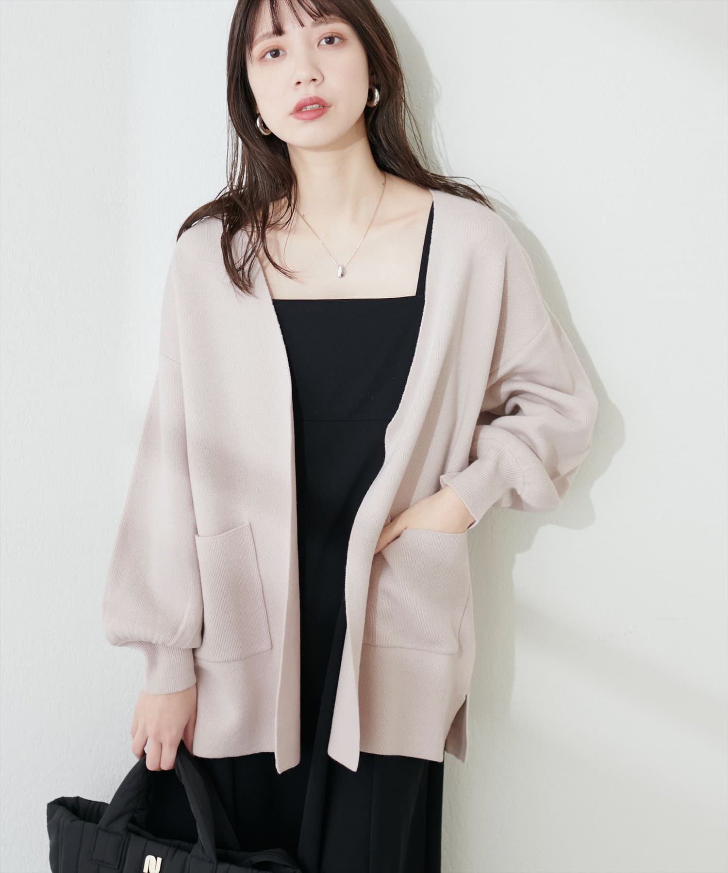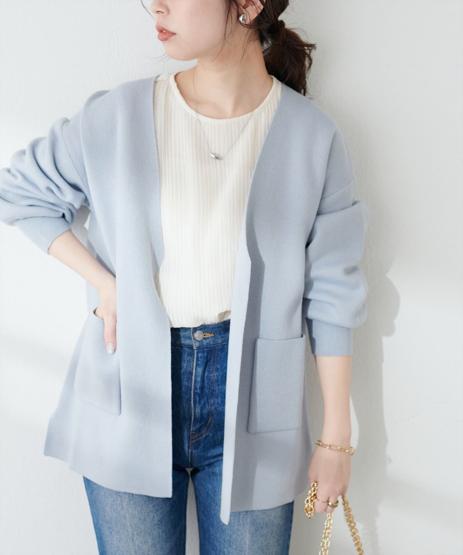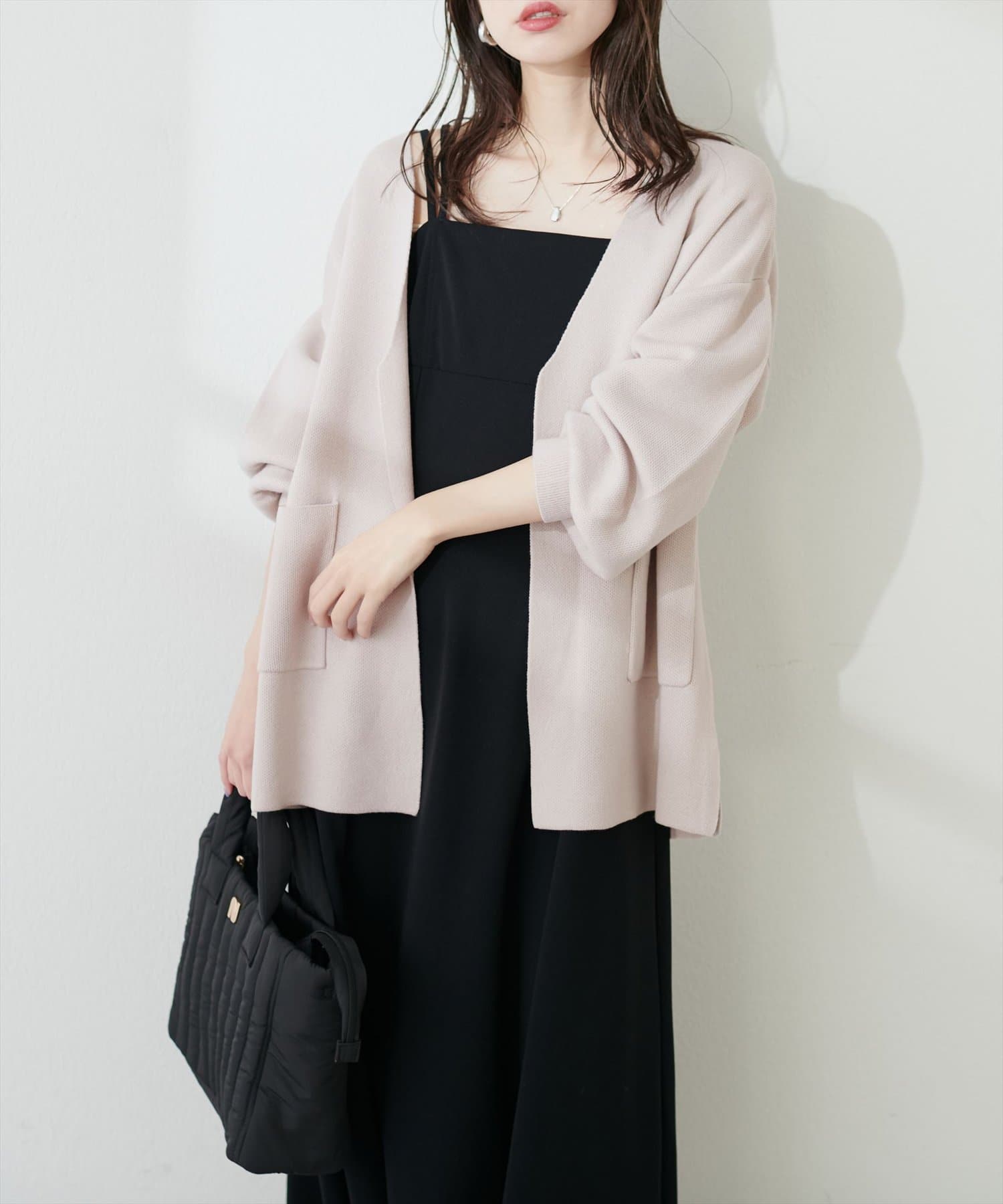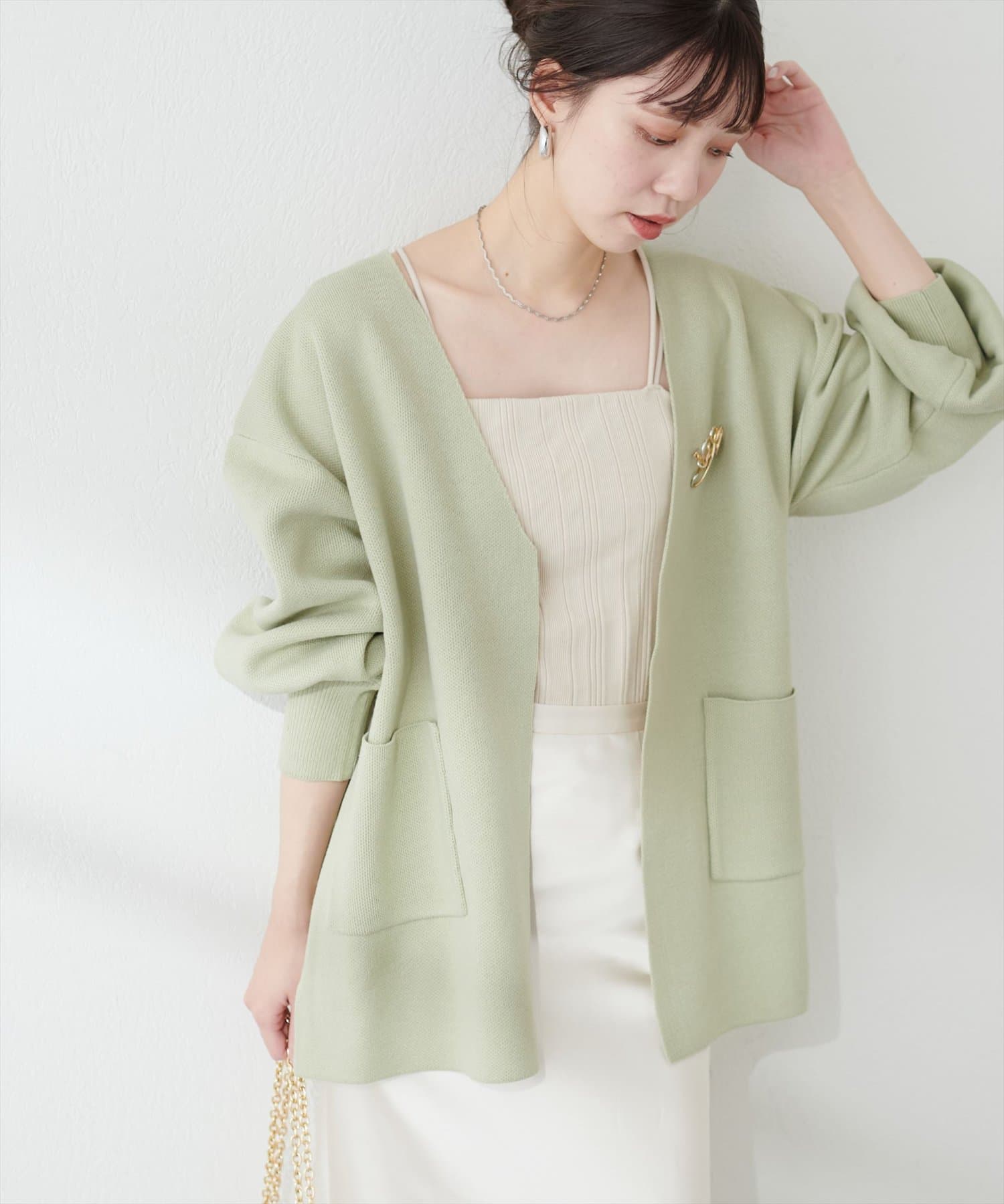釦なしのすっきりとしたデザインでさっと羽織れるカーディガン。