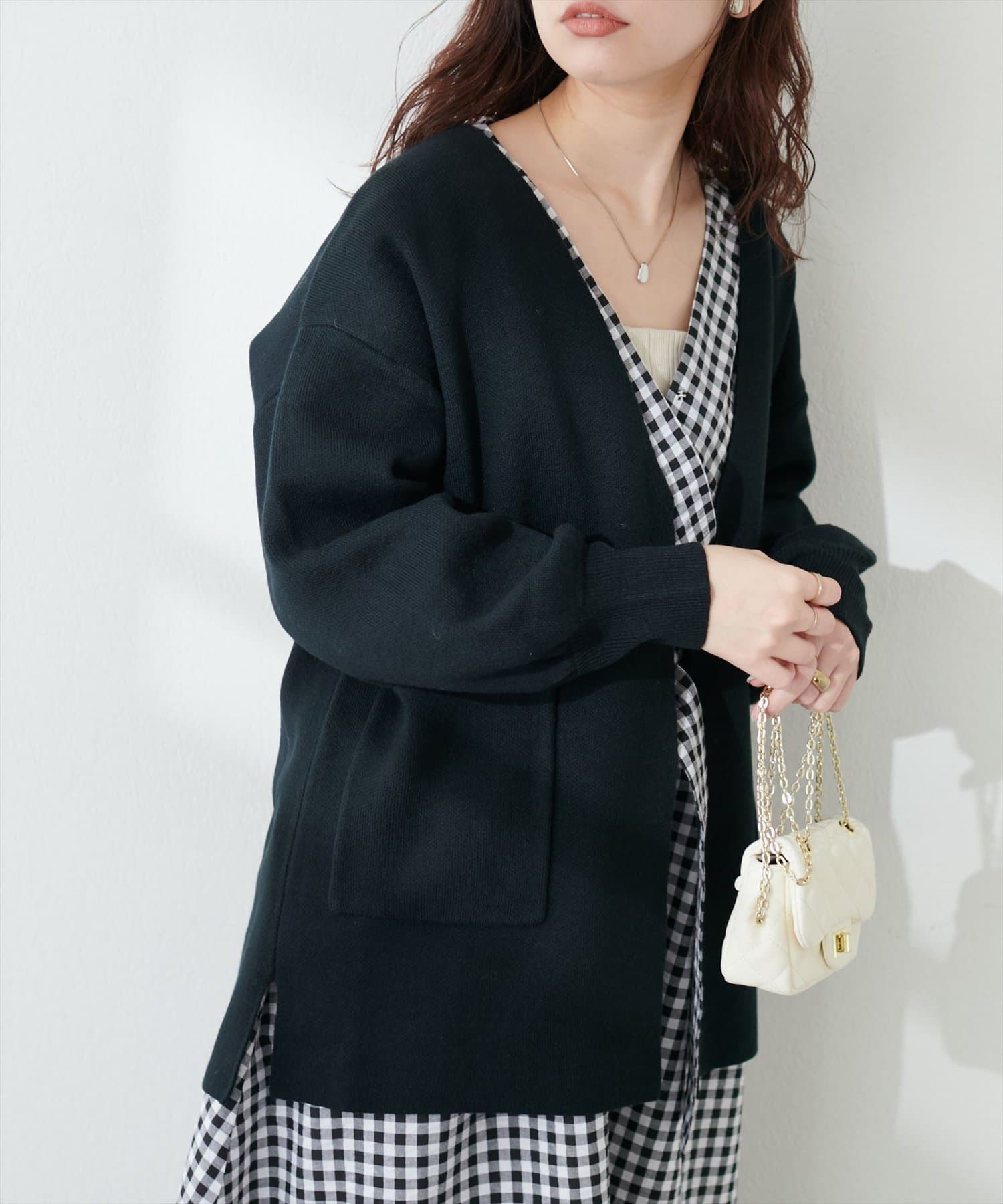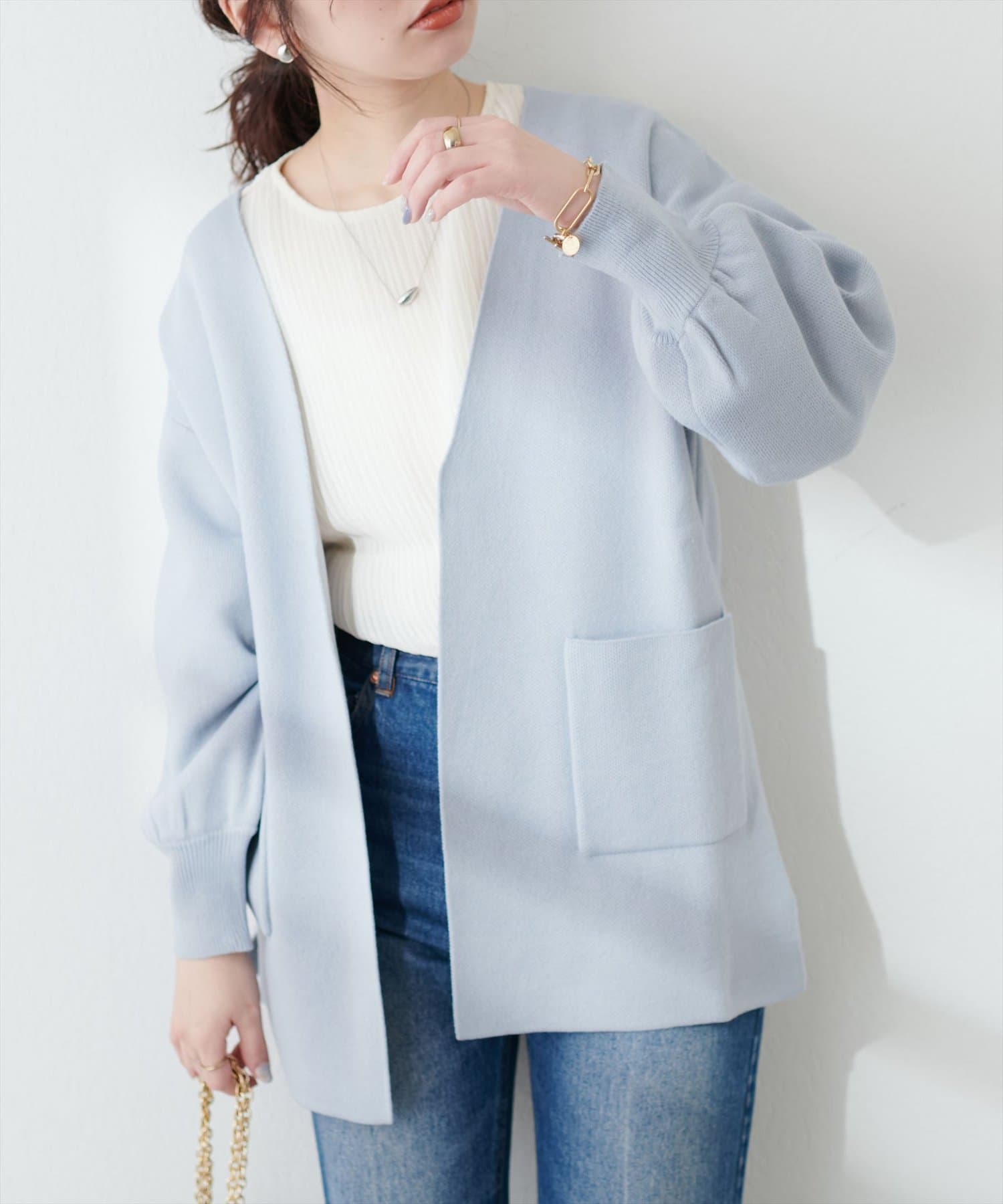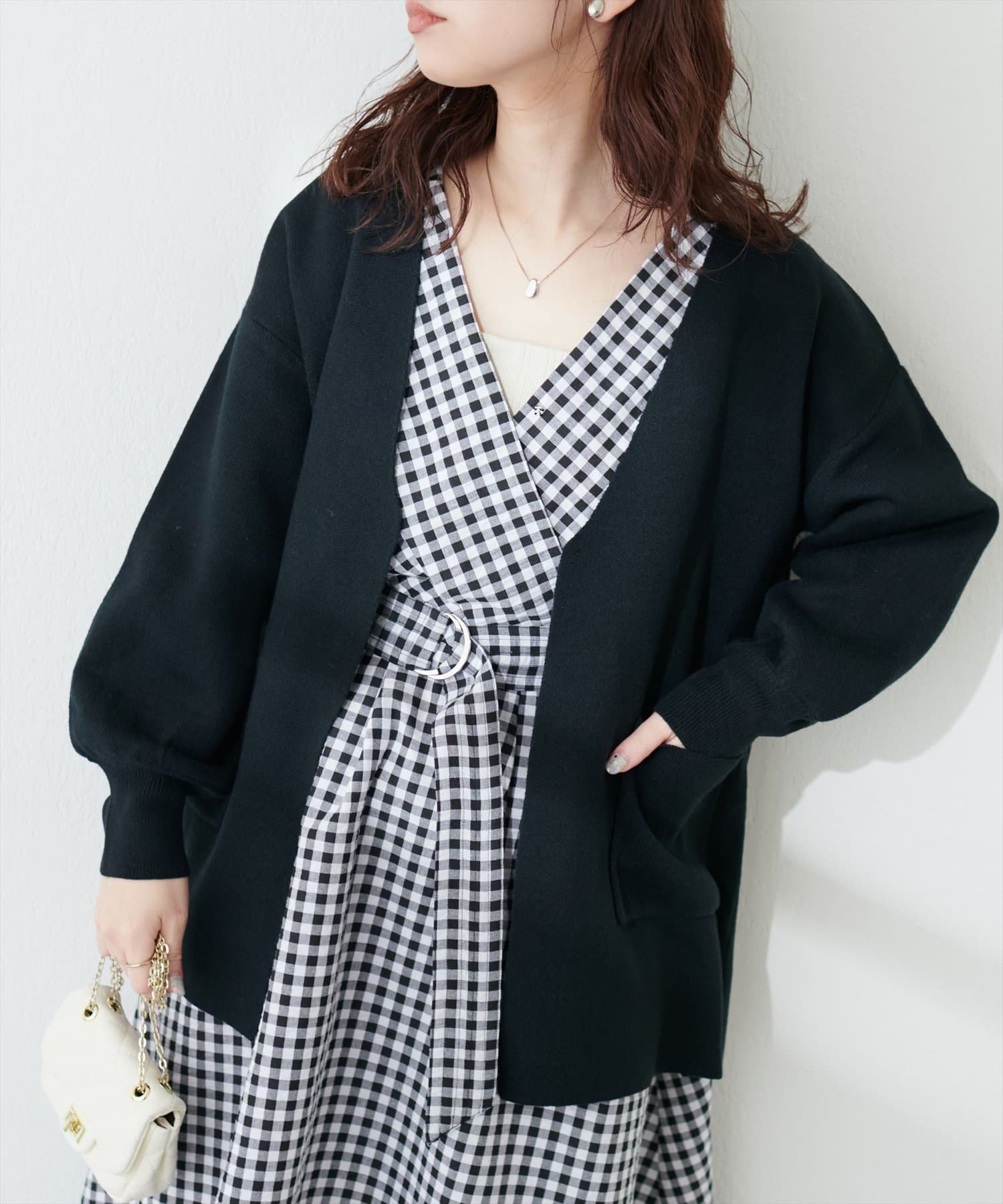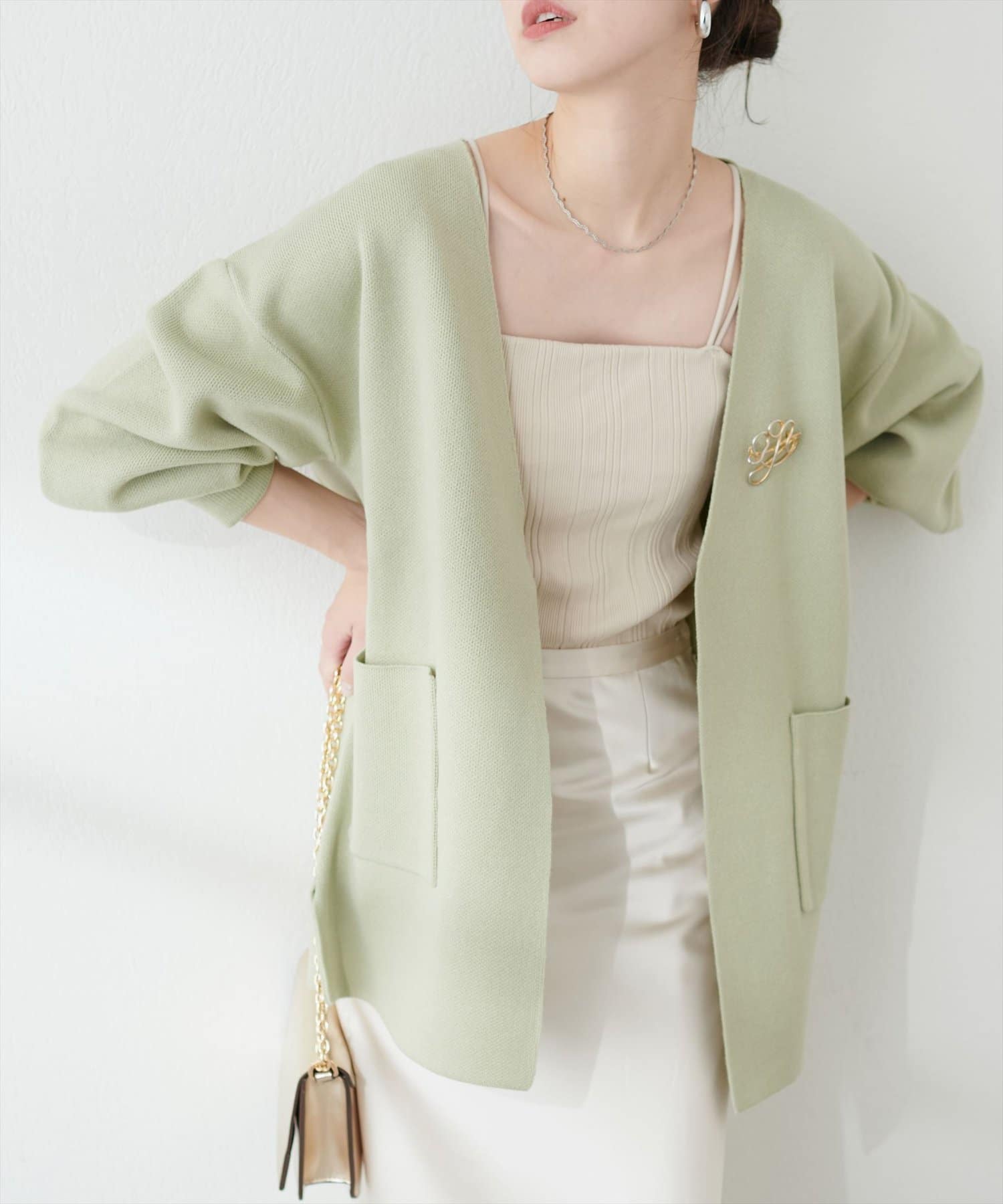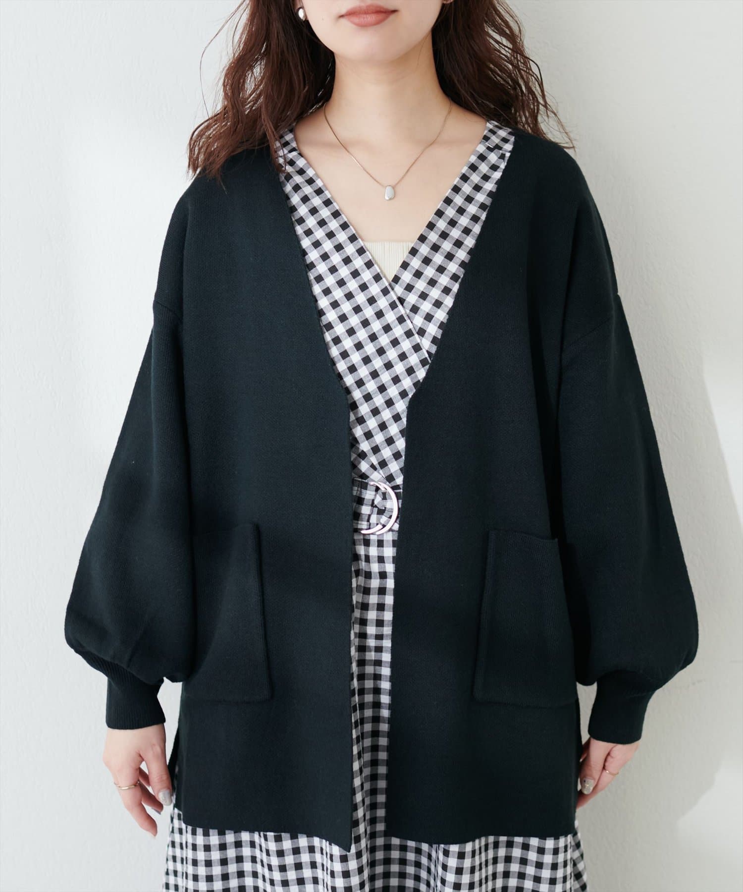 釦なしのすっきりとしたデザインでさっと羽織れるカーディガン。