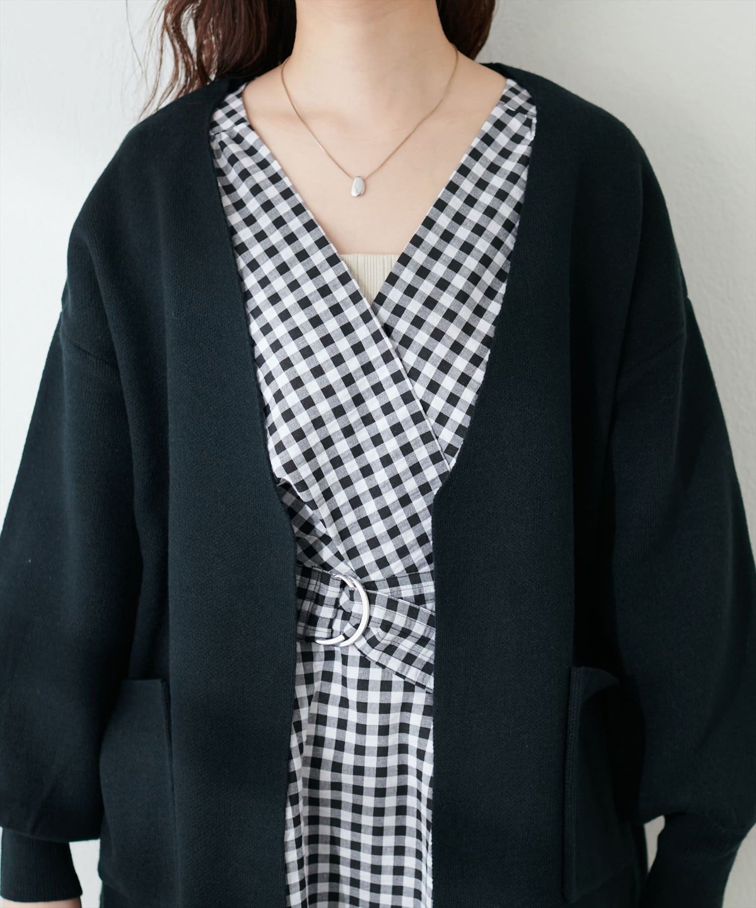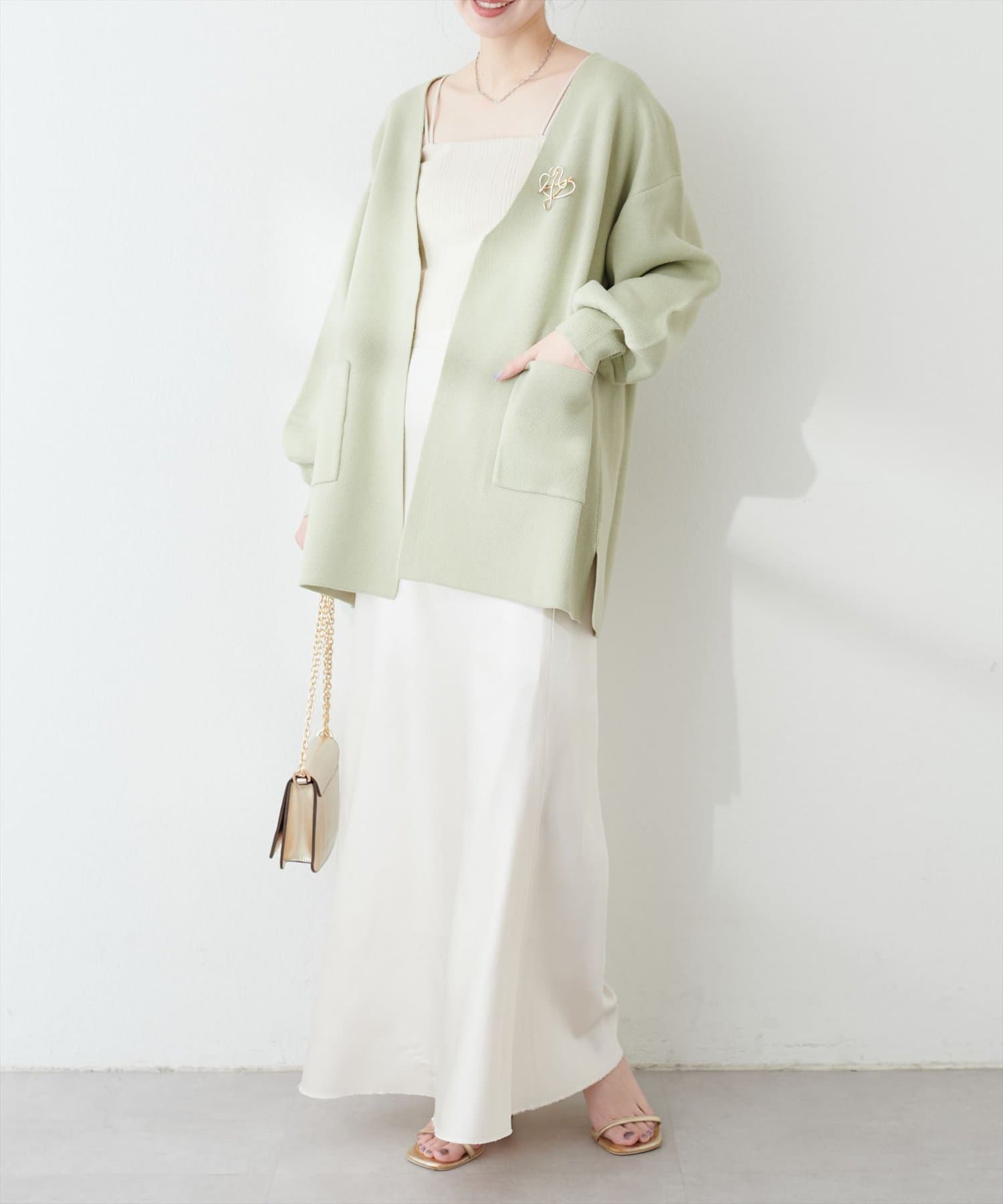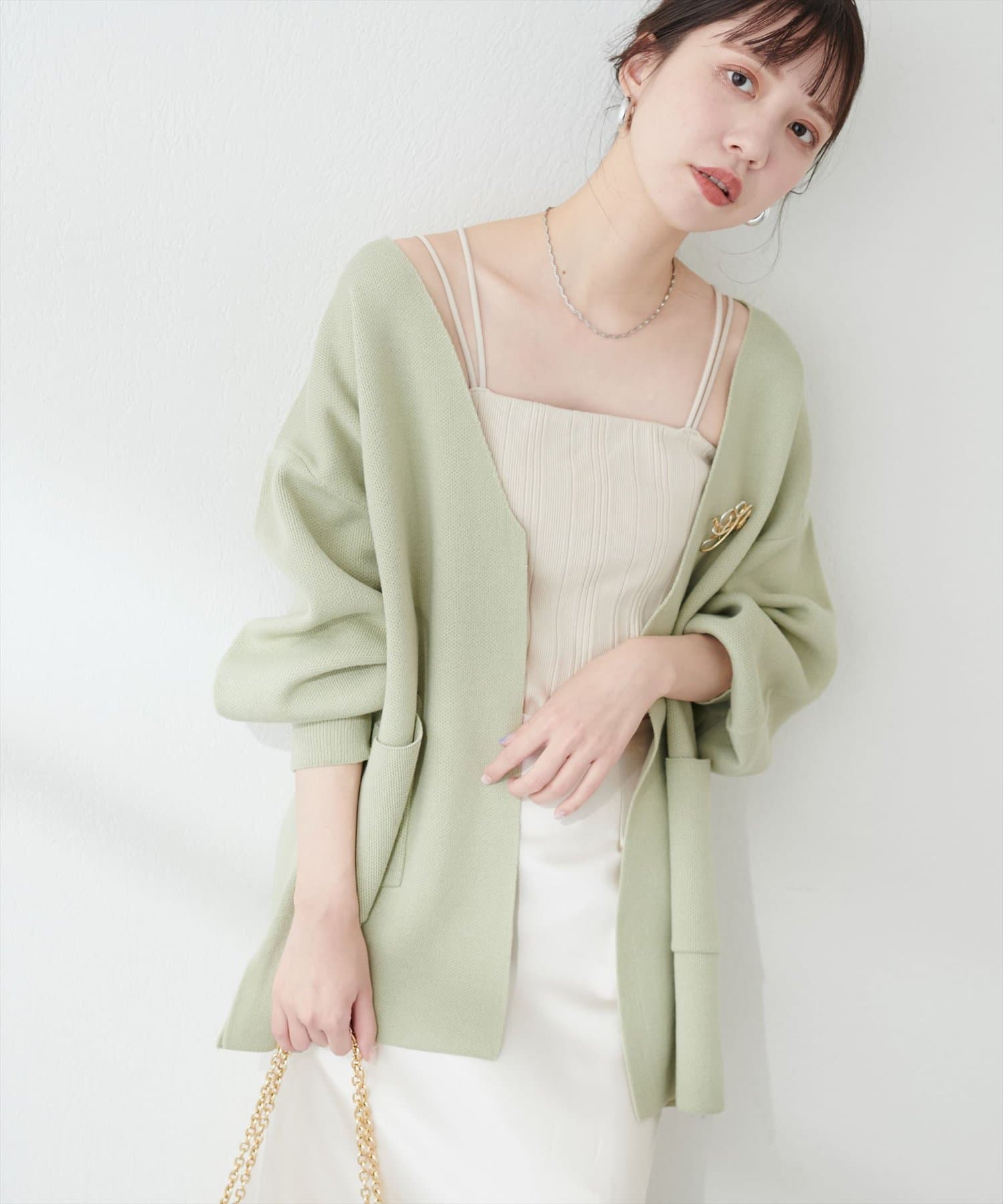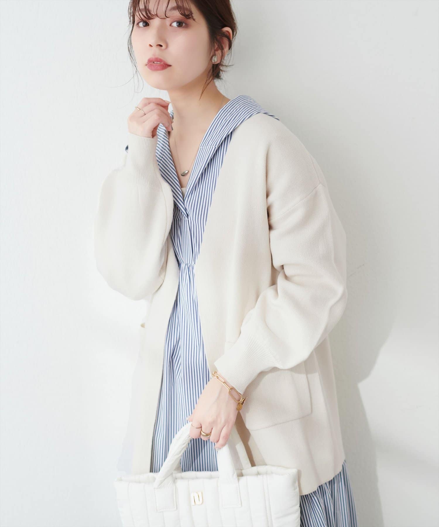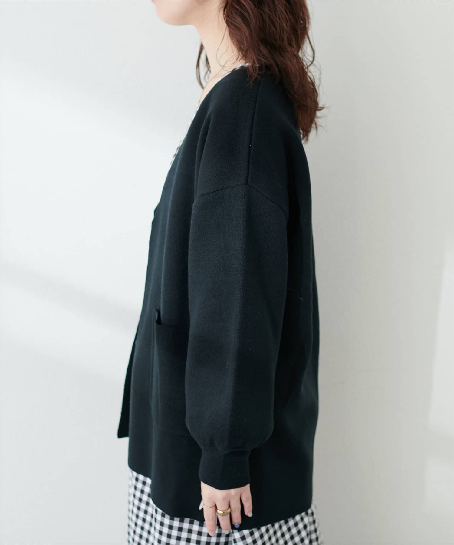 釦なしのすっきりとしたデザインでさっと羽織れるカーディガン。