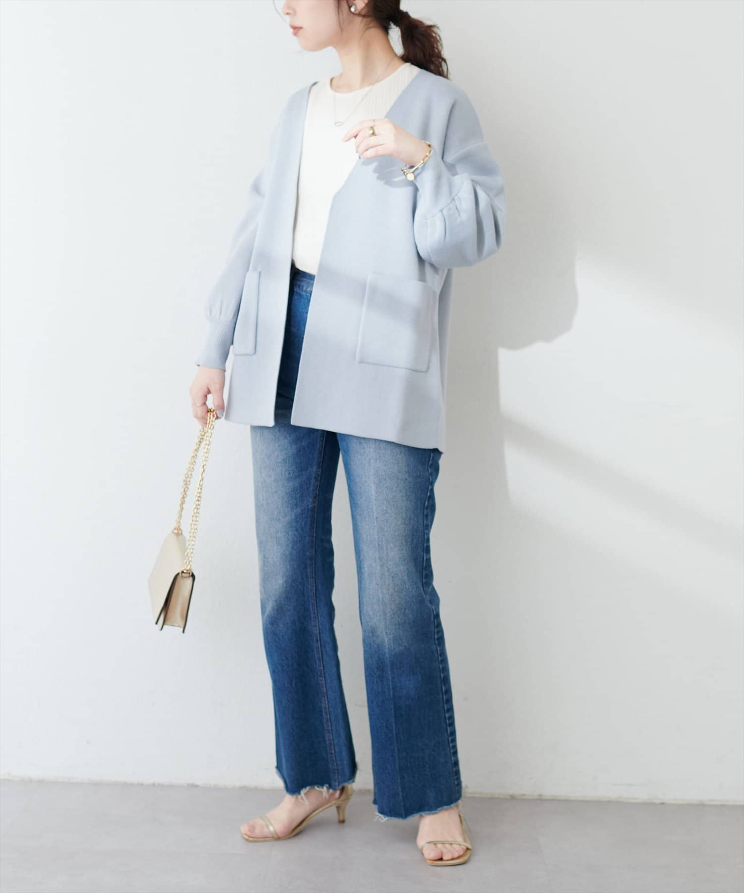 オフィスカジュアルの上に羽織って通勤コーデにも最適。