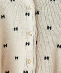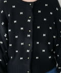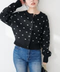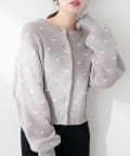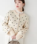 ころんとした釦がアクセントで、ぎゅっと編まれた編地とリボンハートジャガードが可愛いカーディガン。