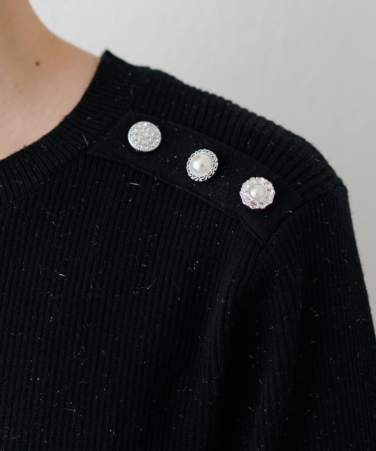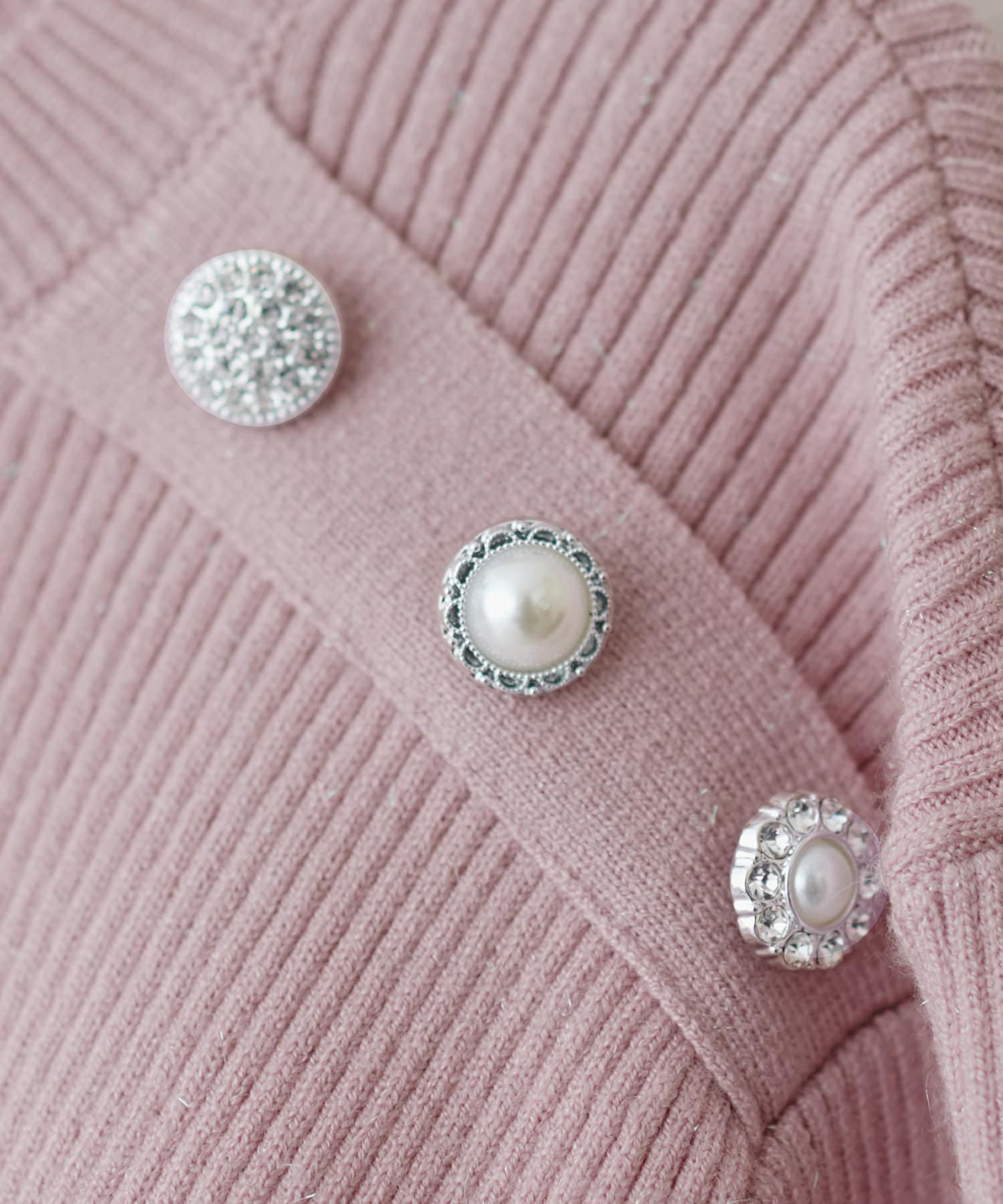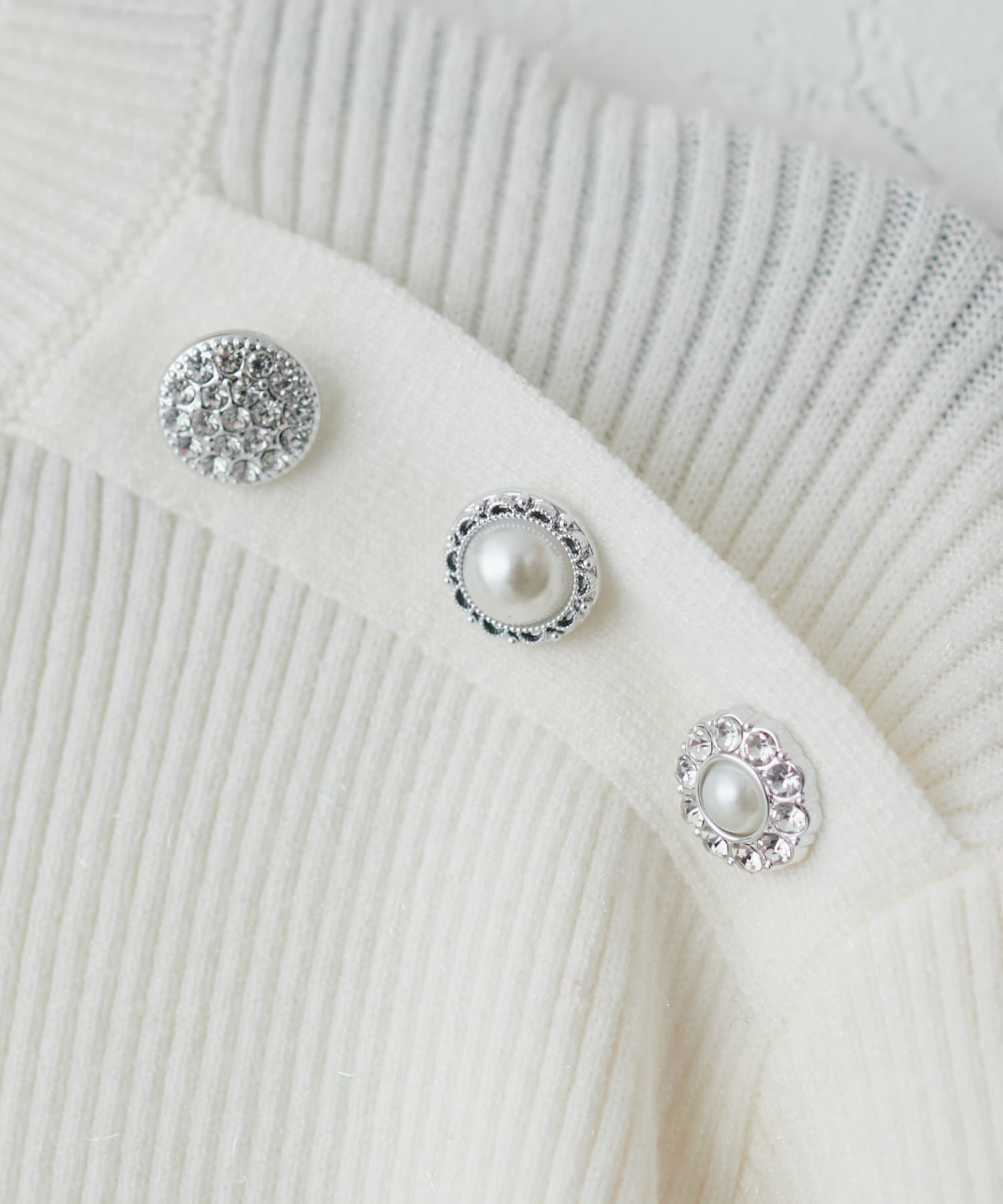 左肩には3種類のキラキラとした釦があしらわれ、コーディネートをぐっと華やかに仕上げてくれます。