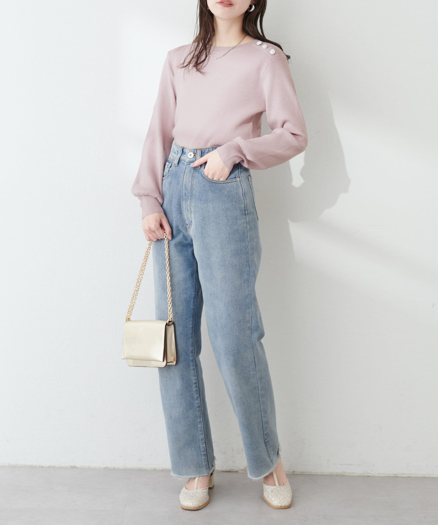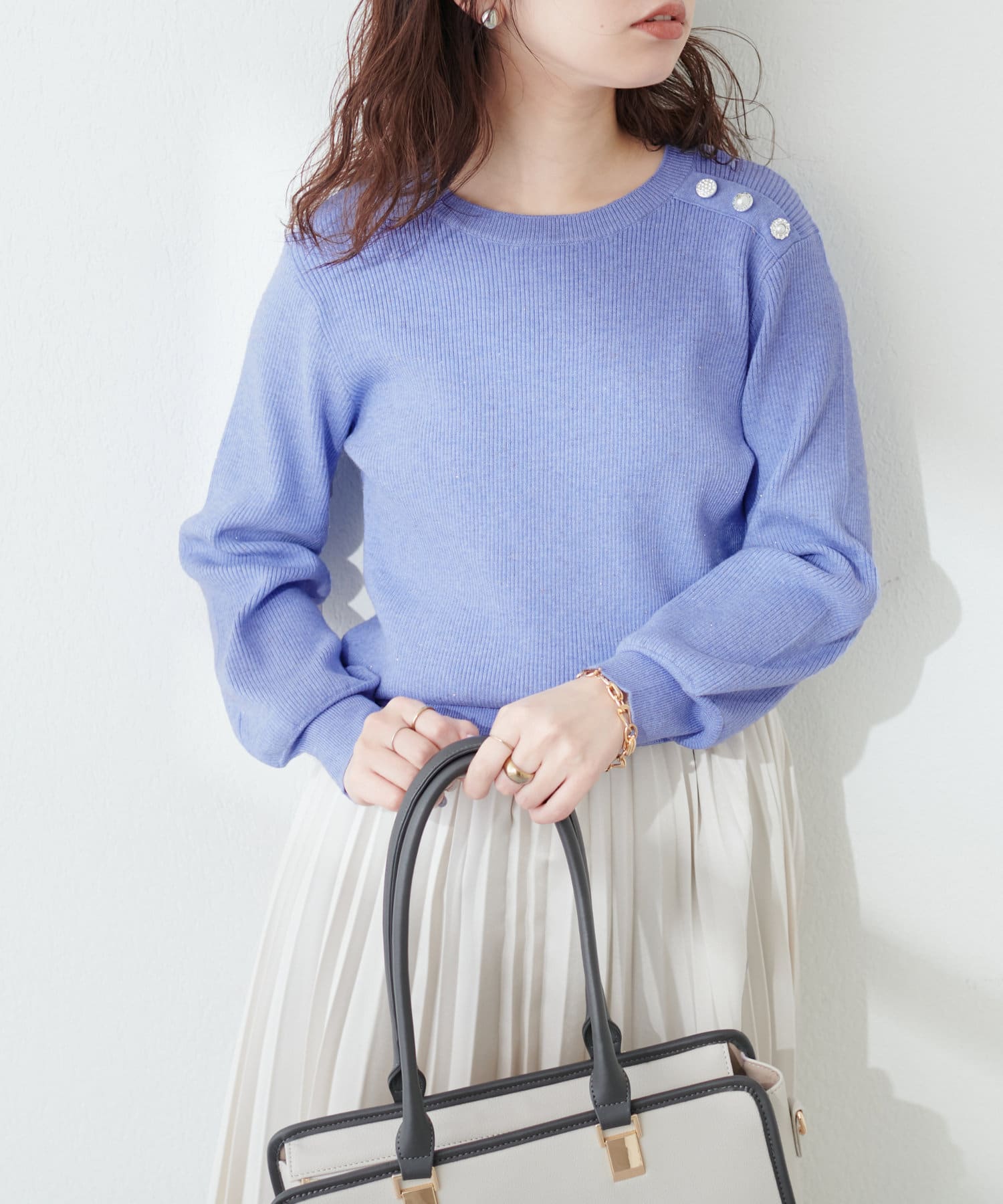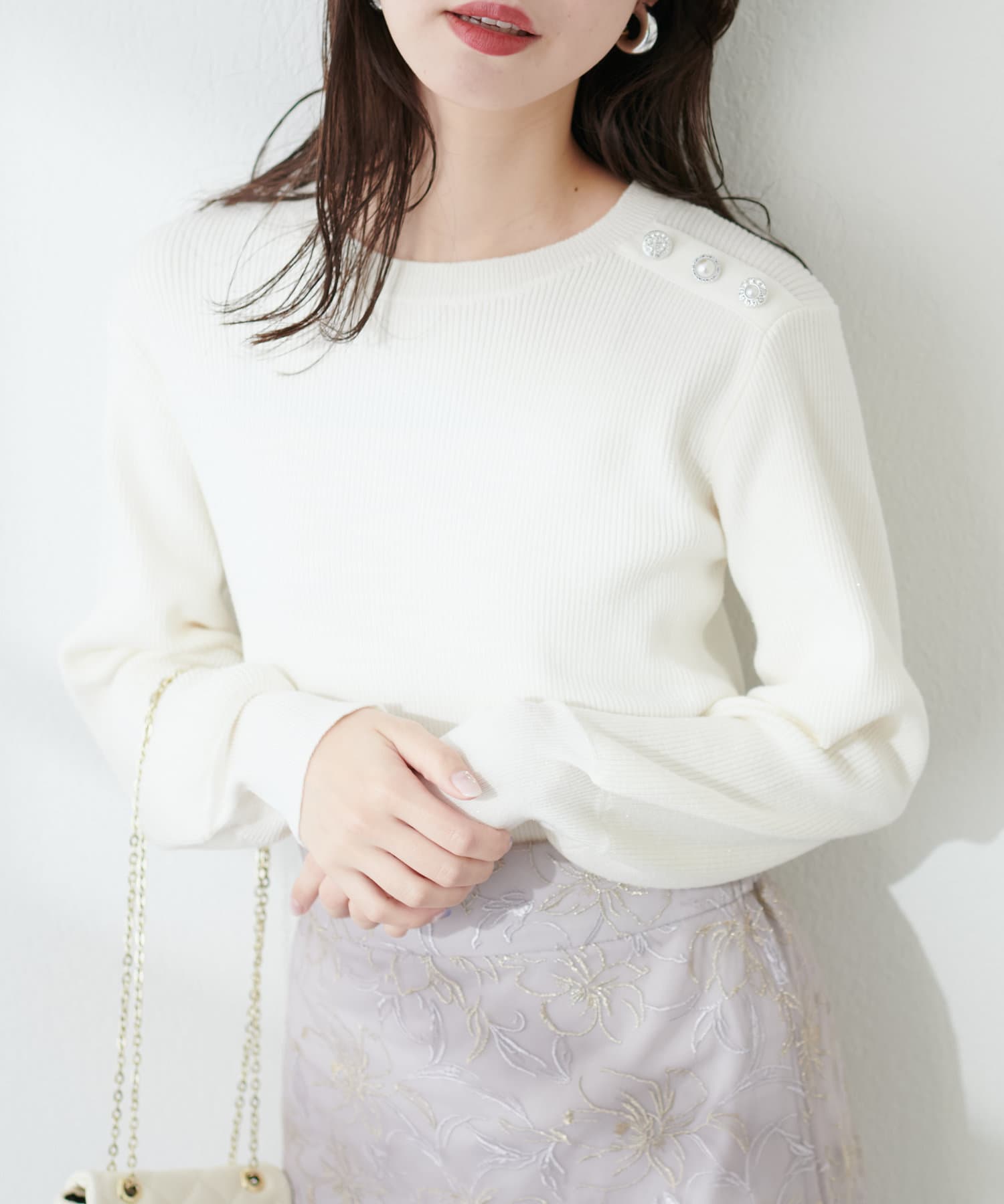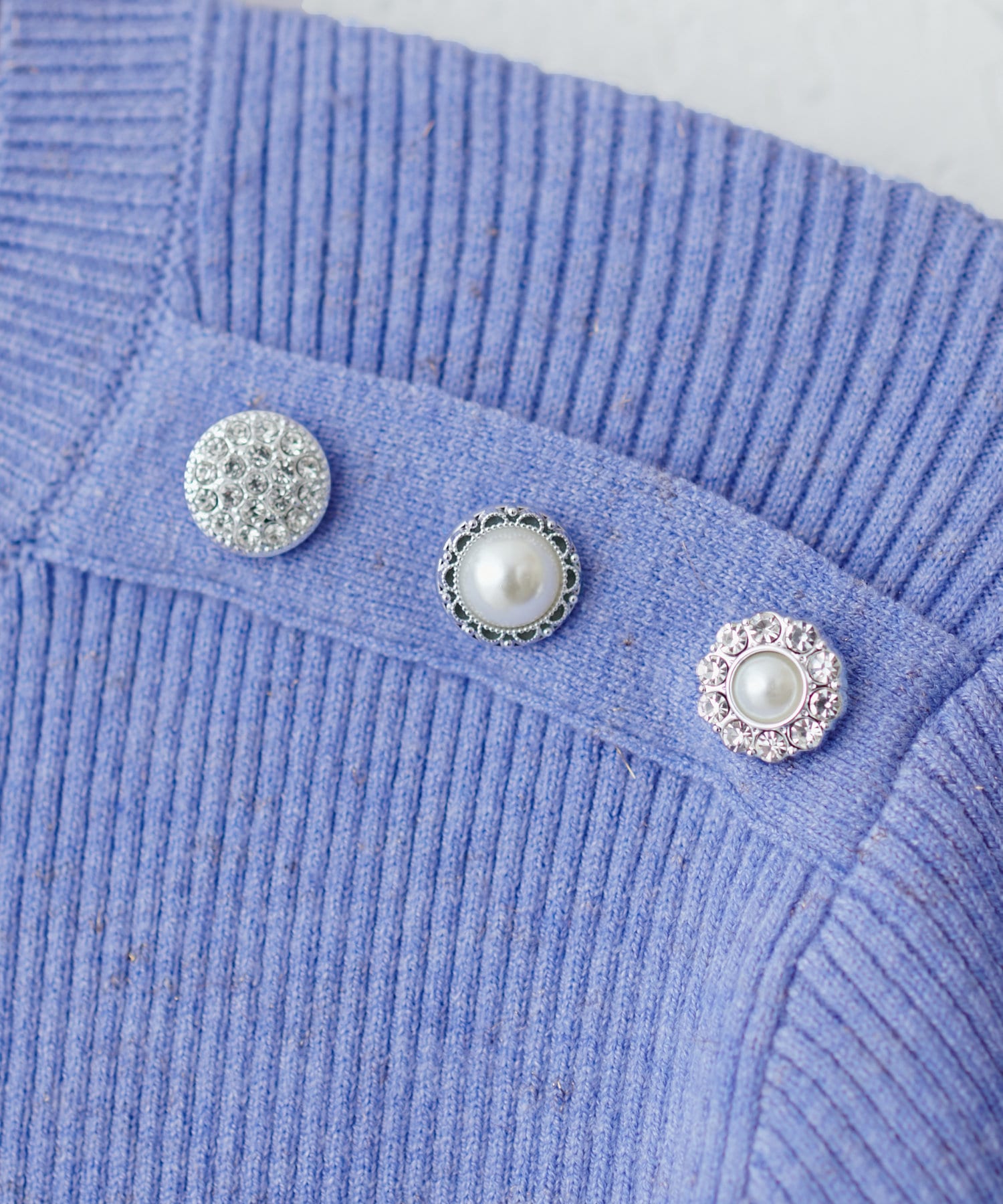 左肩には3種類のキラキラとした釦があしらわれ、コーディネートをぐっと華やかに仕上げてくれます。
