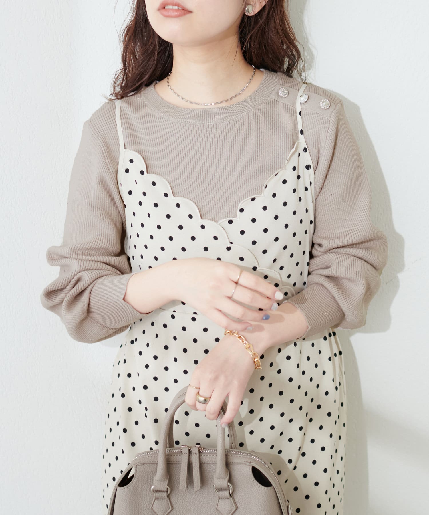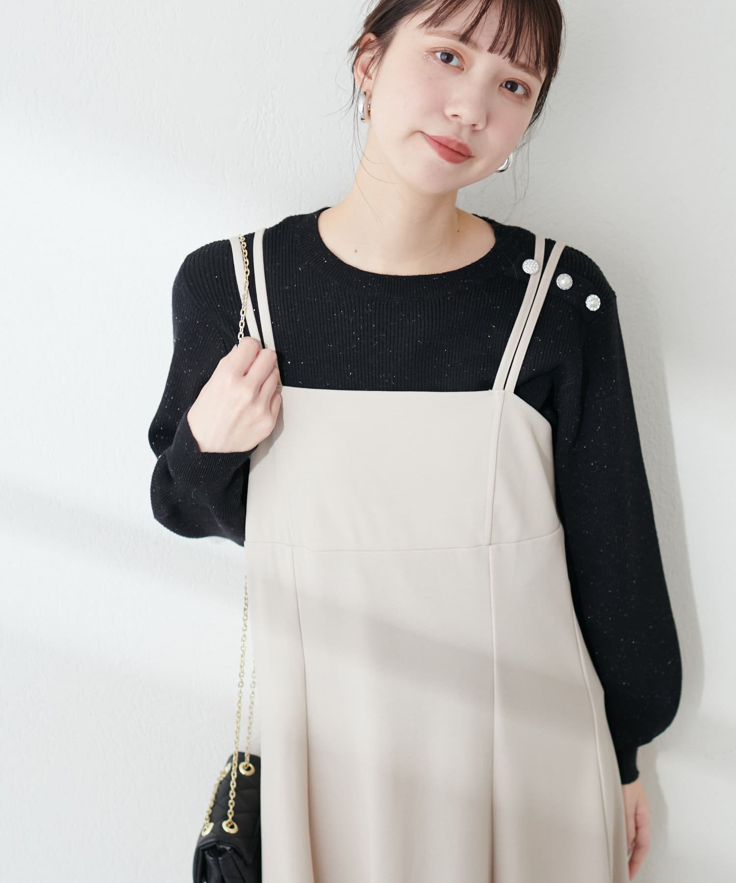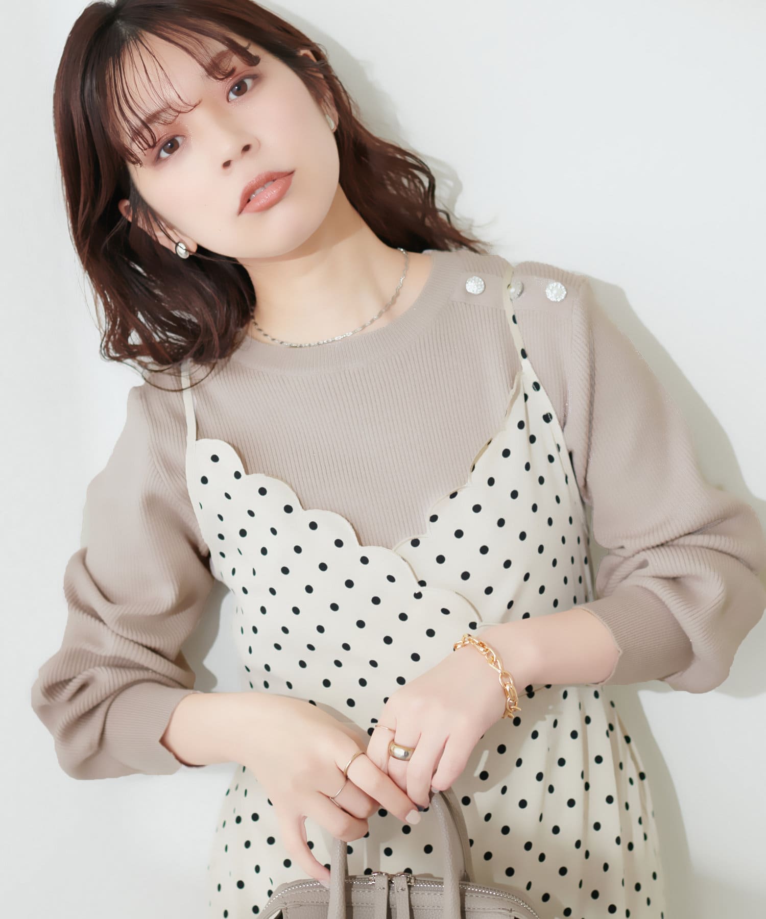 1枚でお召し頂くのはもちろん、キャミワンピースやジャンパースカートとのレイヤードスタイルも、繊細な釦が映えるのでおすすめです。