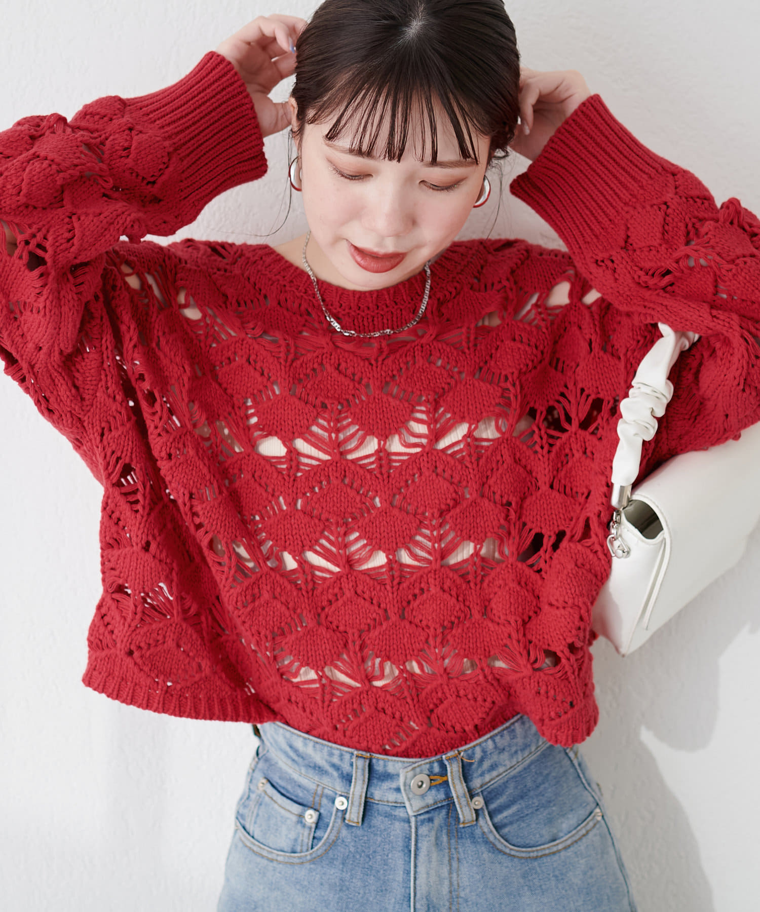 表情豊かな透かし編みが春のスタイリングに抜け感をプラス。