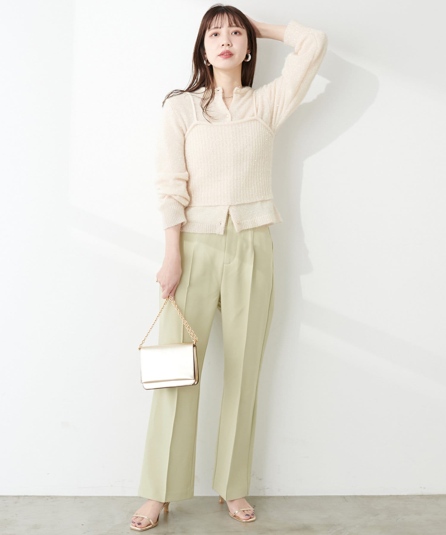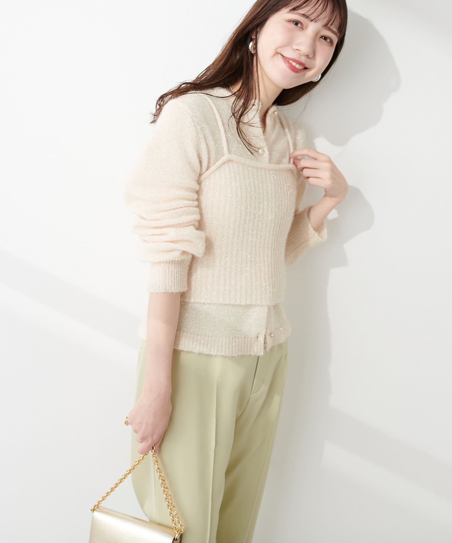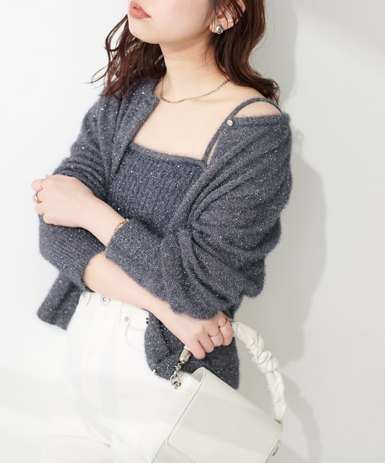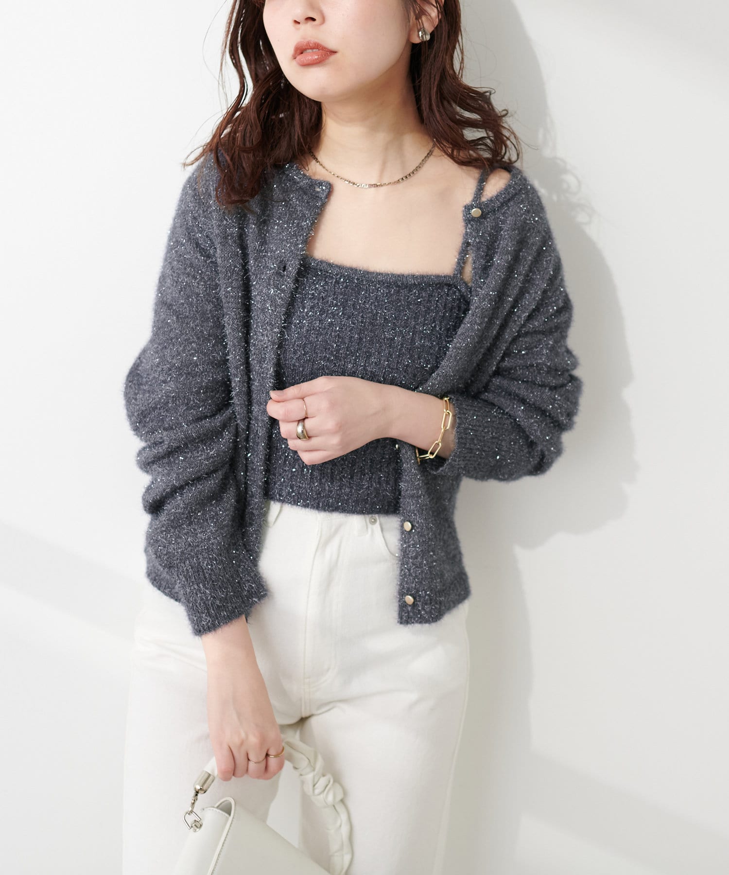 シリーズのラメファンシーヤーン前後2WAYカーディガンと合わせてセットアップでお召し頂くと、より華やかでトレンドライクな印象に。