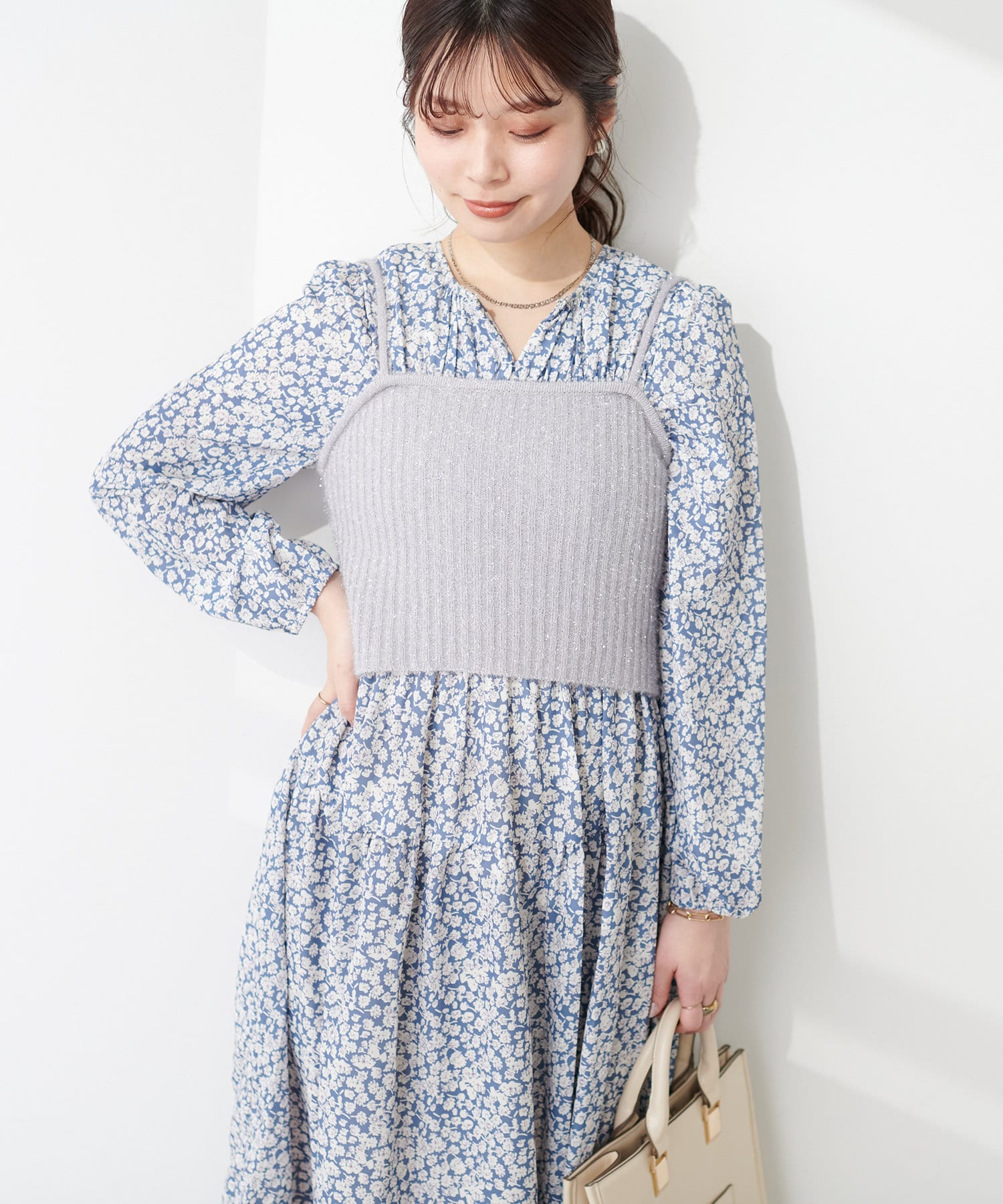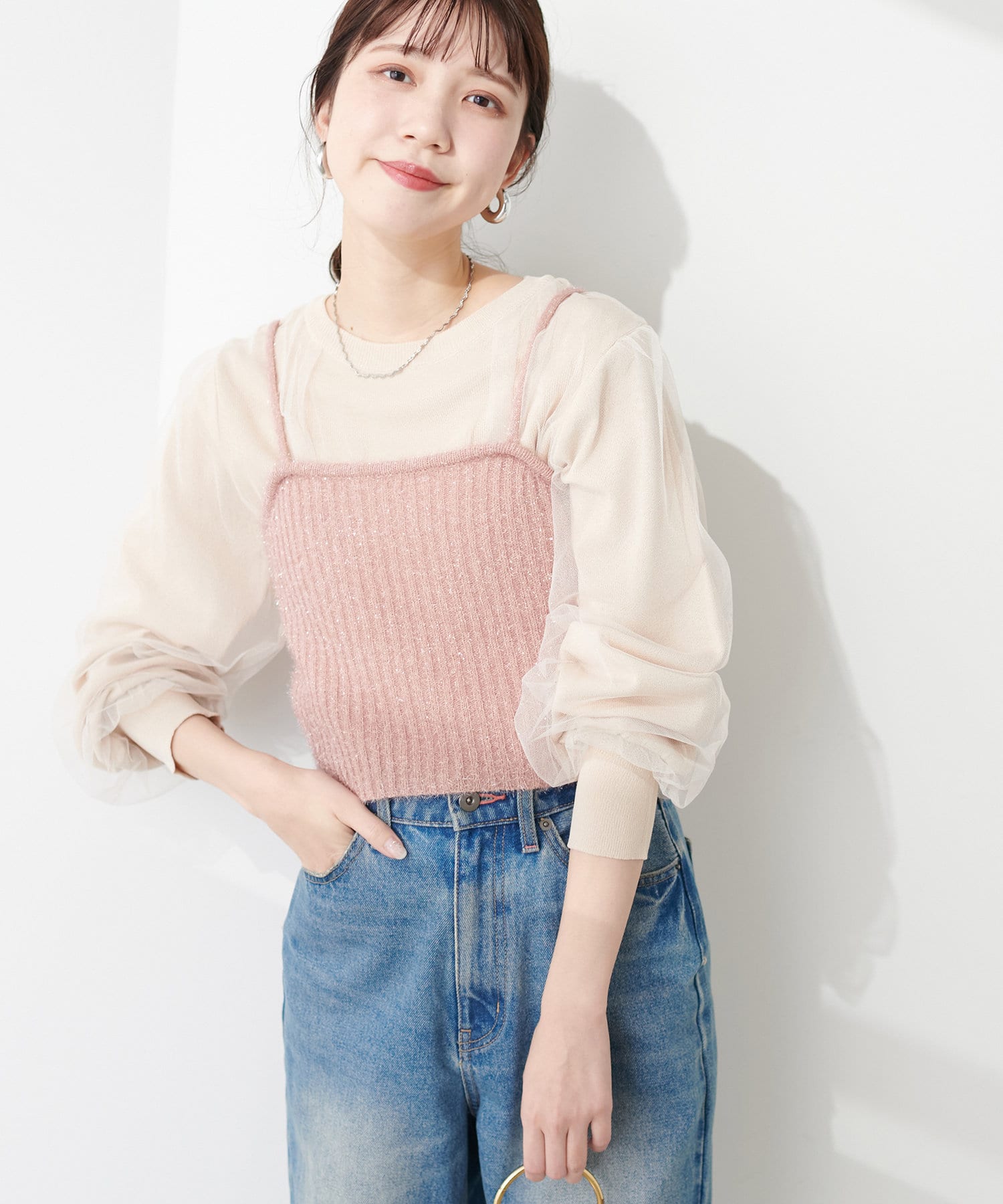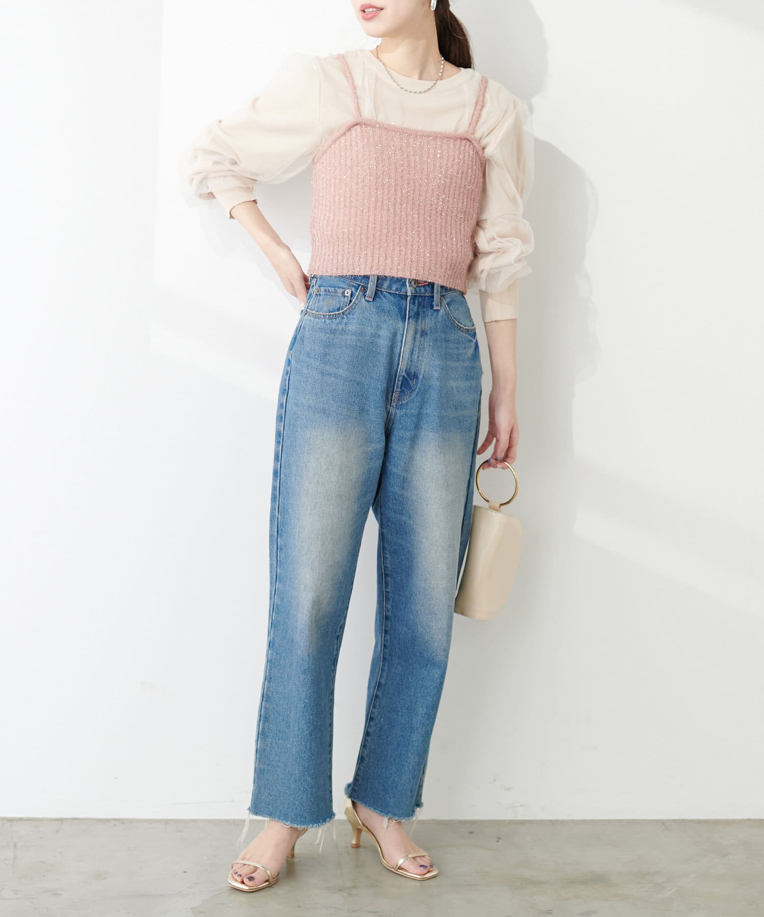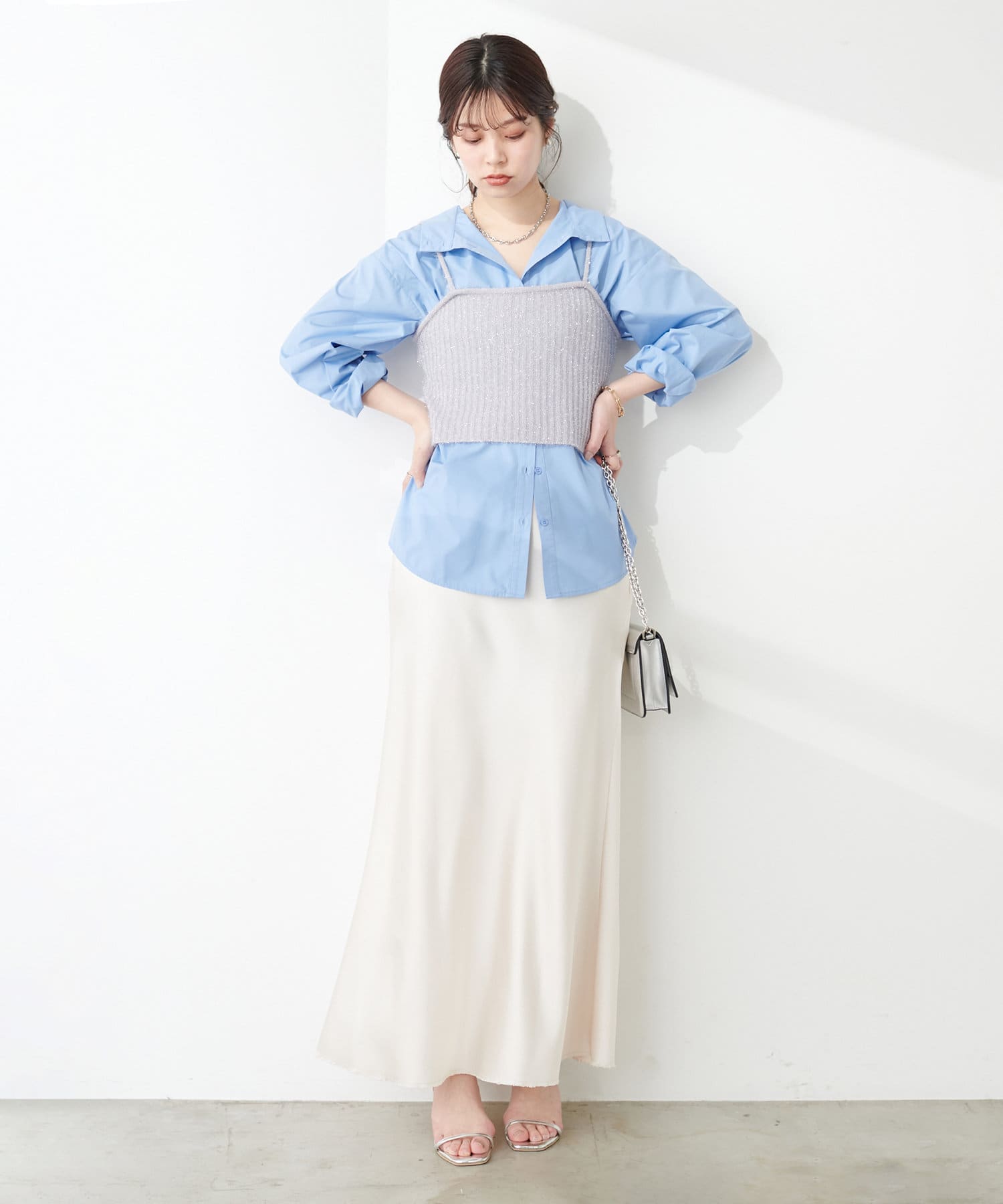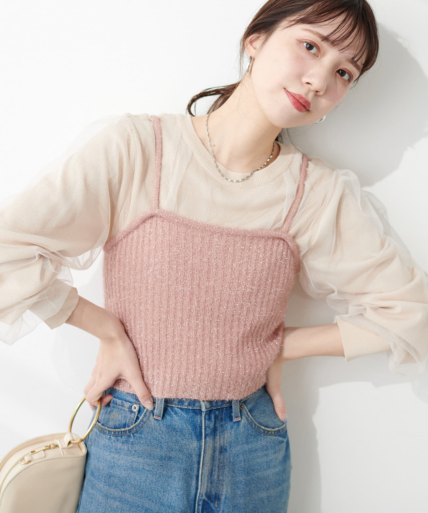 シリーズのラメファンシーヤーン前後2WAYカーディガンと合わせてセットアップでお召し頂くと、より華やかでトレンドライクな印象に。
