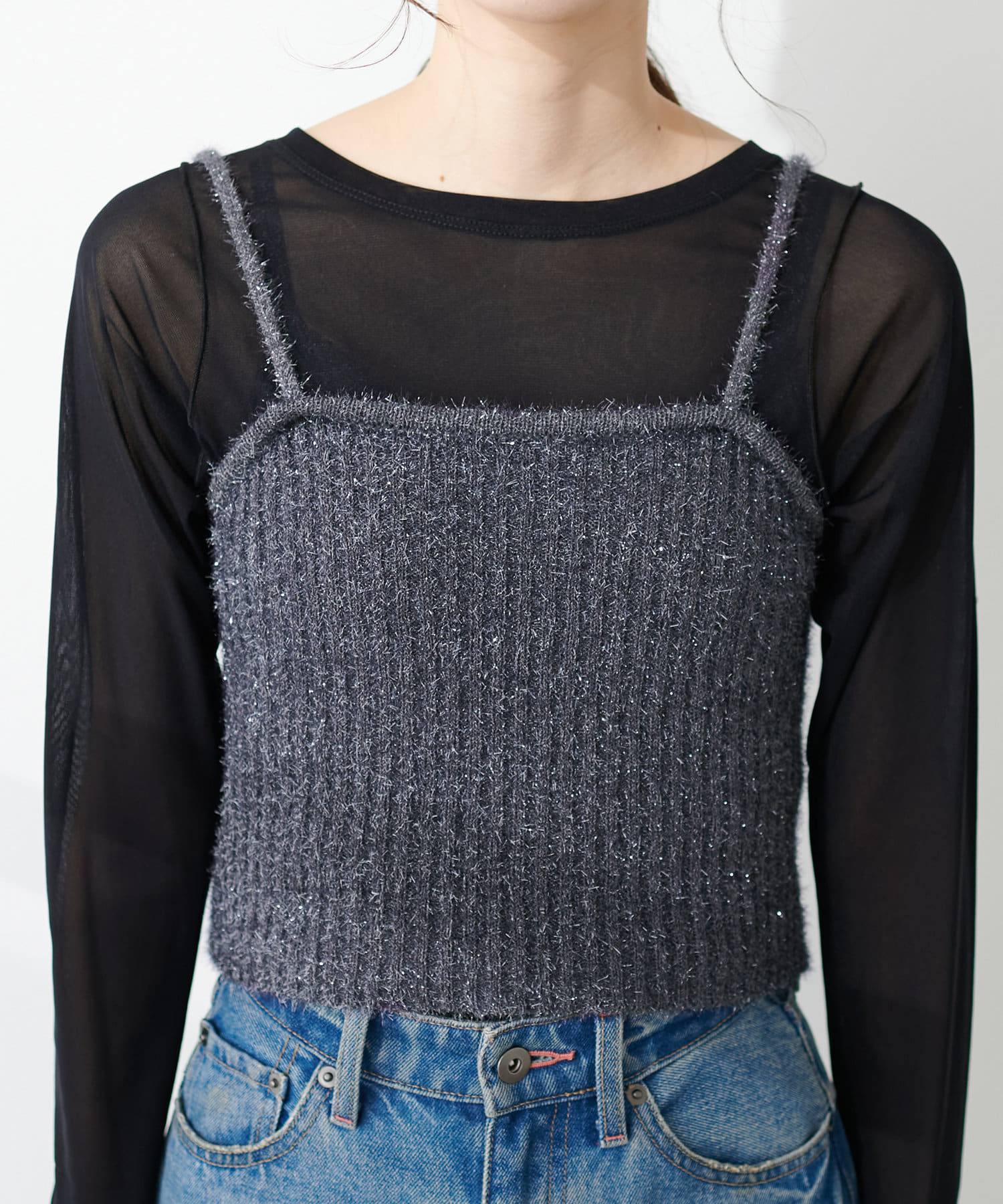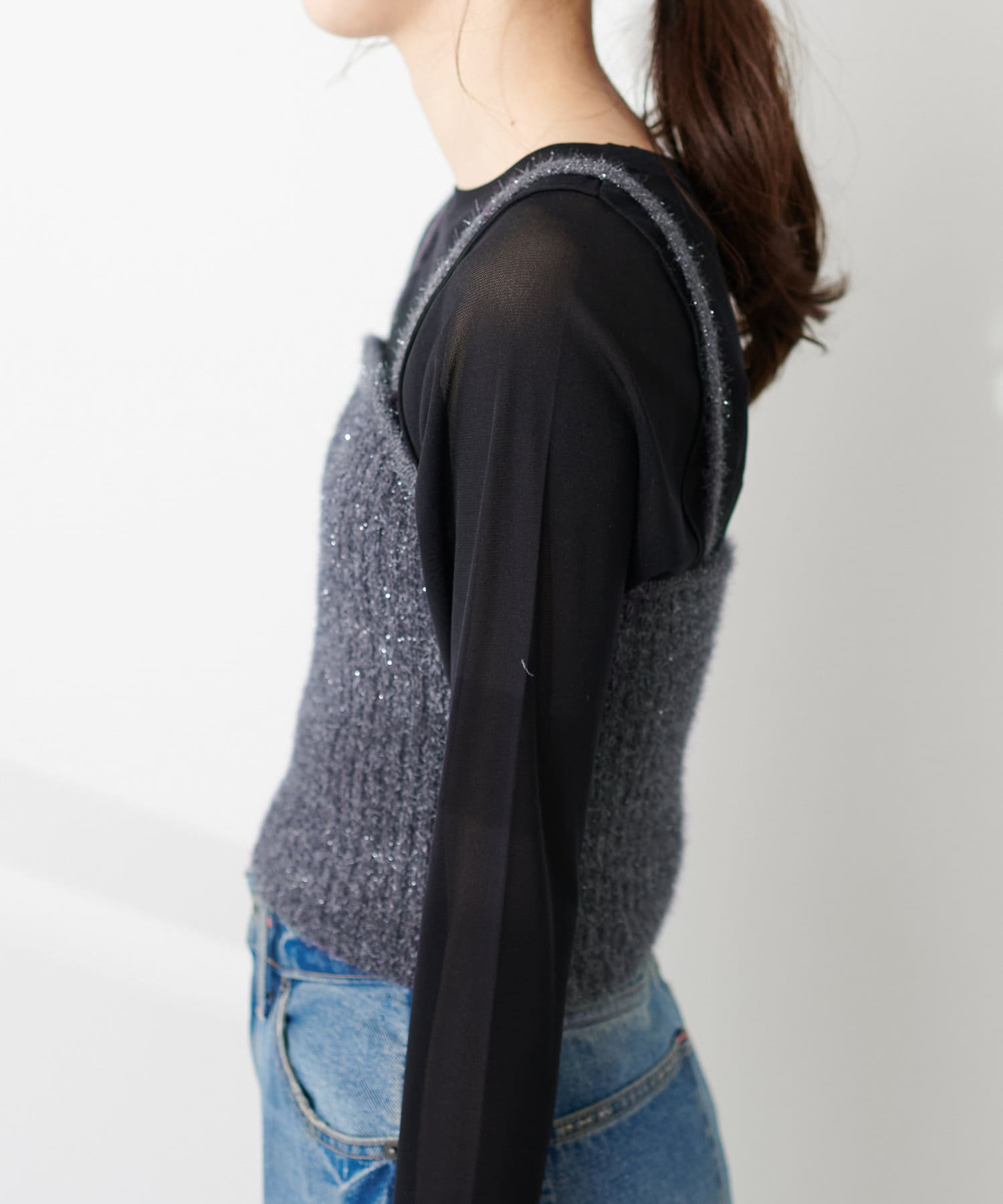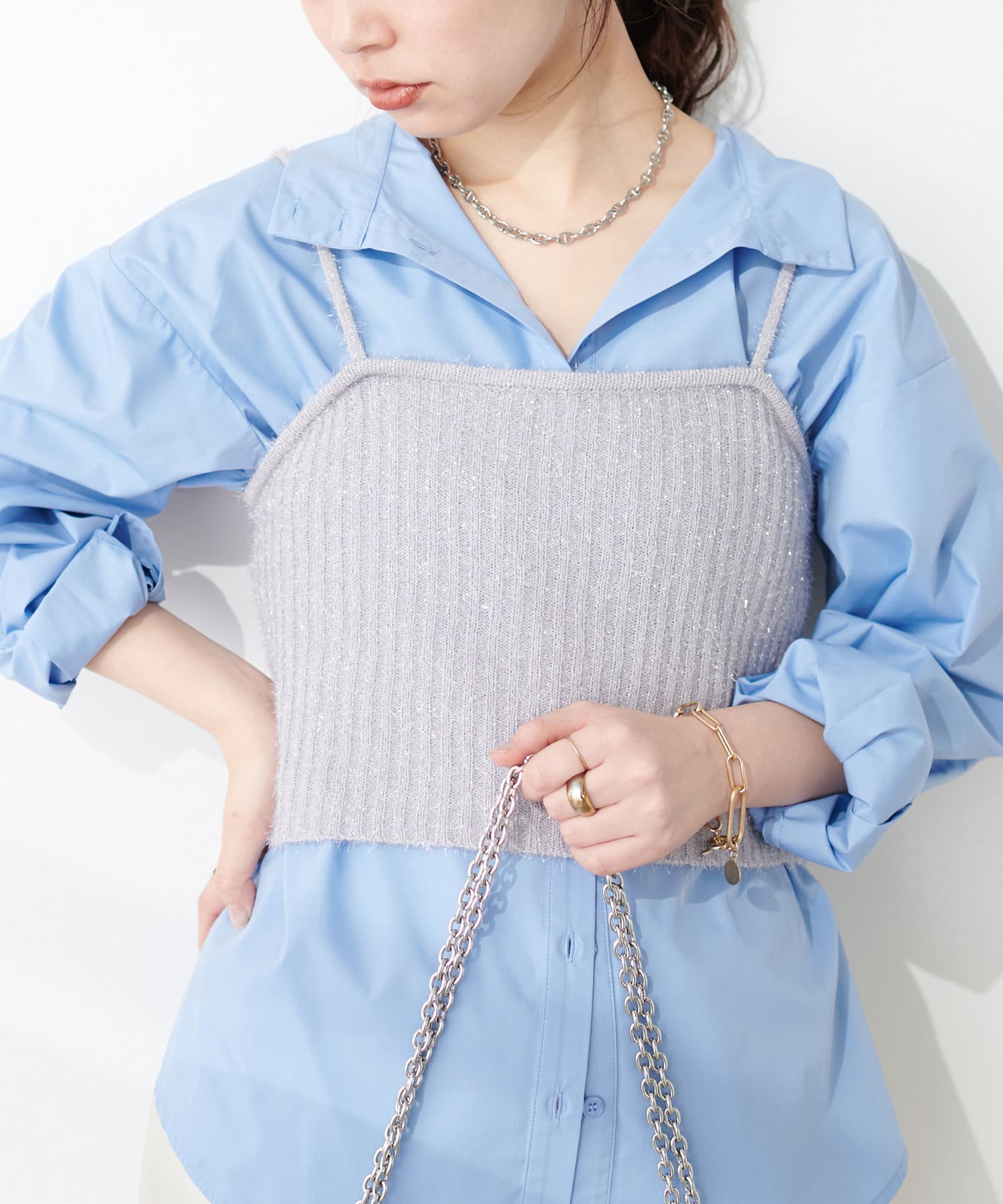 存在感のあるラメフィルムとファンシーヤーンを組み合わせた華やかな雰囲気のビスチェ。