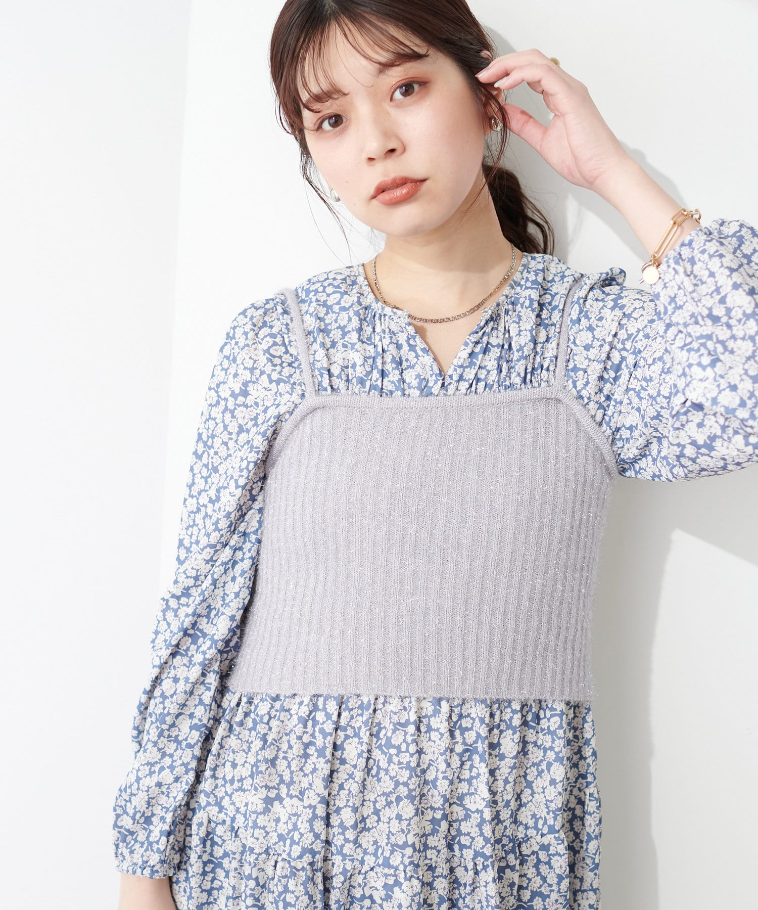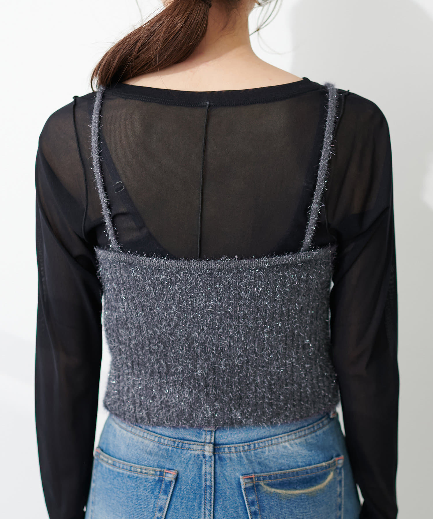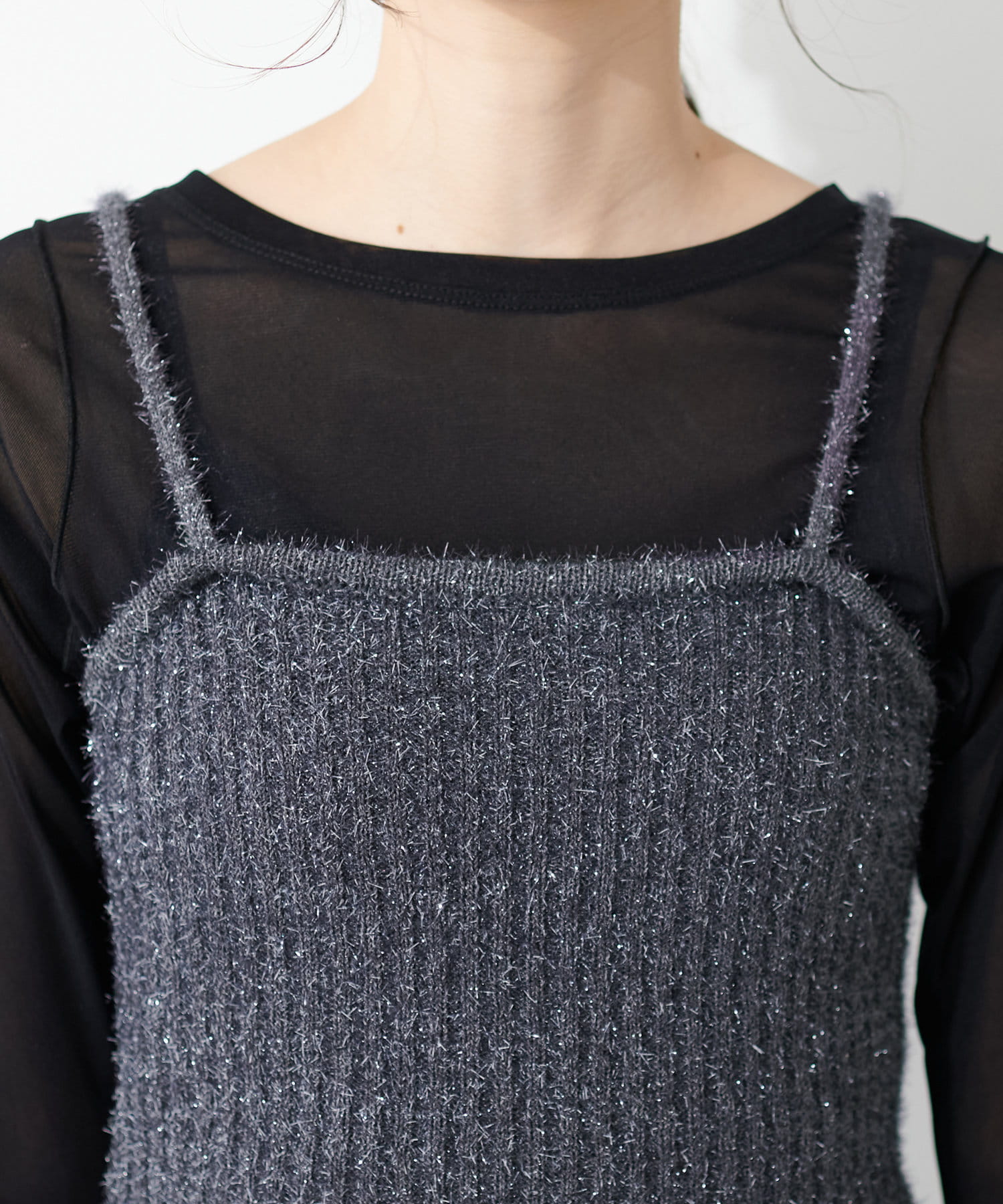 存在感のあるラメフィルムとファンシーヤーンを組み合わせた華やかな雰囲気のビスチェ。