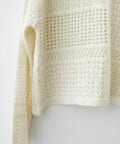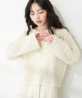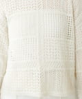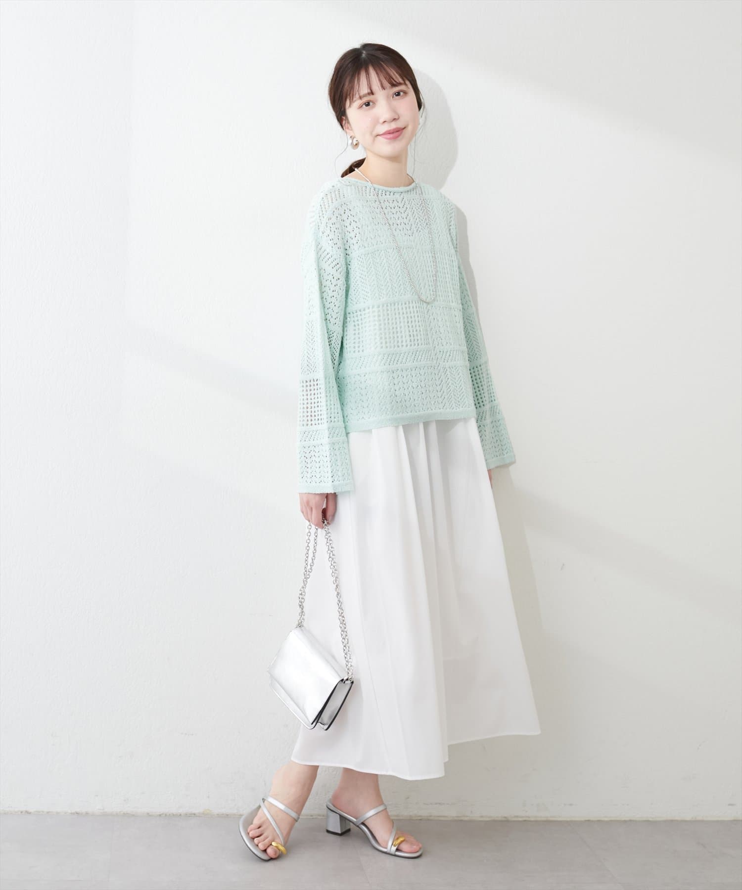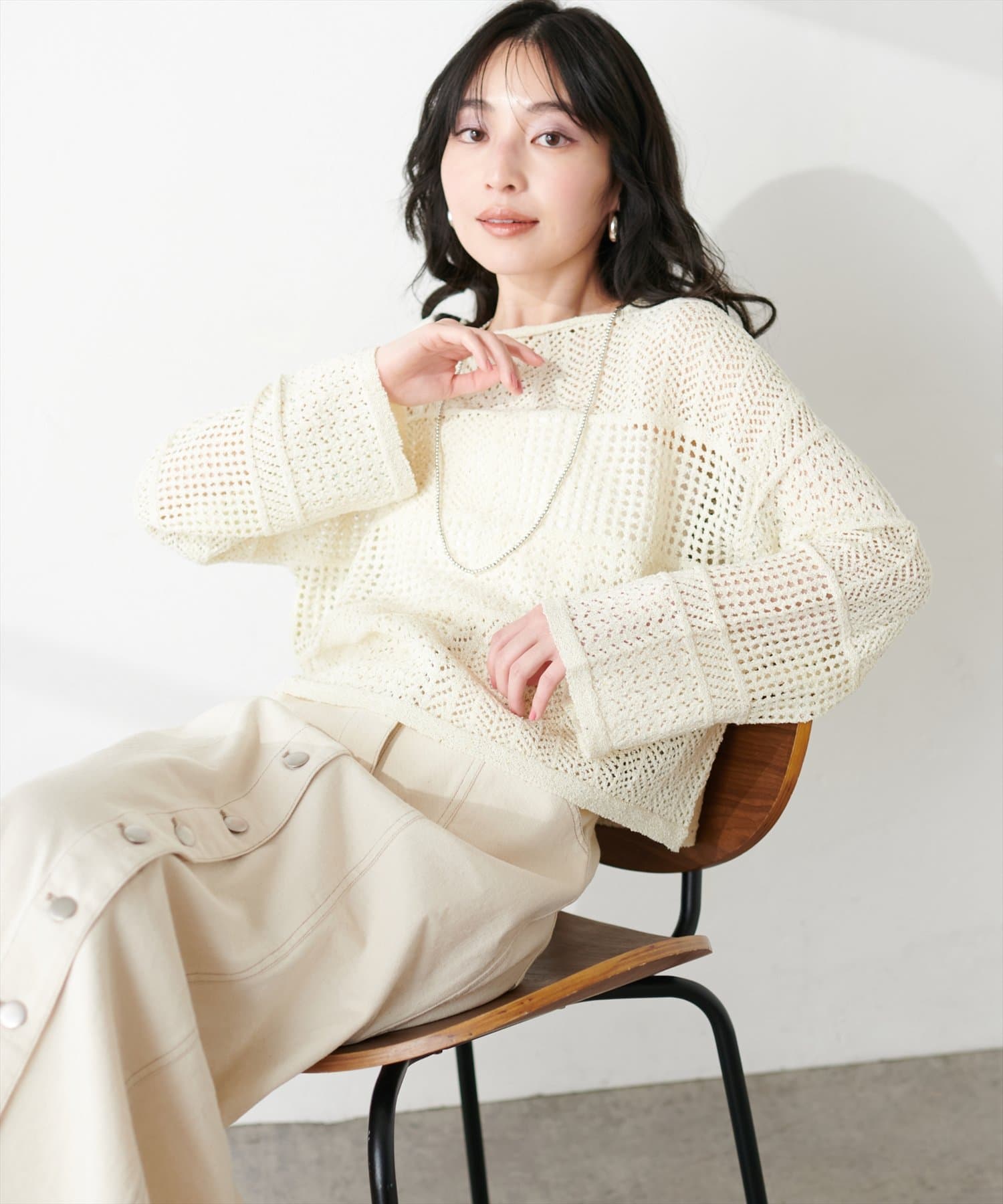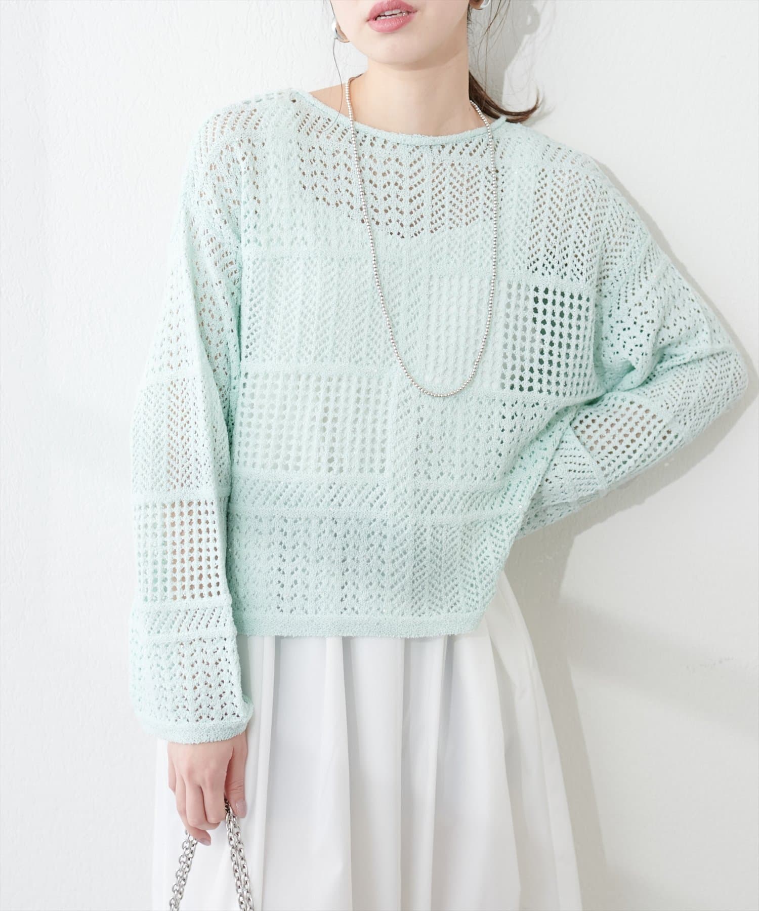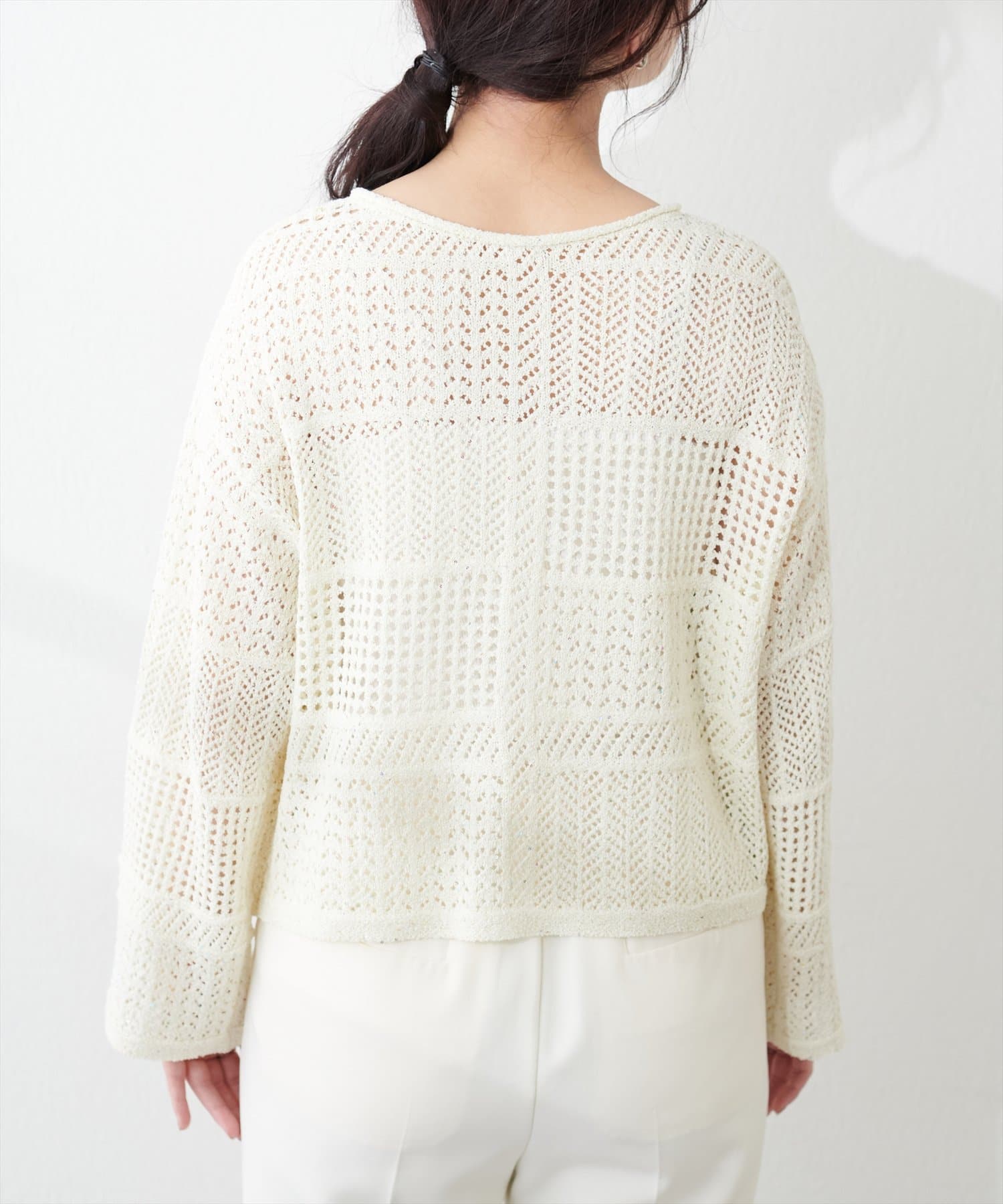 パッチワークの表情豊かな透かし編みが春のスタイリングに抜け感をプラス。